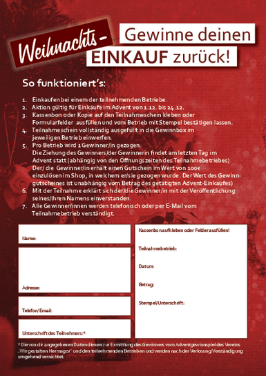 Von 1. bis 24. Dezember hast du die Chance, bei jedem Einkauf in einem der teilnehmenden Hermagorer Betriebe einen 100-Euro-Gutschein zu gewinnen!