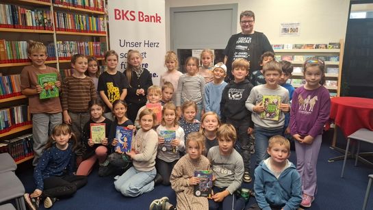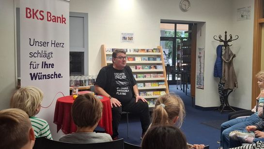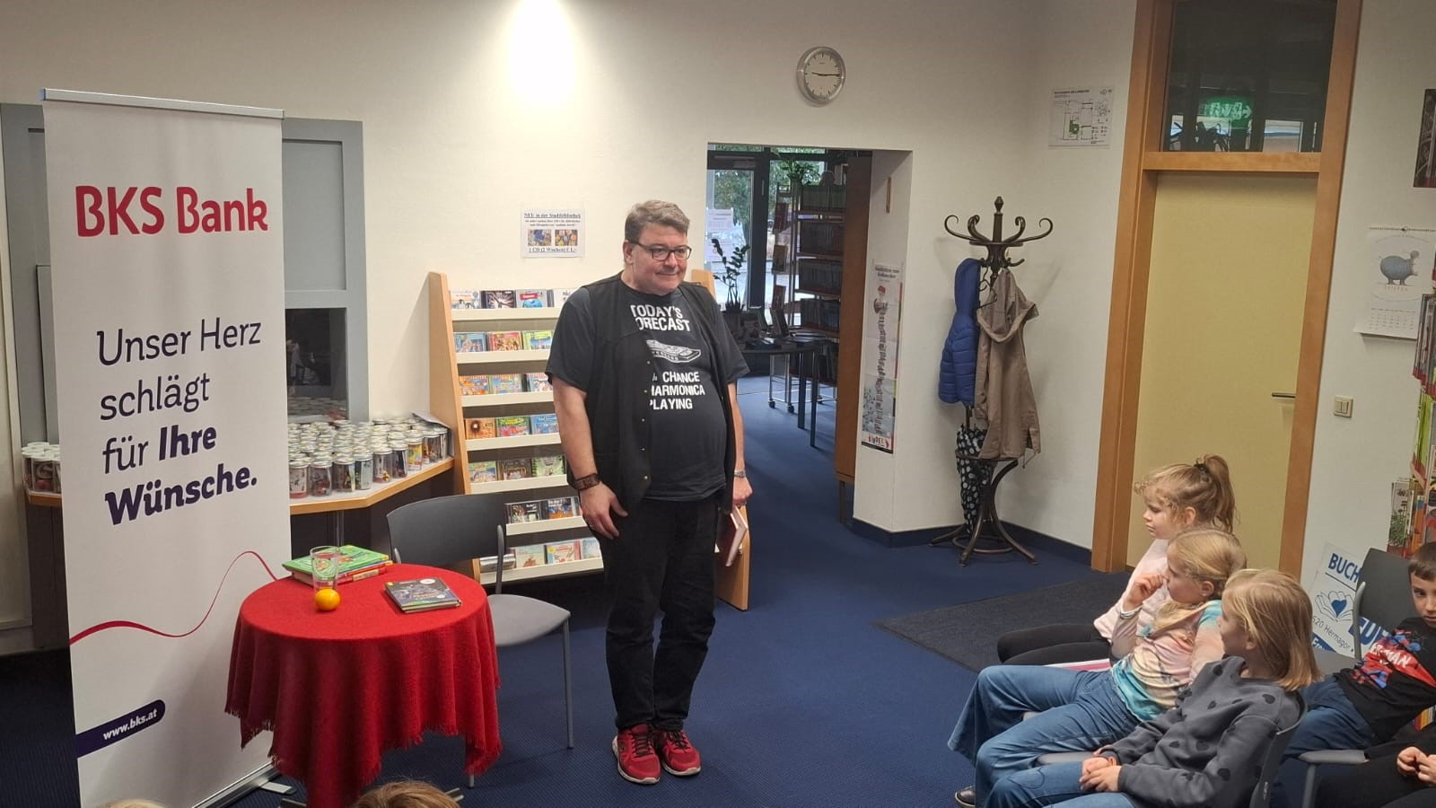 Die beiden 2. und die beiden 3. Klassen der VS Hermagor waren geladen, um den Worten des leidenschaftlichen Vorlesers und Geschichtenerzählers Christoph Mauz zu lauschen. Der 1971 in Wien geborene Kinder- und Jugendbautor, der bereits über 35 Bücher geschrieben hat, ist ein Vorleser mit Leib und Seele und sorgte mit seiner Art des Vortragens für Begeisterung.