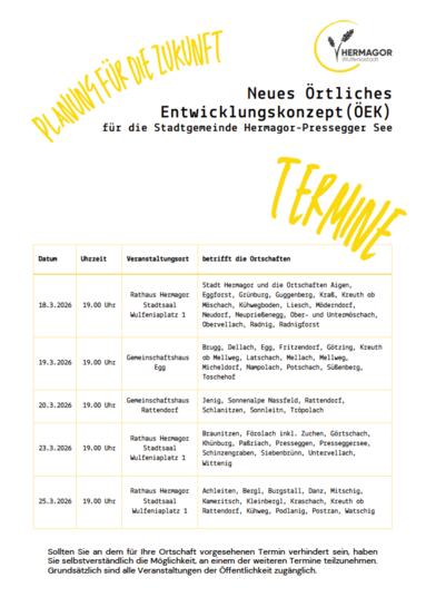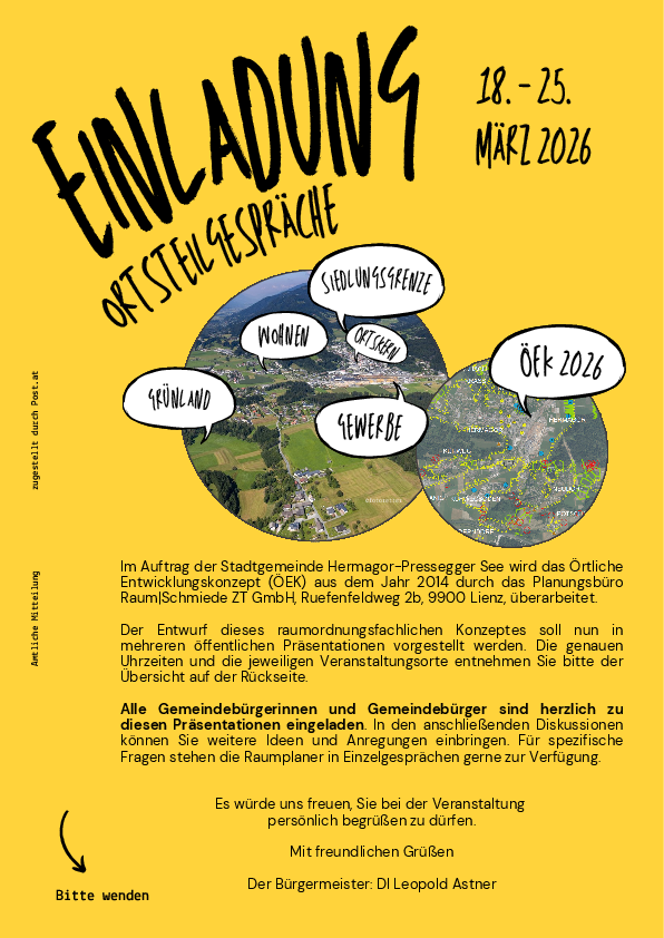 Im Auftrag der Stadtgemeinde Hermagor-Pressegger See wird das Örtliche Entwicklungskonzept (ÖEK) aus dem Jahr 2014 durch das Planungsbüro Raum|Schmiede ZT GmbH, Ruefenfeldweg 2b, 9900 Lienz, überarbeitet.