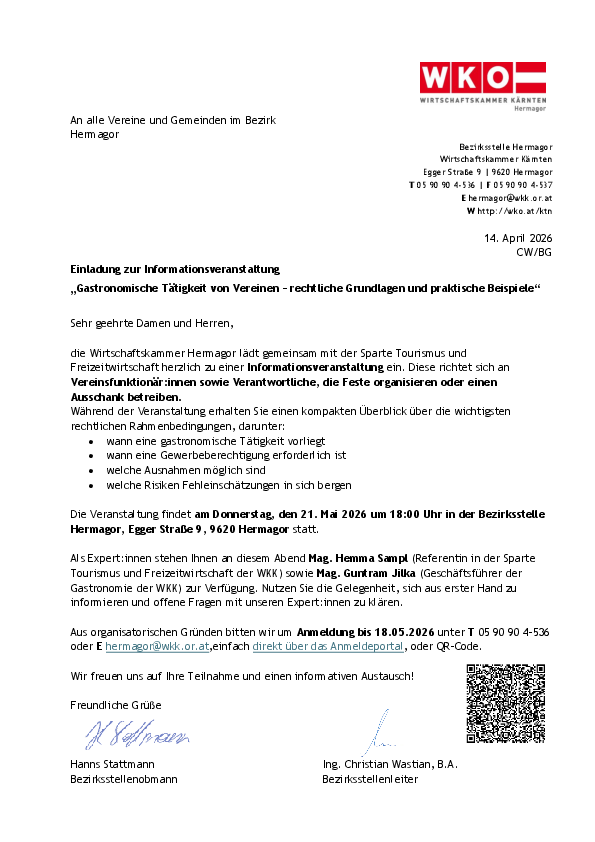 Die Wirtschaftskammer Hermagor lädt gemeinsam mit der Sparte Tourismus und Freizeitwirtschaft herzlich zu einer Informationsveranstaltung ein. Diese richtet sich an Vereinsfunktionär:innen sowie Verantwortliche, die Feste organisieren oder einen Ausschank betreiben.