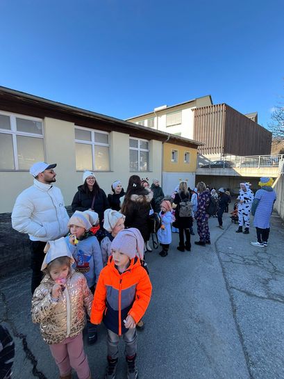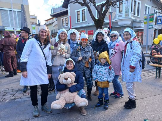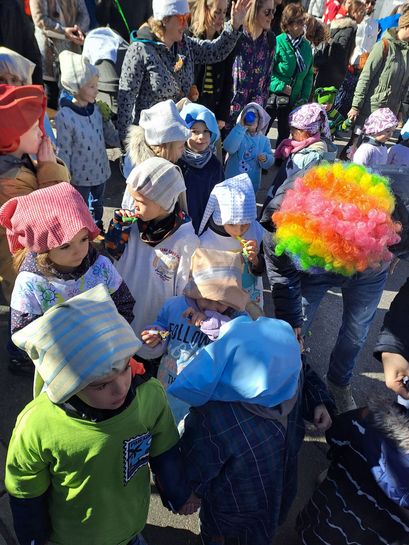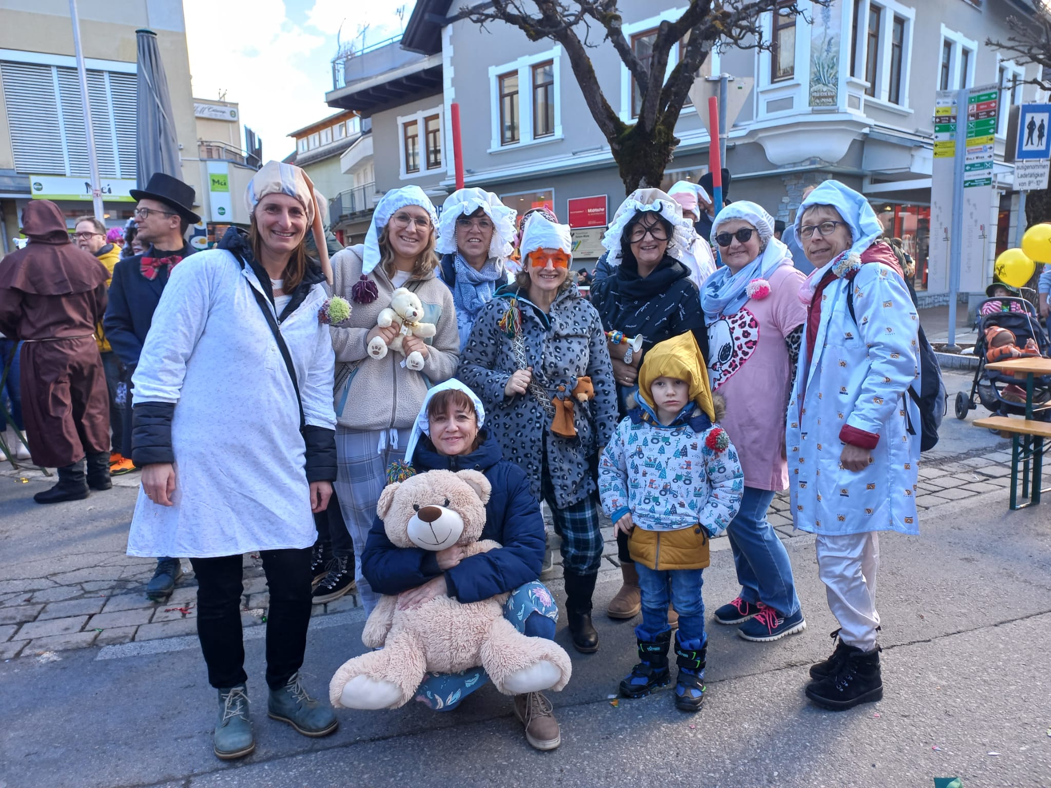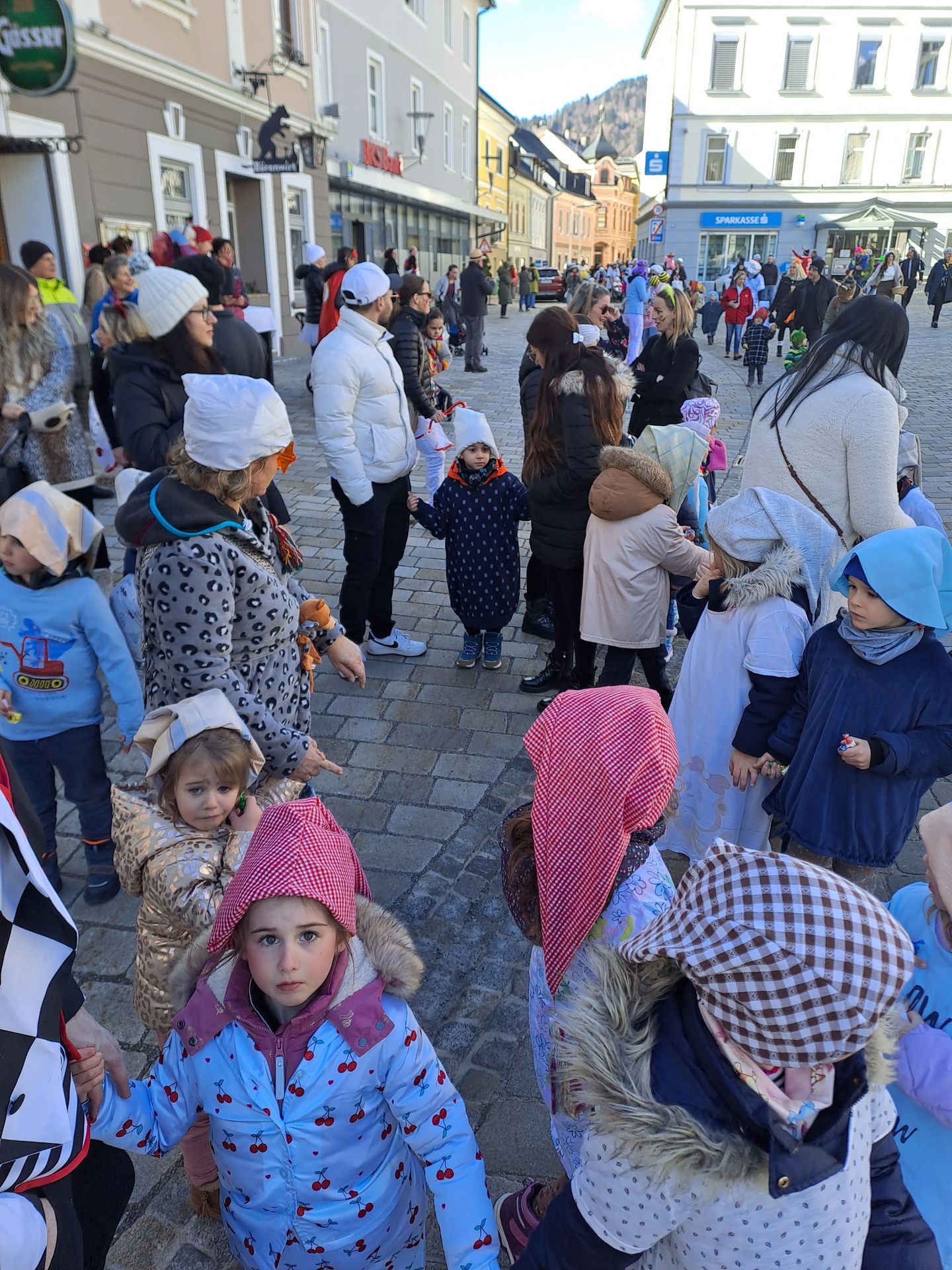 Heuer verkleideten wir uns alle als Schlafmützen. Eine Gugga-Musik aus Italien begleitete uns vom Kindergarten bis zum Gasserplatz. Alle Schüler der MMS, der Volksschule Hermagor, aus Fritzendorf und die Unterstufe nahmen am Umzug teil