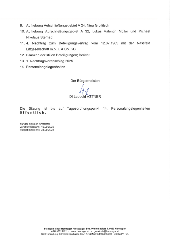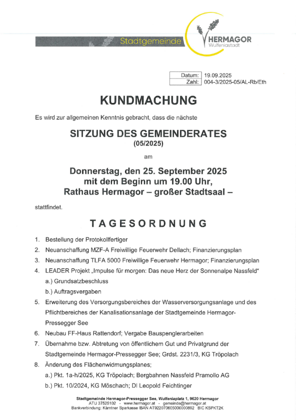 Die nächste Sitzung des Gemeinderates findet am Donnerstag, dem 25. September 2025, mit dem Beginn um 19:00 Uhr im Stadtsaal Hermagor statt.
