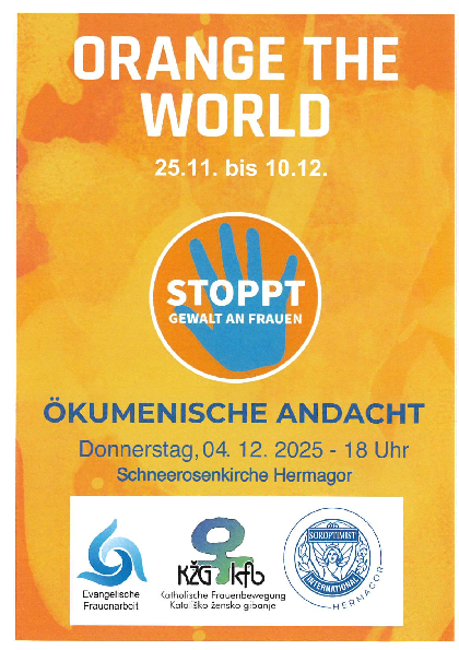 Orange the world - Stoppt die Gewalt an Frauen - findet vom 25.11. - 10.12. statt. Die ökumenische Andacht wird am Donnerstag, dem 04.12.2025 um 18 Uhr in der Schneerosenkirche in Hermagor abgehalten.