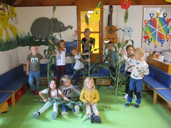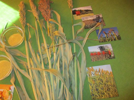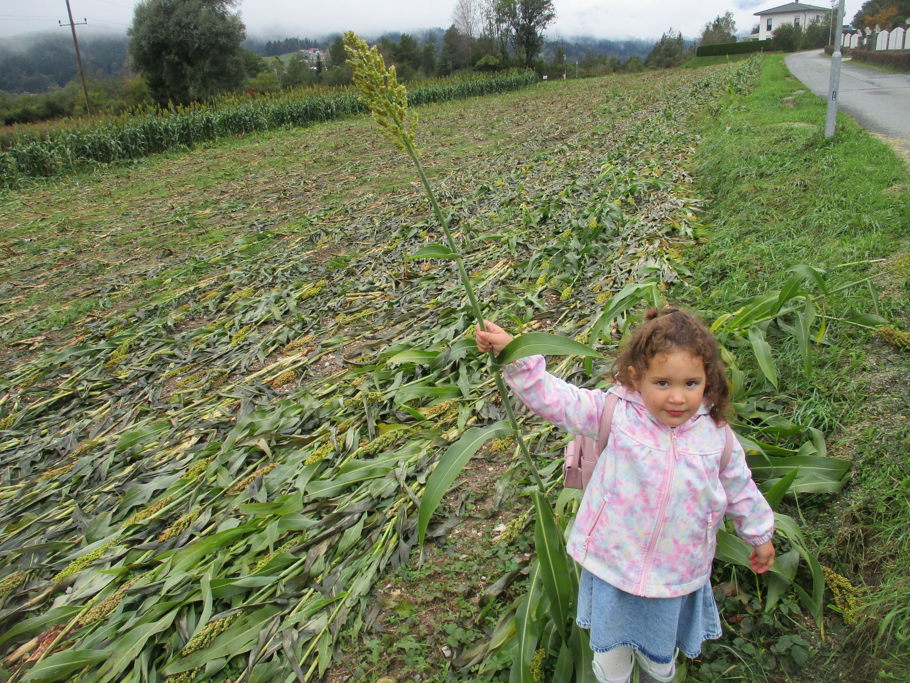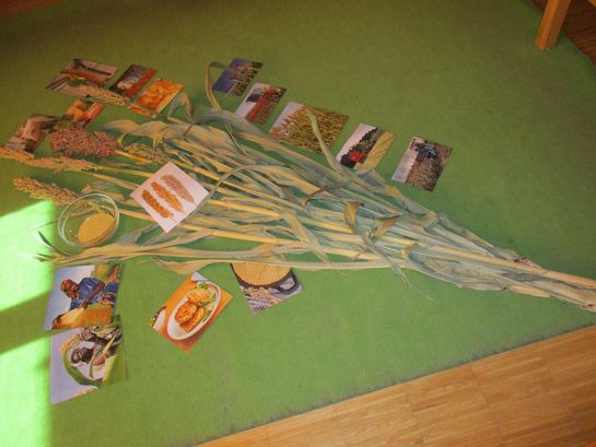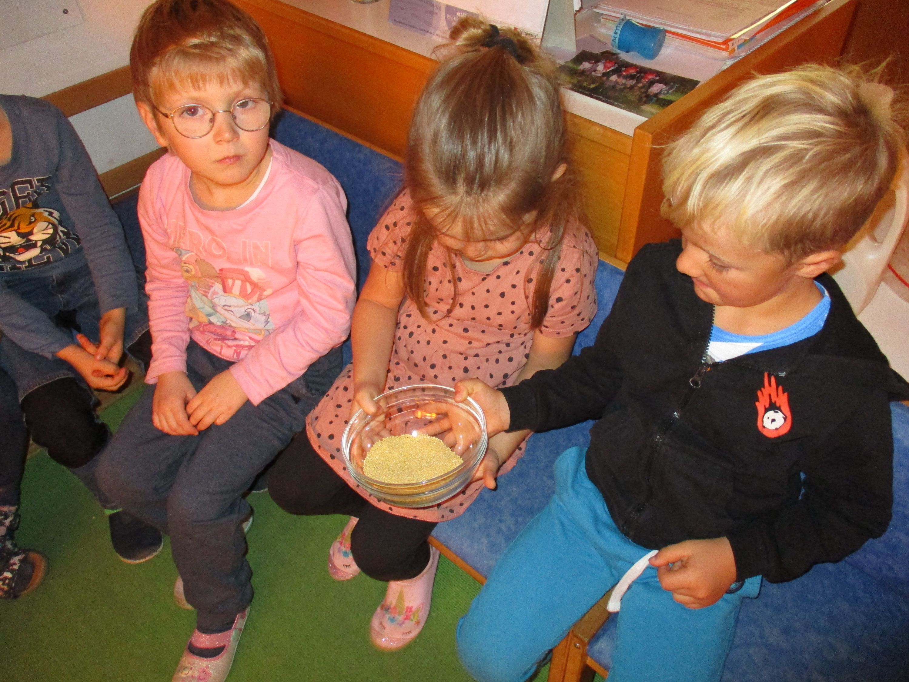 Bei einem Spaziergang trafen die Kinder auf ein Hirsefeld und waren sofort interessiert, da es nur dem Mais ähnelte. Alle Kinder kennen die sehr guten Hirselaibchen aus der Kindergartenküche, wussten jedoch nicht, wie die Hirse wächst, aussieht, die Ernte abläuft, in anderen Kulturen verwendet wird, als Futtermittlel dient und sehr anpassungsfähig bei Trockenheit ist. Diese Neugier und das Interesse galt es zu stillen.