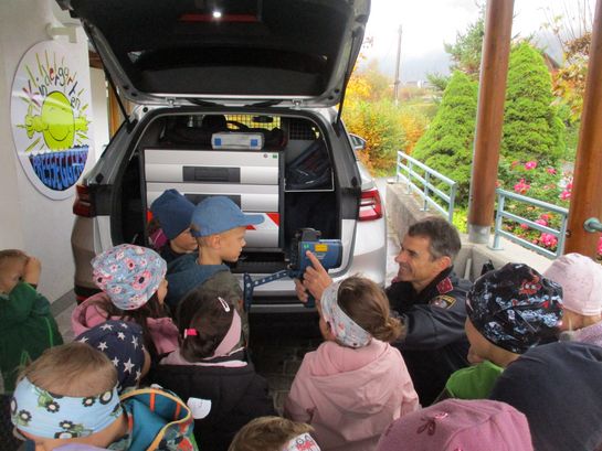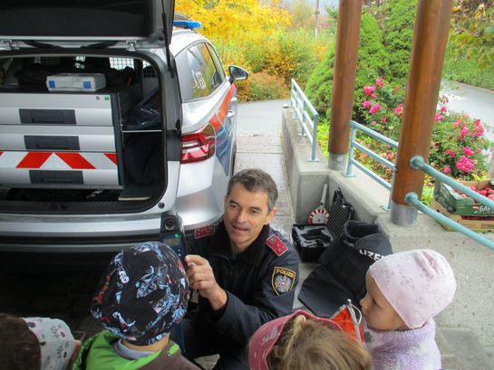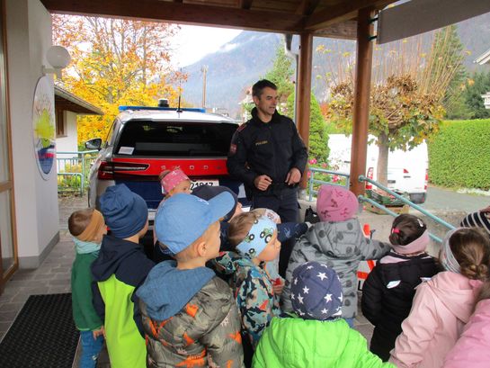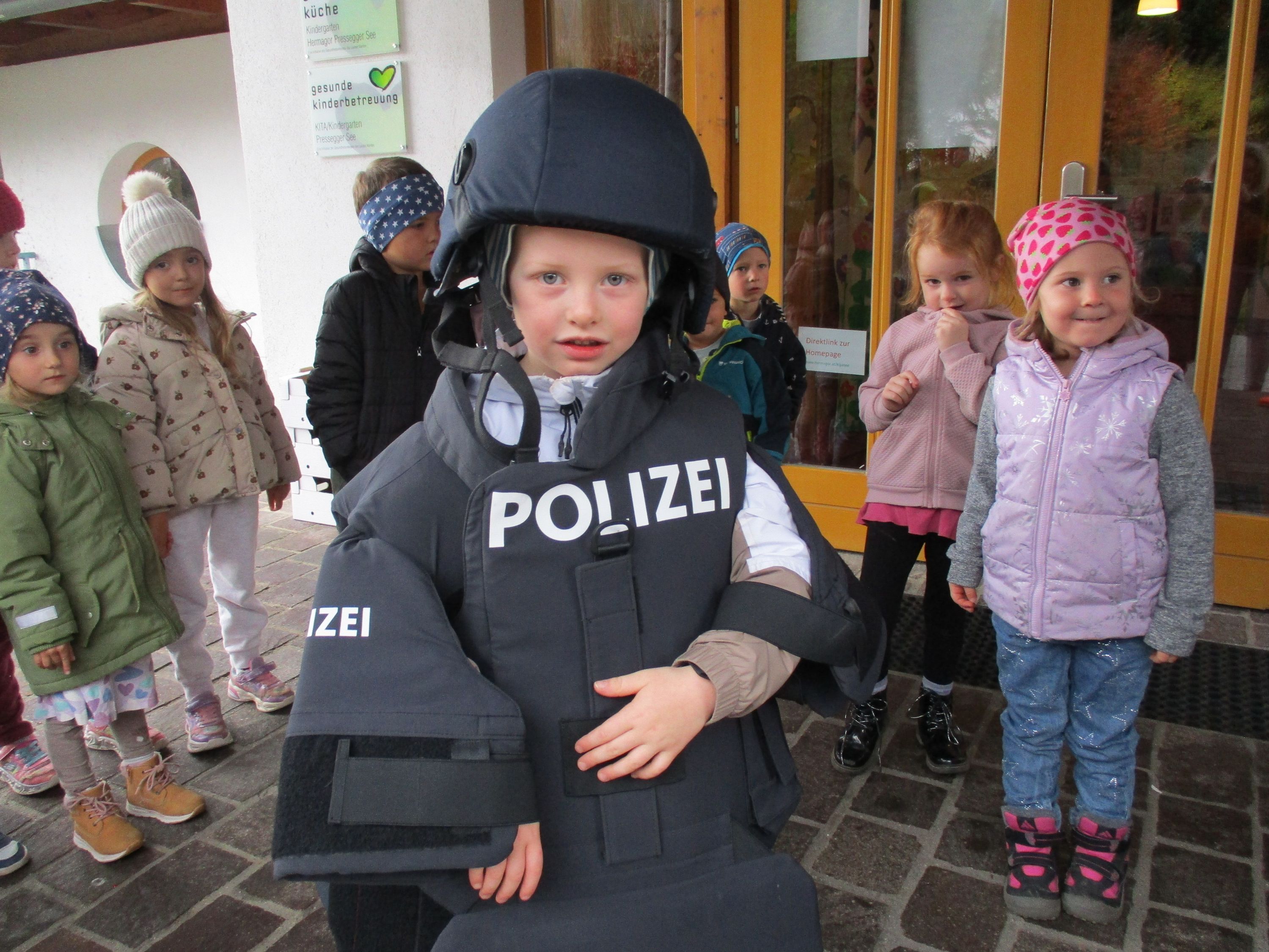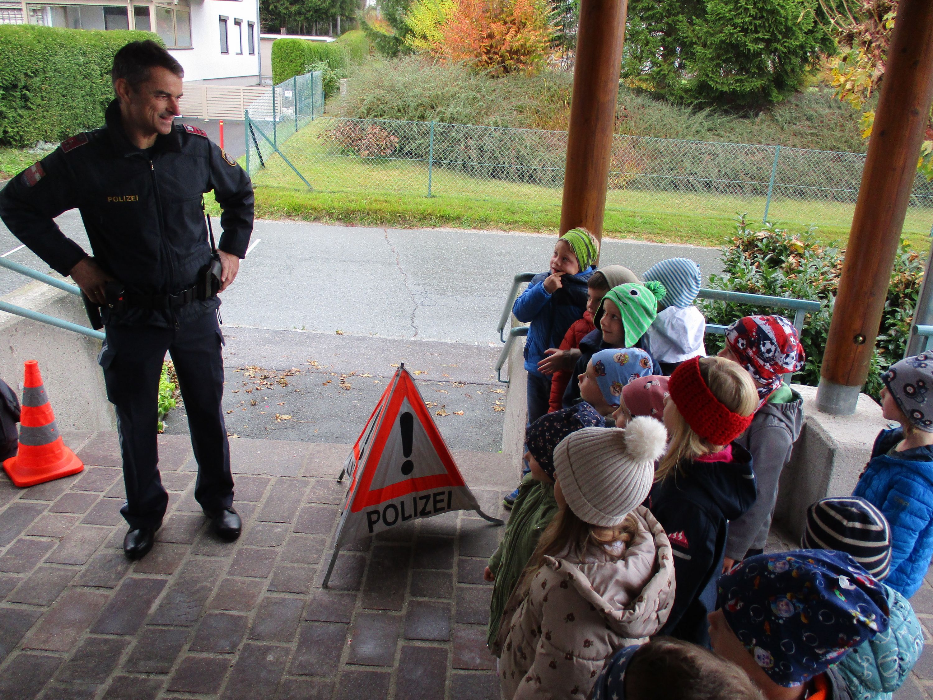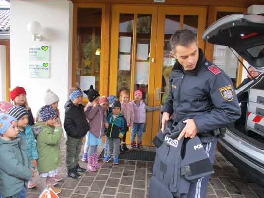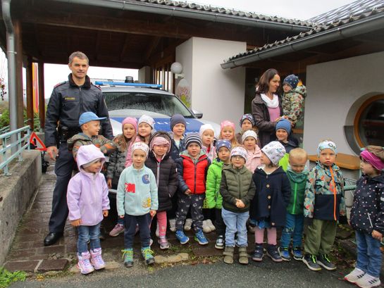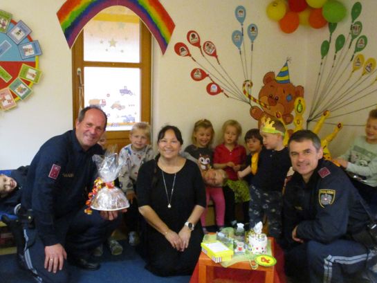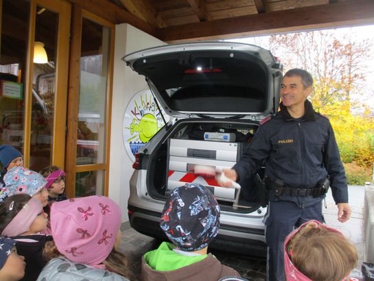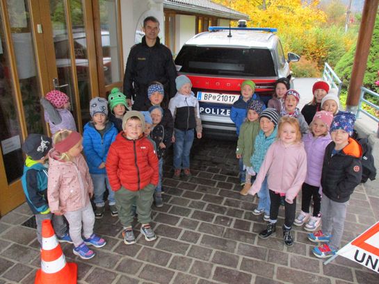 Von der Polizeiinspektion St.Stefan/Gail besuchten die Polizisten Pacher und Lackner die Kinder im Kindergarten. Die wichtigsten Inhalte des spannenden Vormittags waren: Vertrauensbildung, Gefahrenbewusstsein, Prävention, Uniform mit Ausrüstung und die Erklärung des Einsatzwagens.