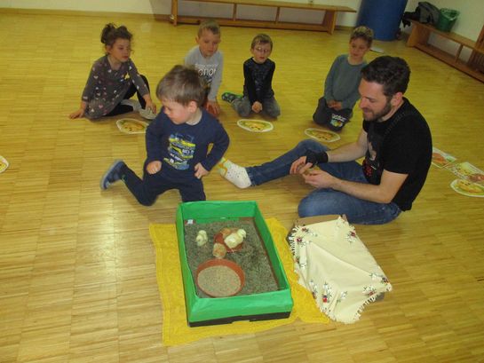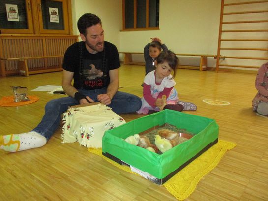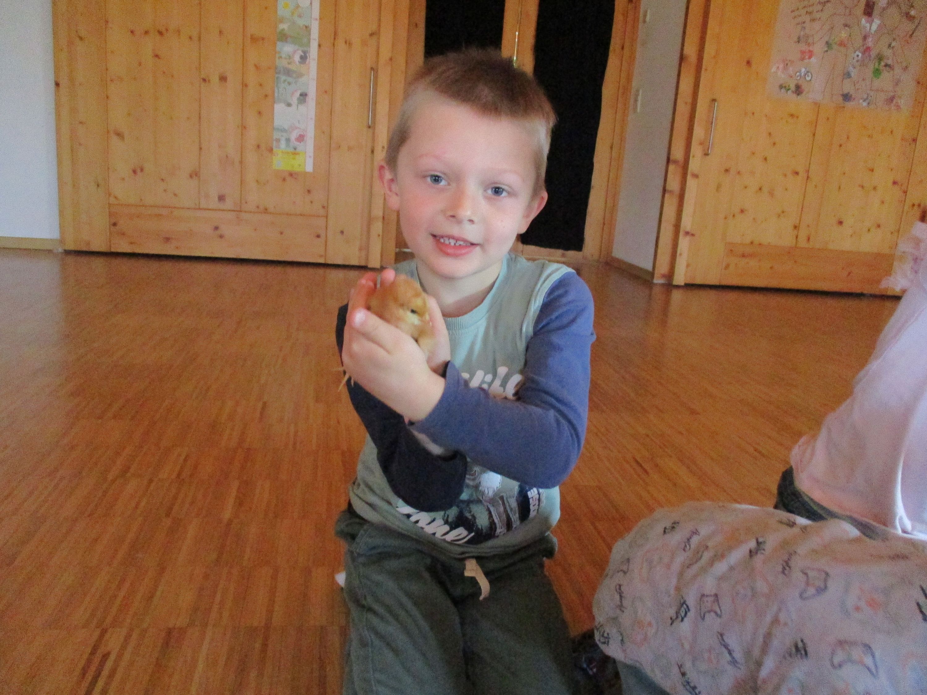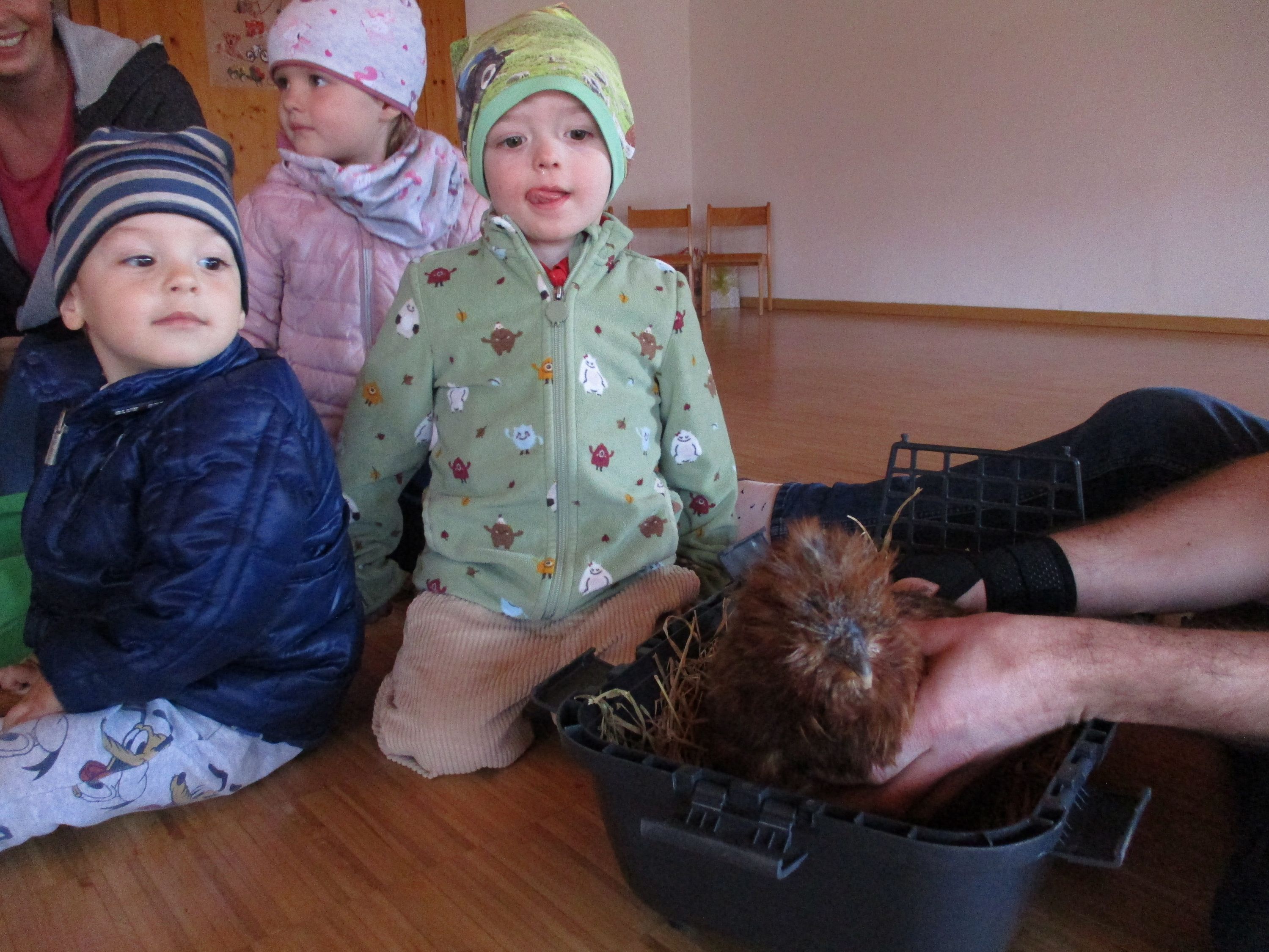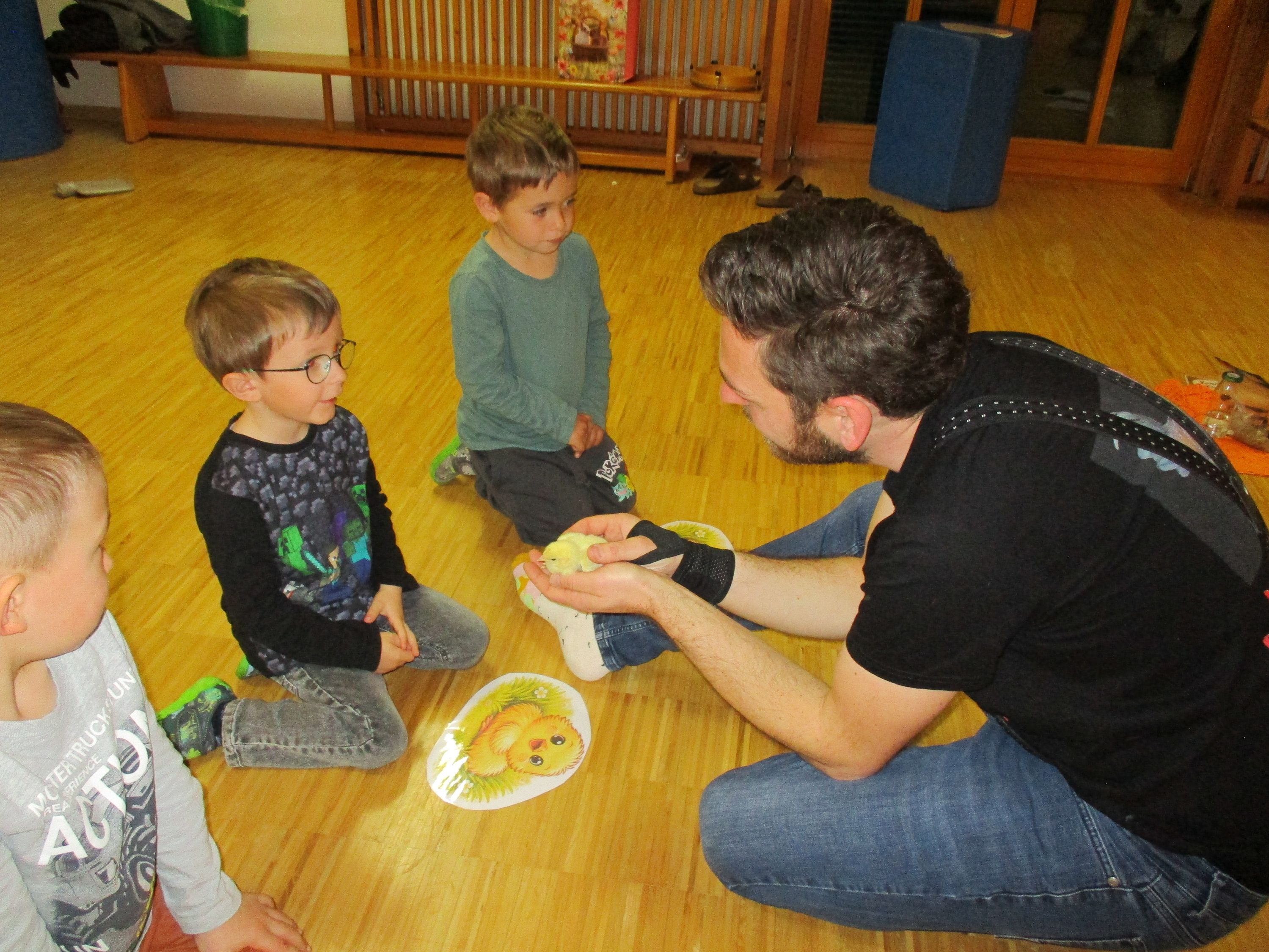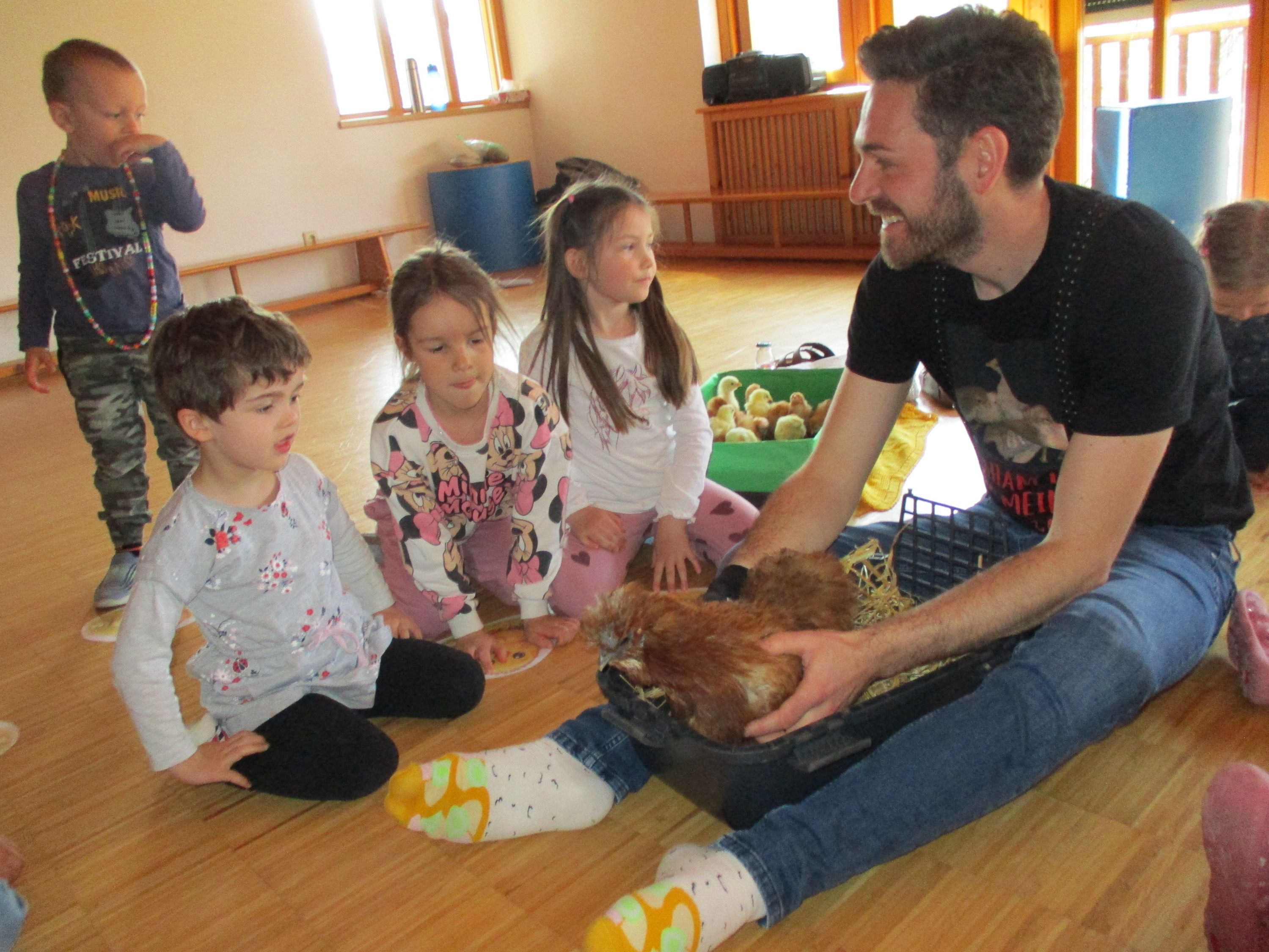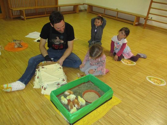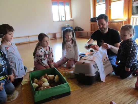 Für die Aufarbeitung des thematischen Schwerpunktes "Vom Ei zur Henne", besuchte Elementarpädagoge i.A. Bernd Stattmann die Bärengruppe. 15 Küken und eine Seidenhenne durften die Kinder streicheln, aufheben, betrachten, füttern und beobachten.