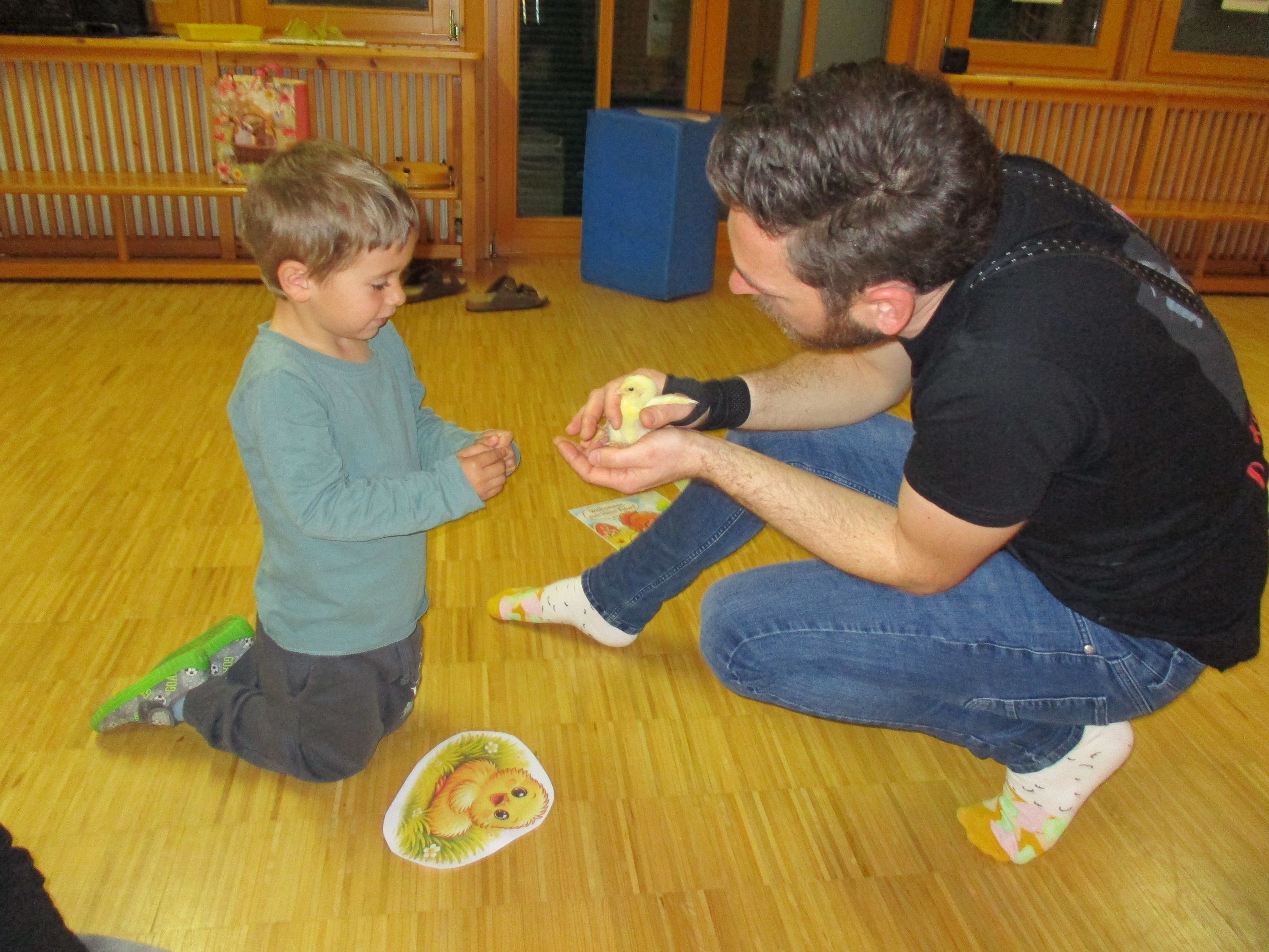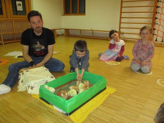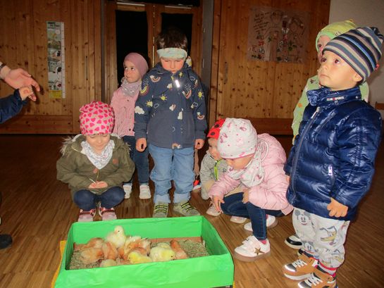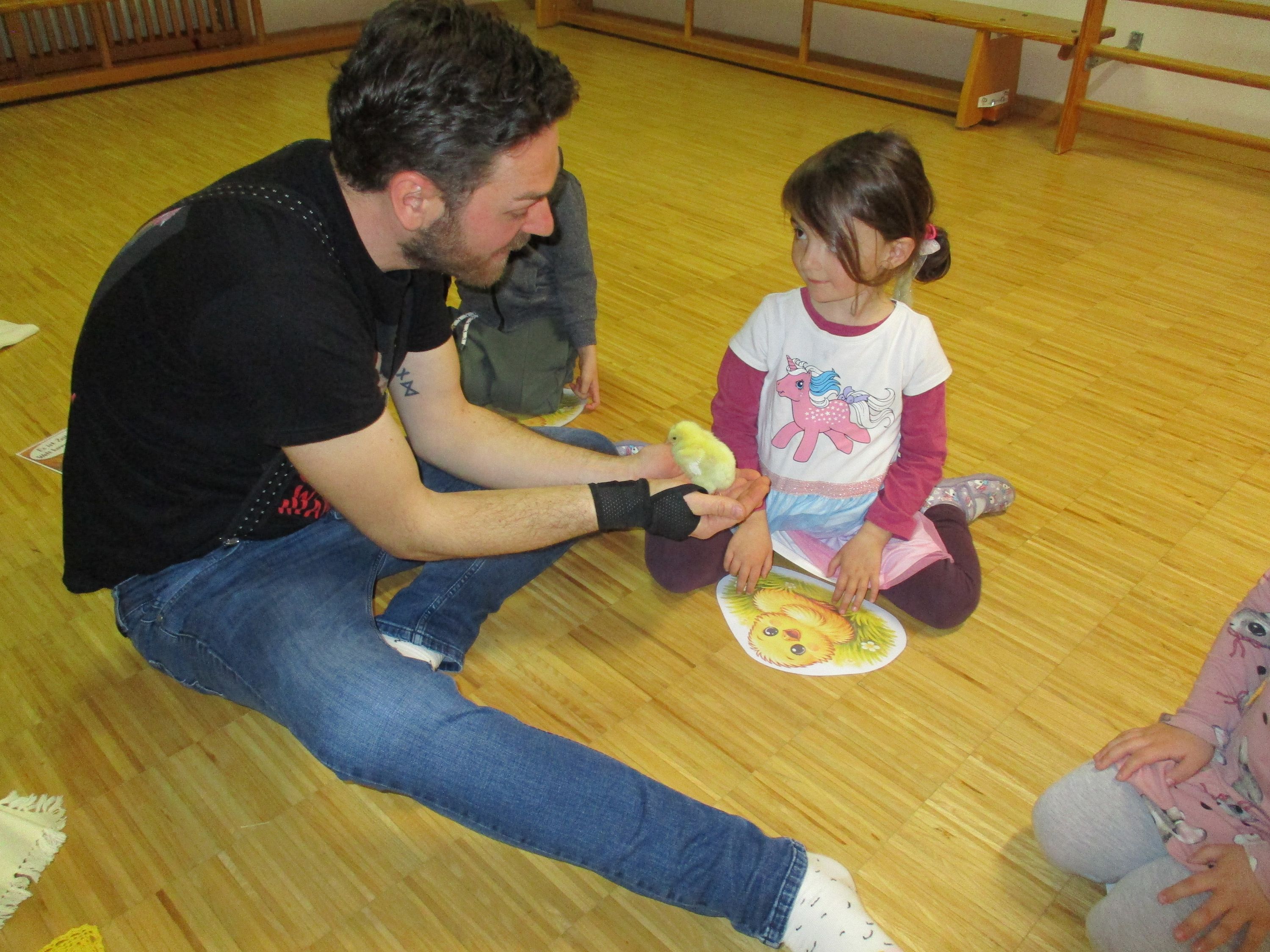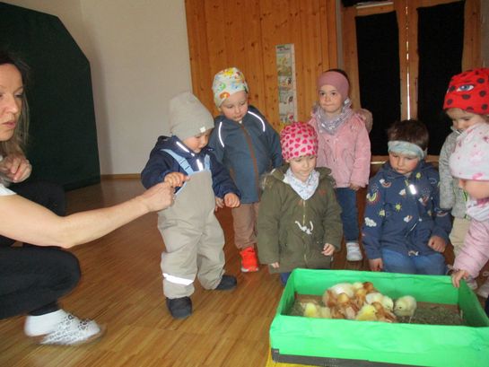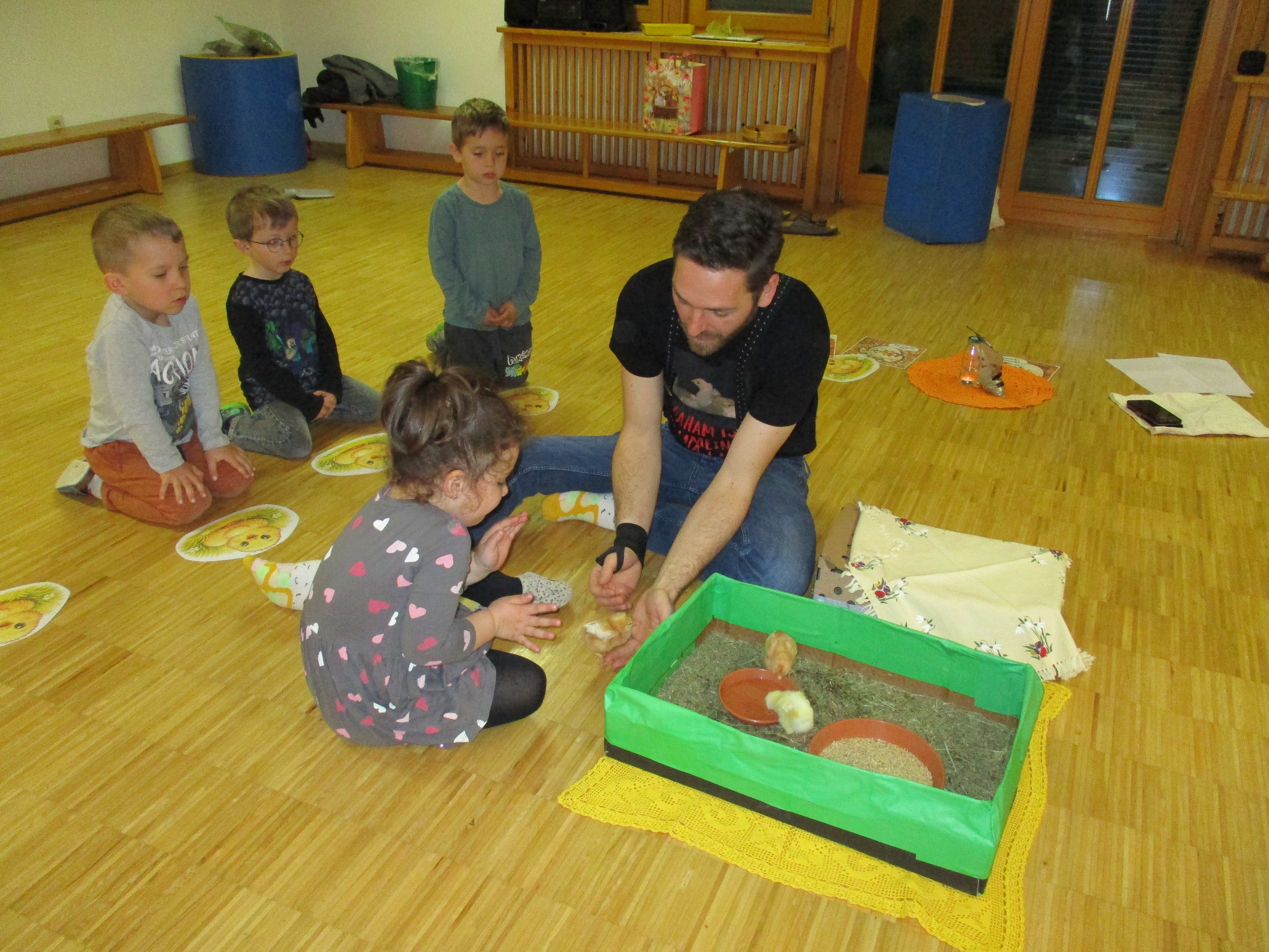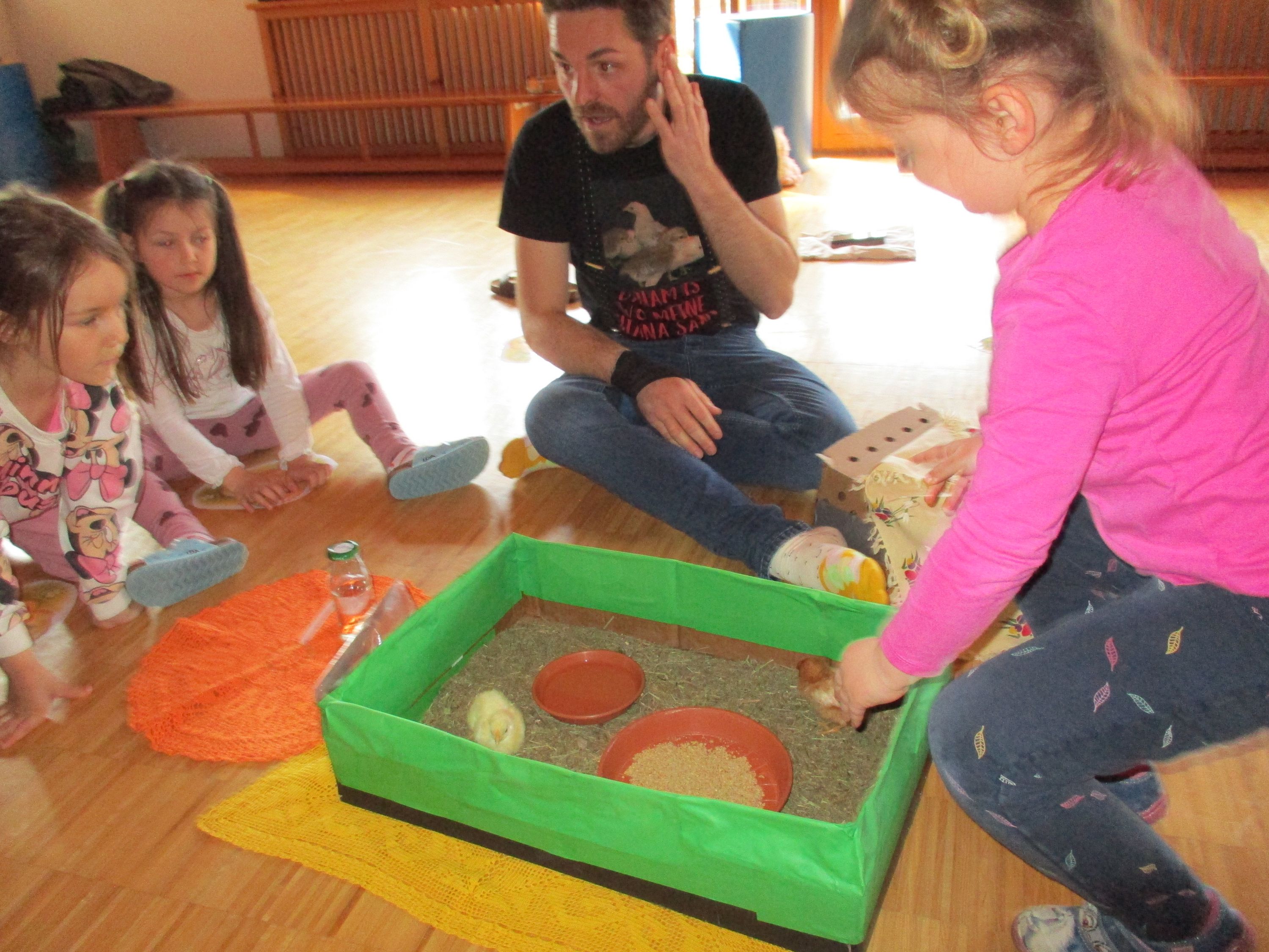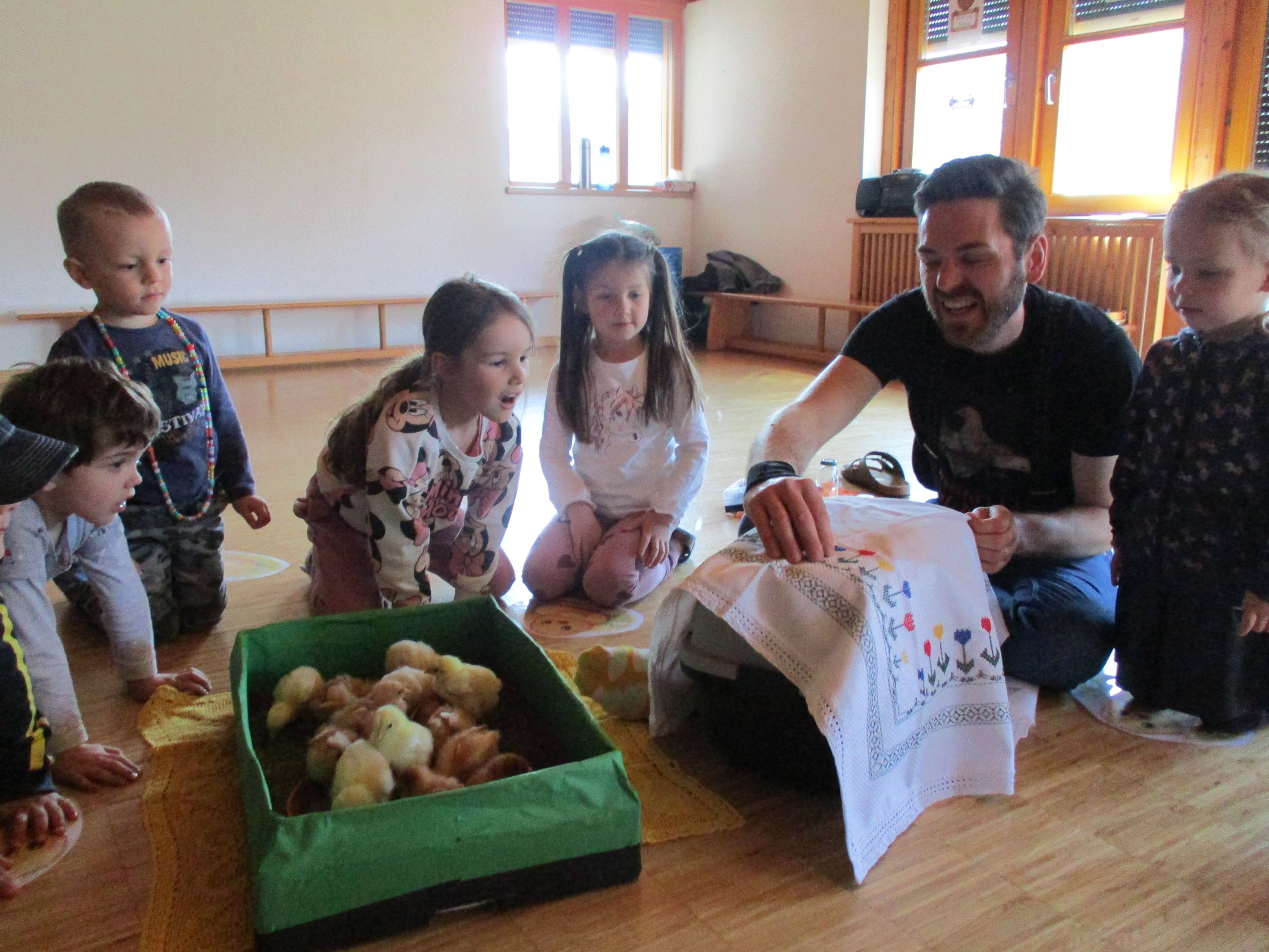 Für die Aufarbeitung des thematischen Schwerpunktes "Vom Ei zur Henne", besuchte Elementarpädagoge i.A. Bernd Stattmann die Bärengruppe. 15 Küken und eine Seidenhenne durften die Kinder streicheln, aufheben, betrachten, füttern und beobachten.