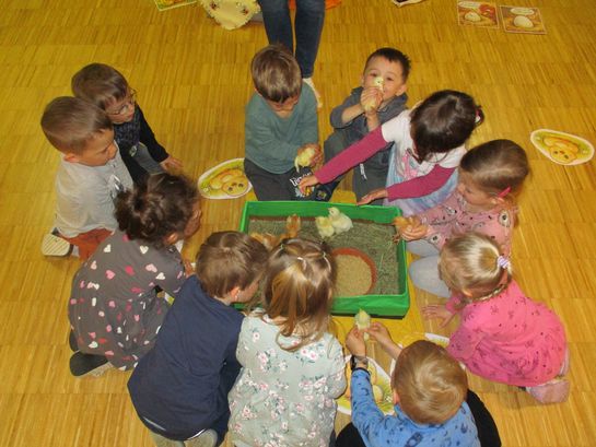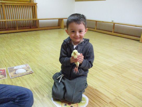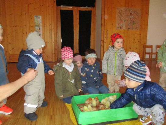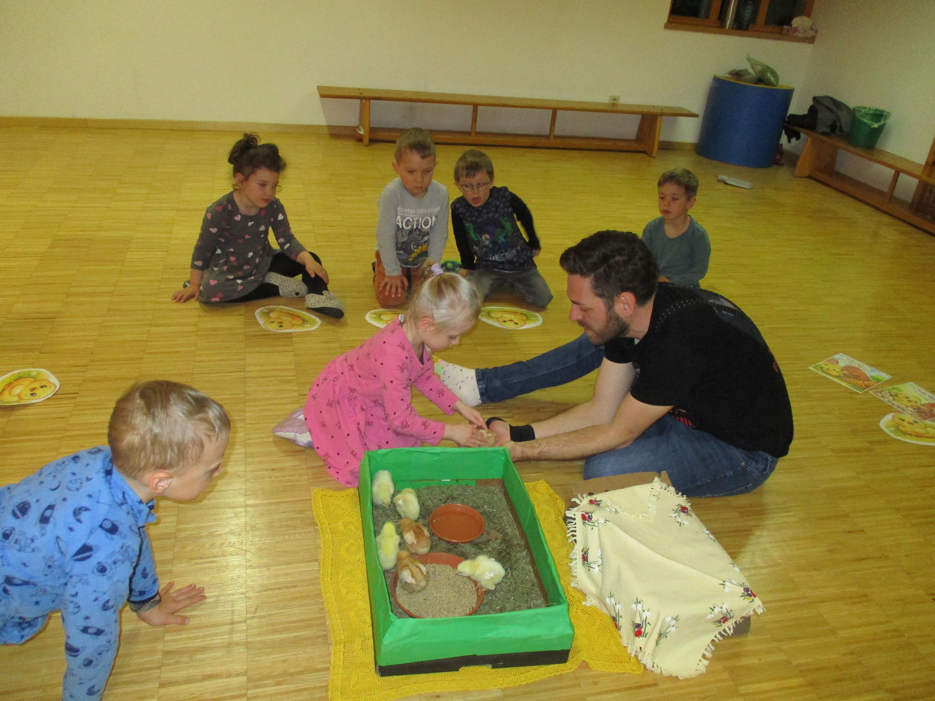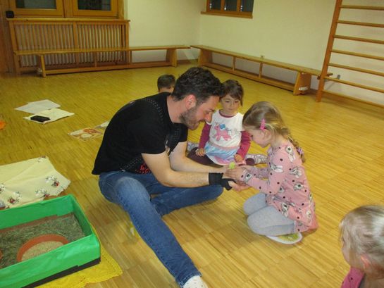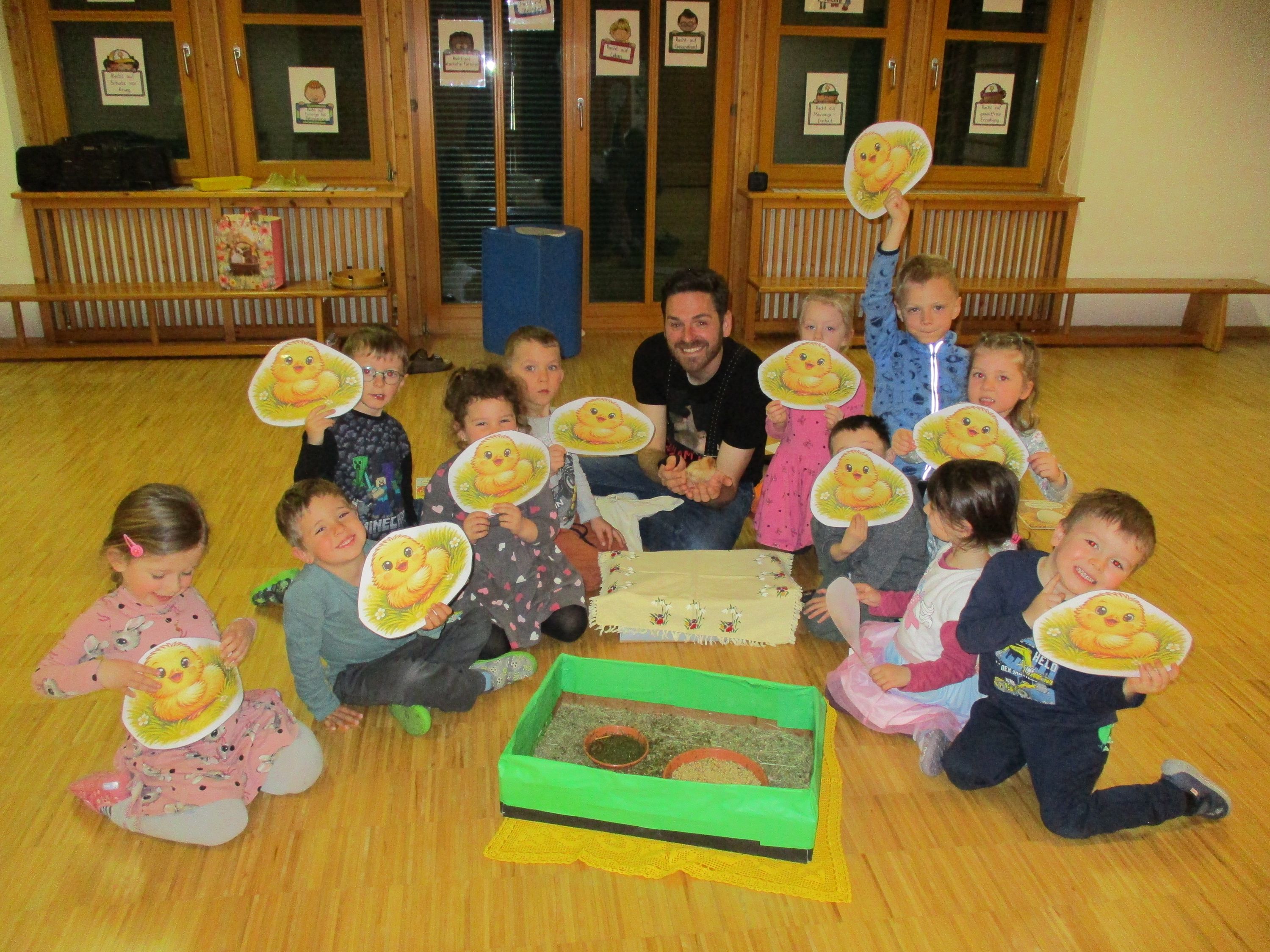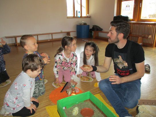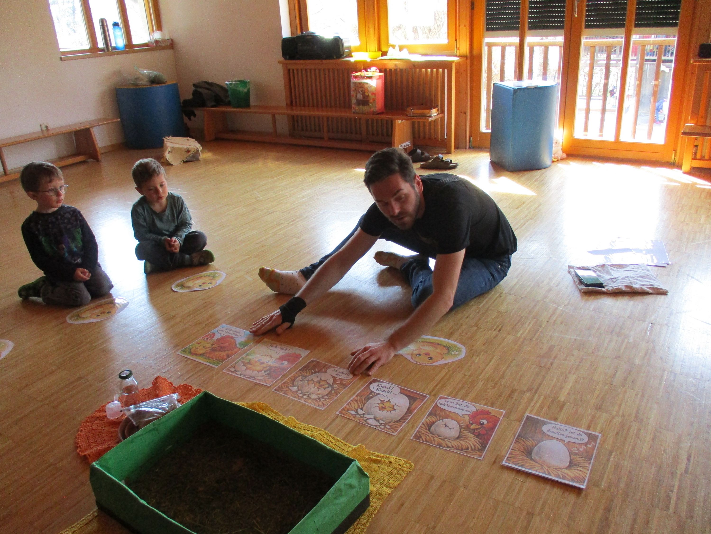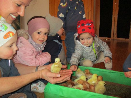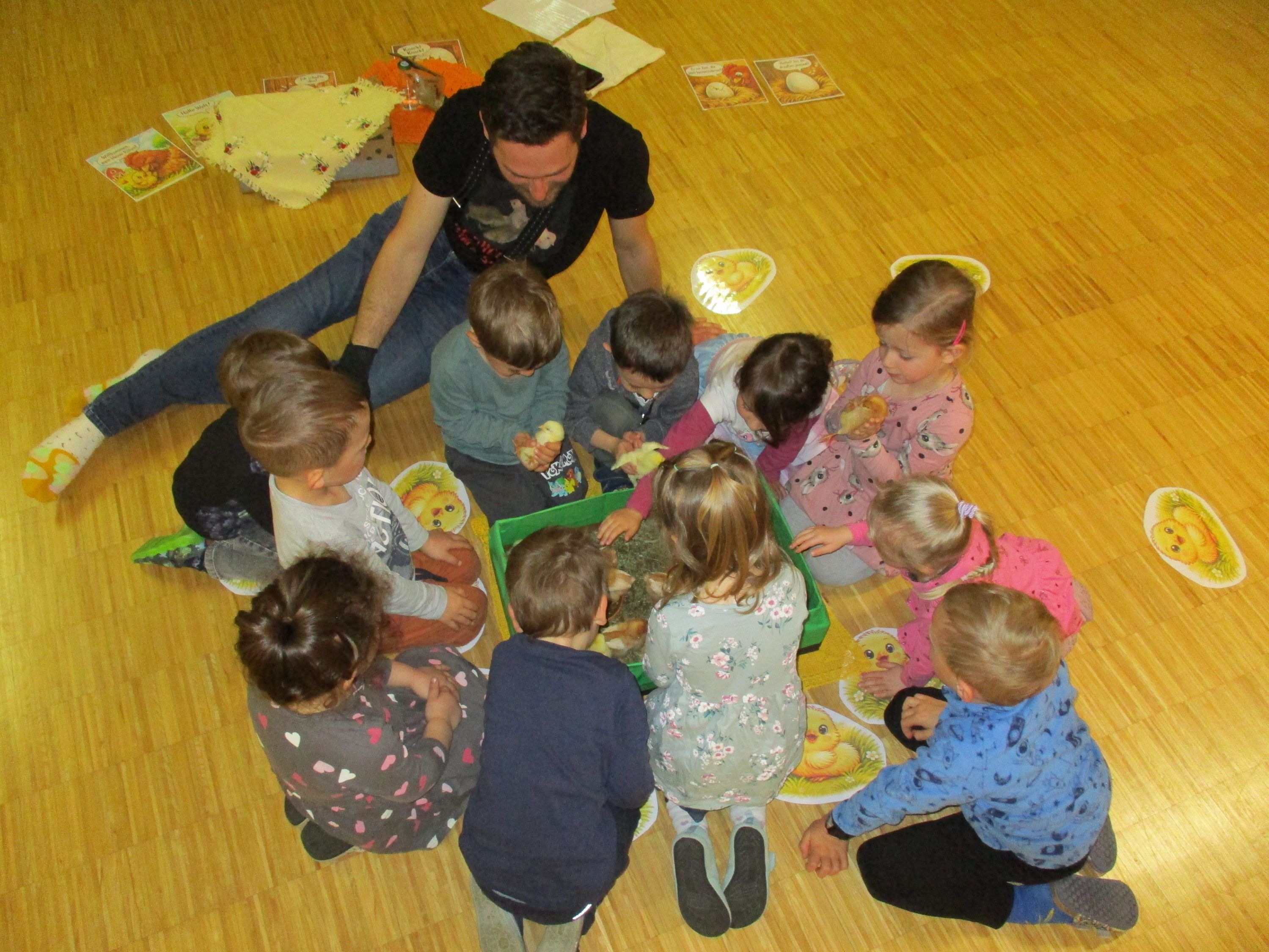 Für die Aufarbeitung des thematischen Schwerpunktes "Vom Ei zur Henne", besuchte Elementarpädagoge i.A. Bernd Stattmann die Bärengruppe. 15 Küken und eine Seidenhenne durften die Kinder streicheln, aufheben, betrachten, füttern und beobachten.