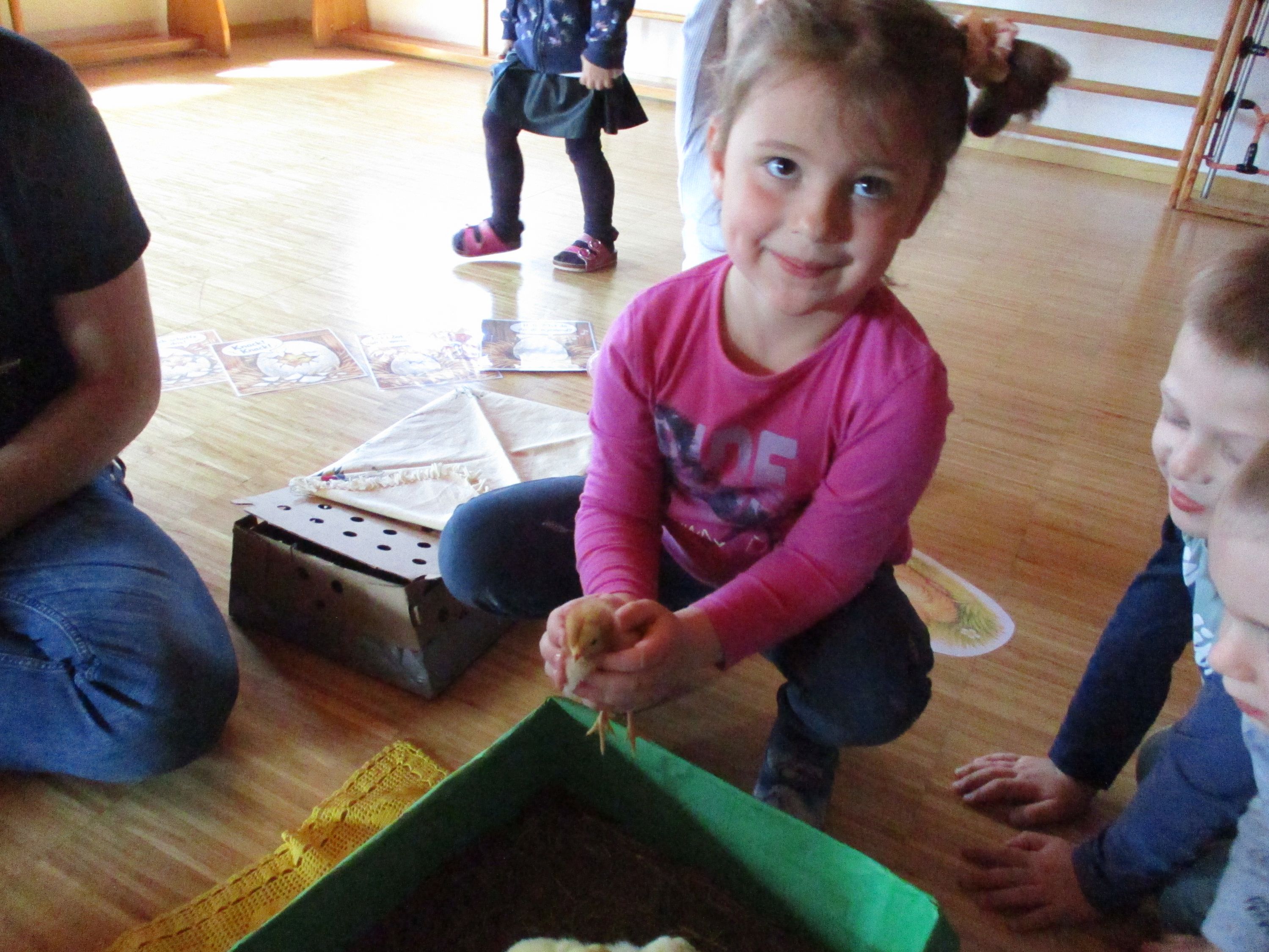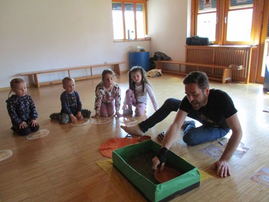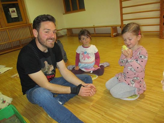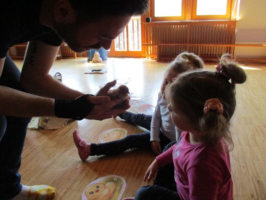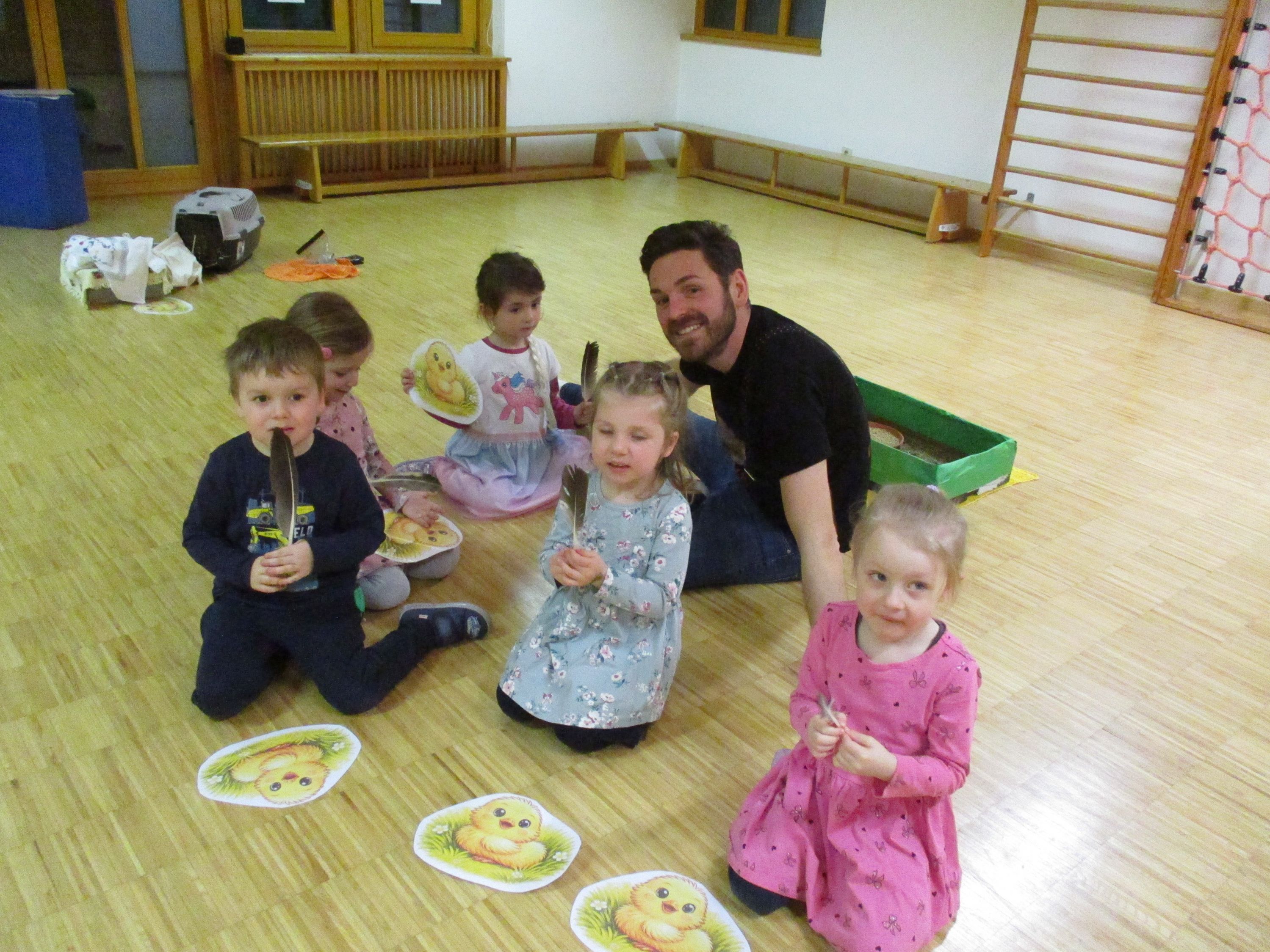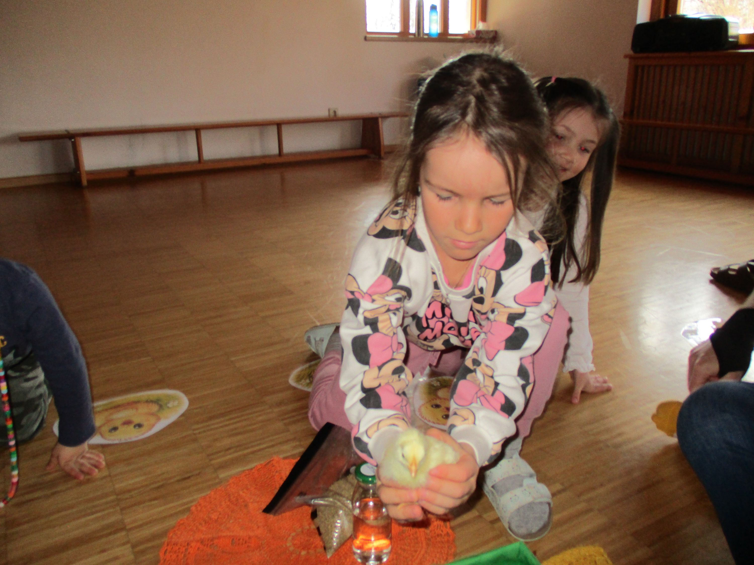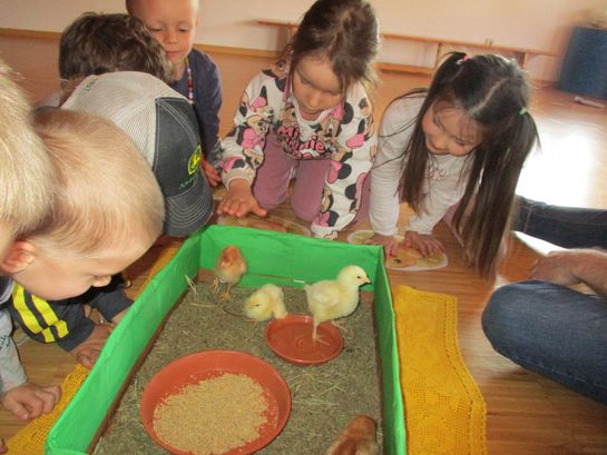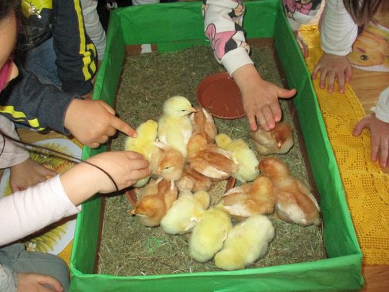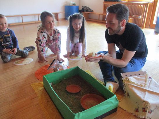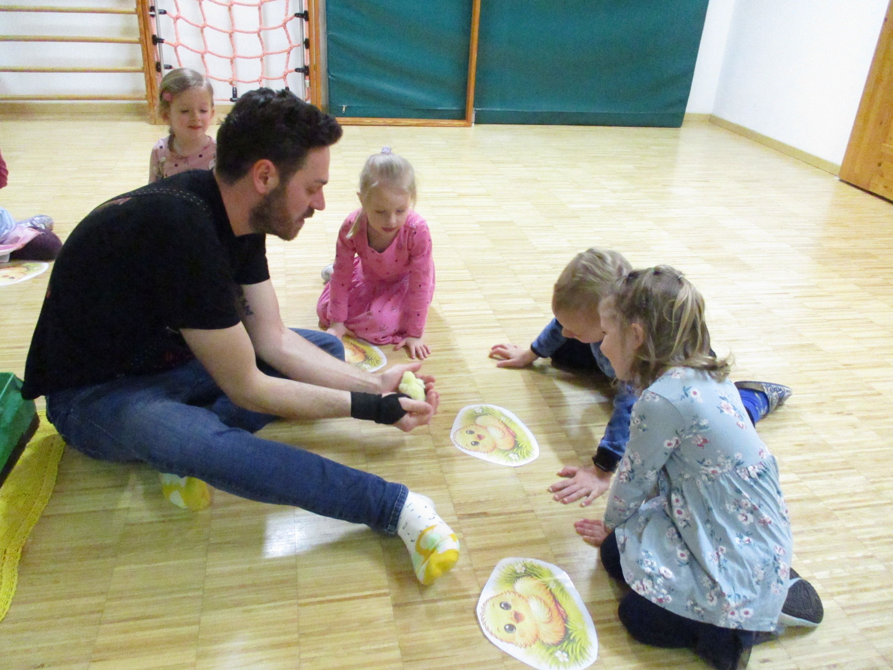 Für die Aufarbeitung des thematischen Schwerpunktes "Vom Ei zur Henne", besuchte Elementarpädagoge i.A. Bernd Stattmann die Bärengruppe. 15 Küken und eine Seidenhenne durften die Kinder streicheln, aufheben, betrachten, füttern und beobachten.