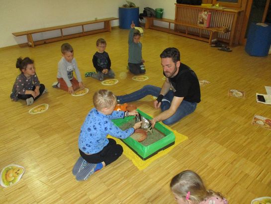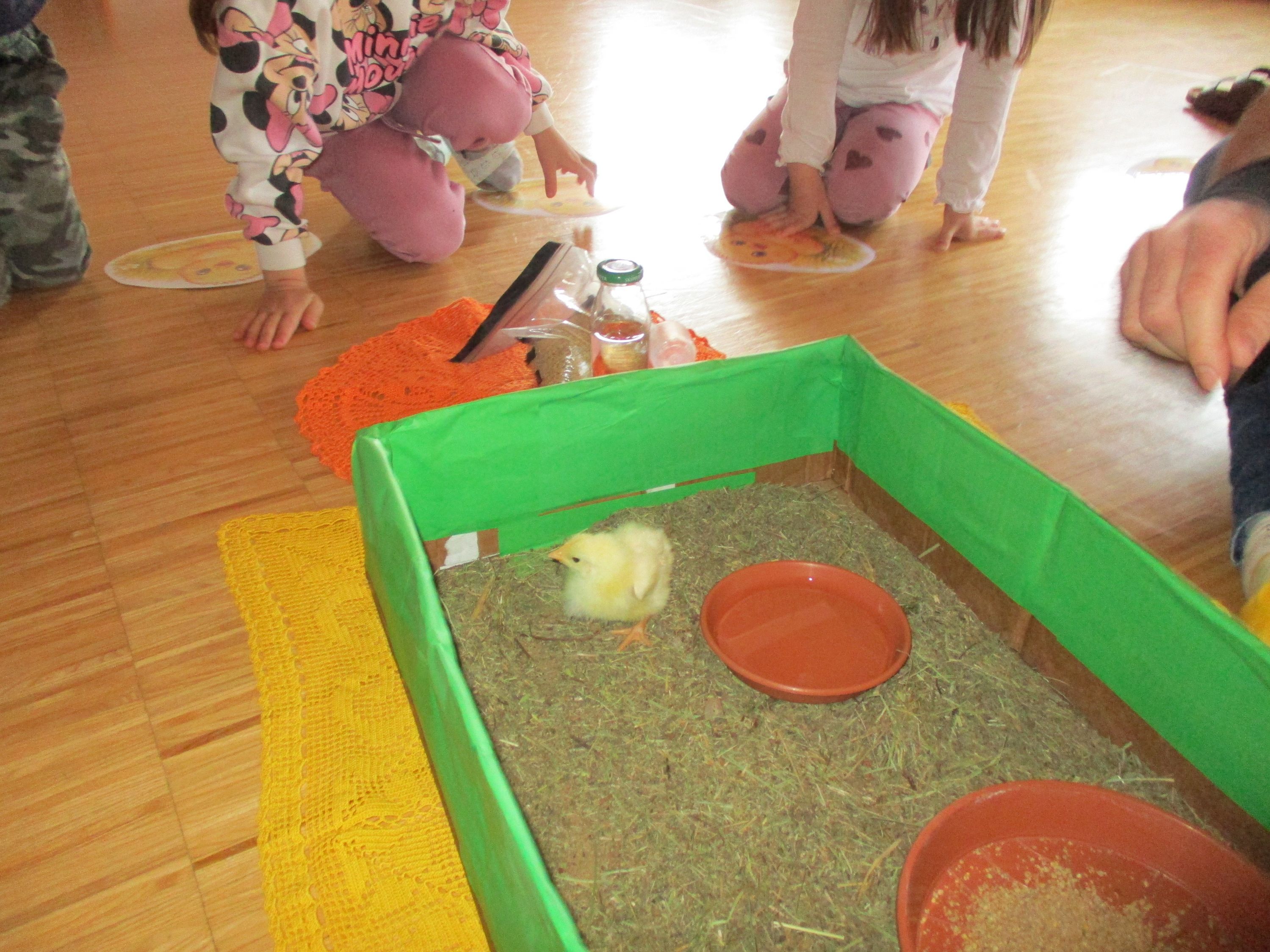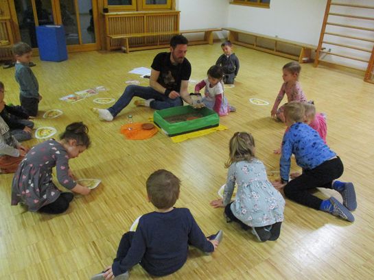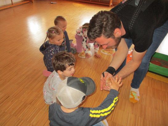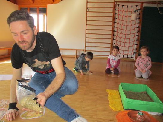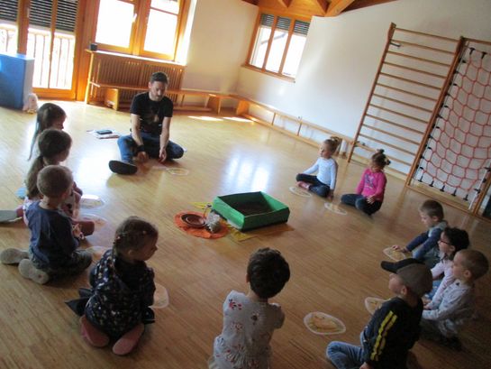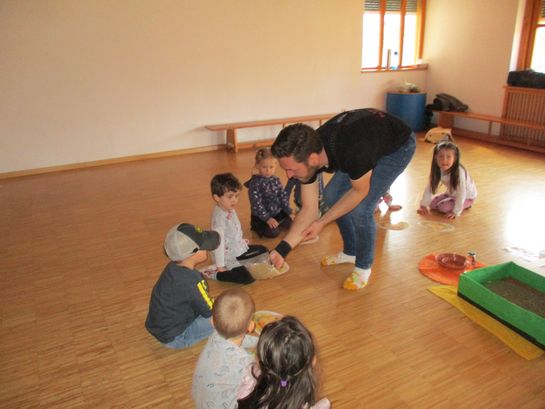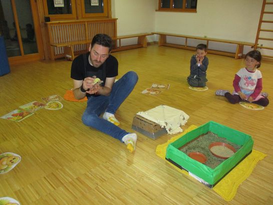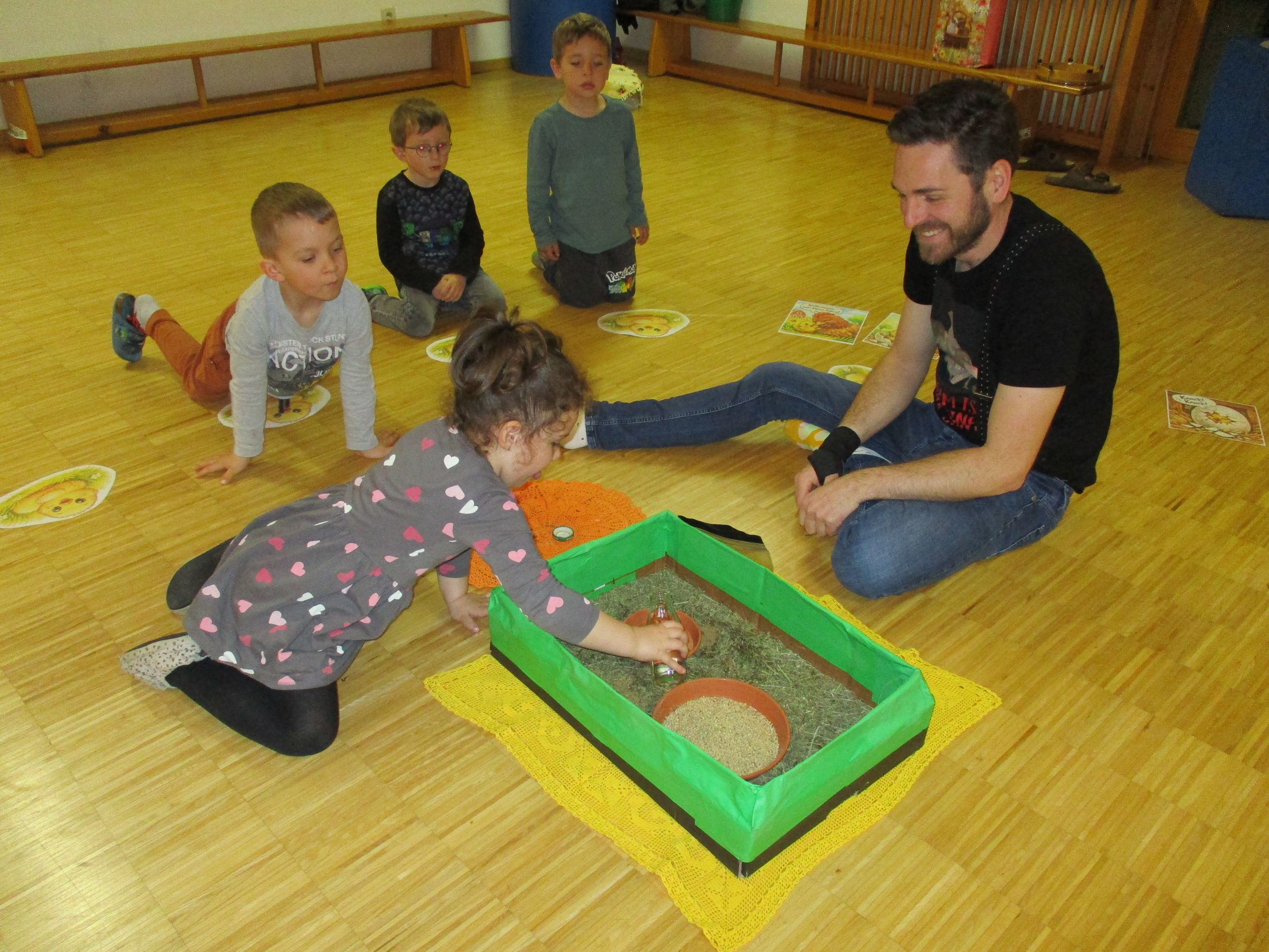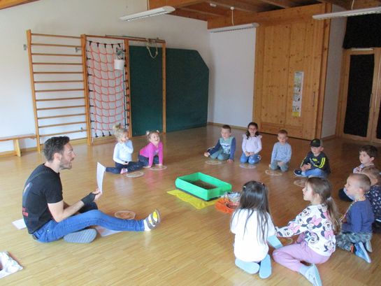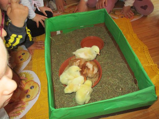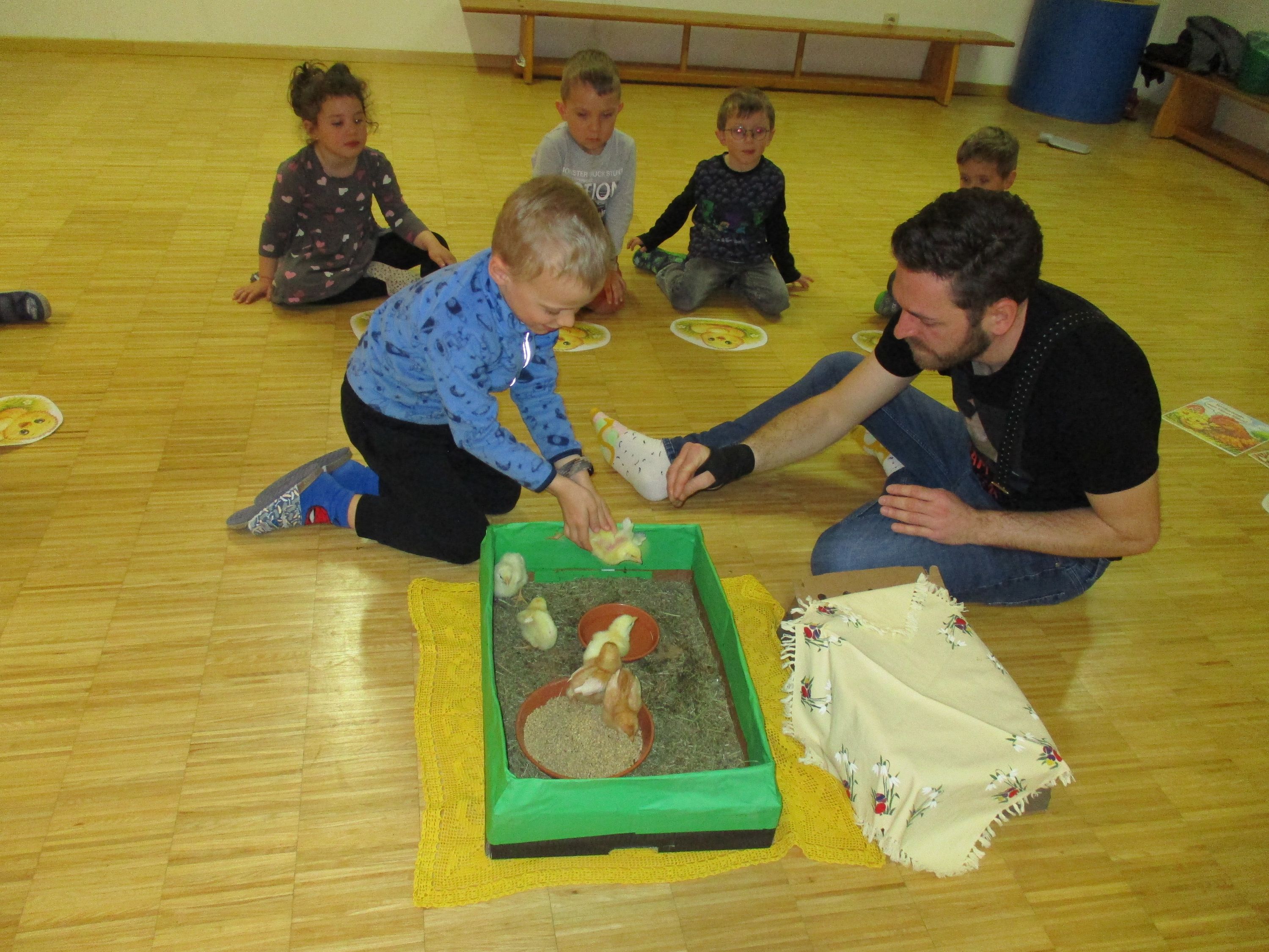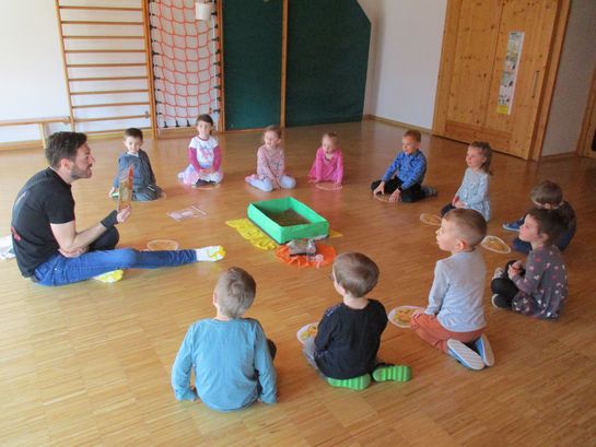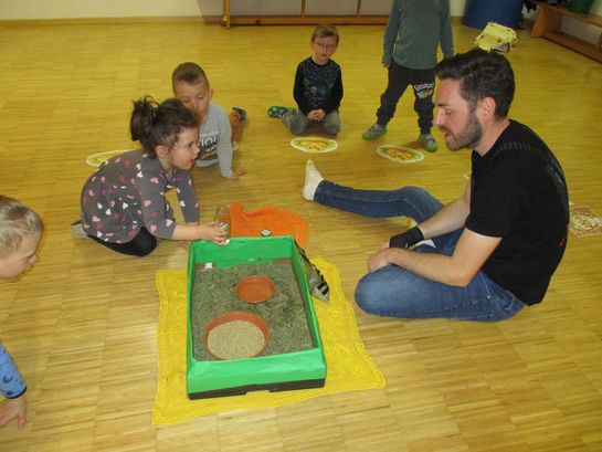Für die Aufarbeitung des thematischen Schwerpunktes "Vom Ei zur Henne", besuchte Elementarpädagoge i.A. Bernd Stattmann die Bärengruppe. 15 Küken und eine Seidenhenne durften die Kinder streicheln, aufheben, betrachten, füttern und beobachten.