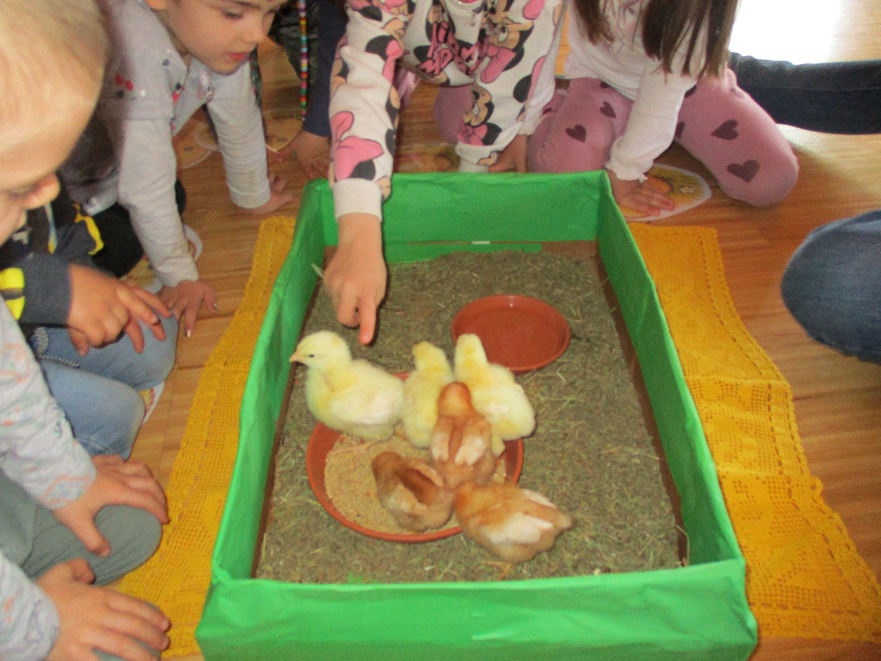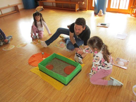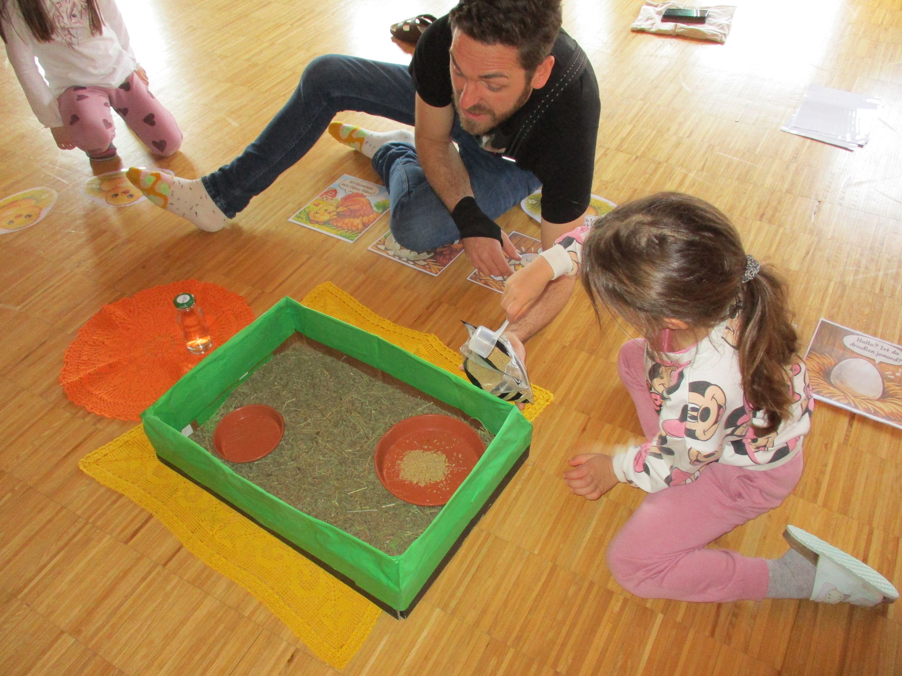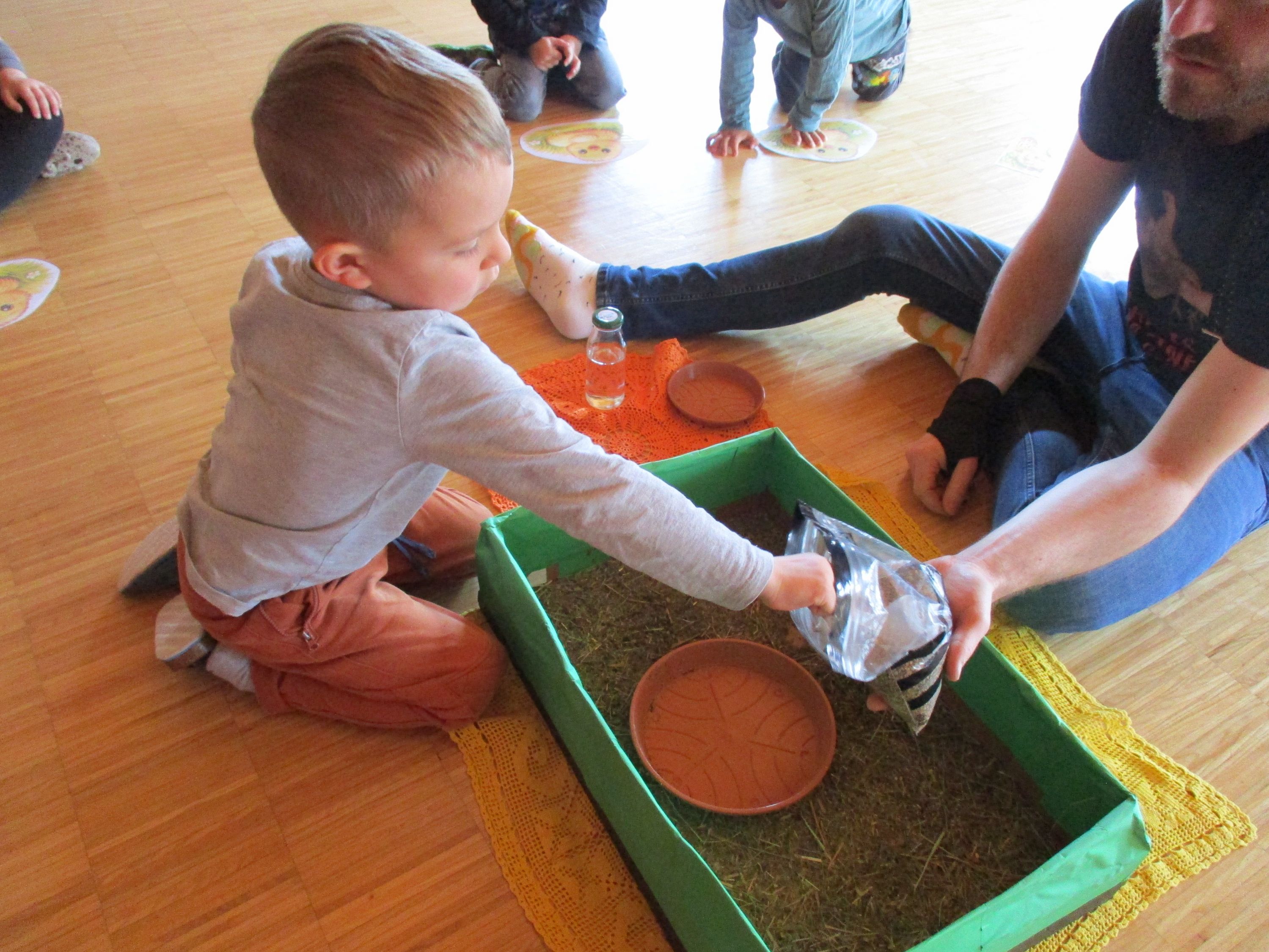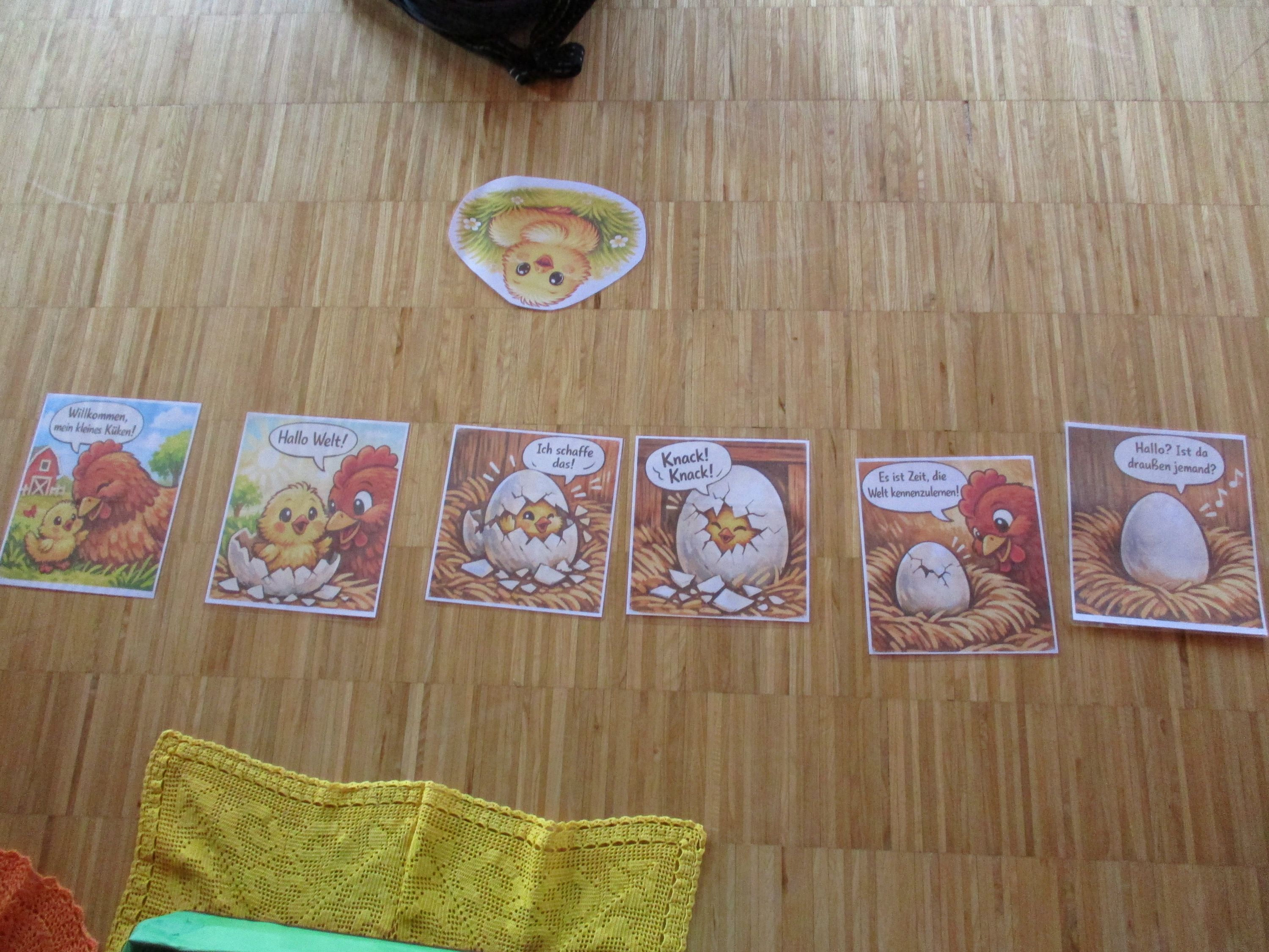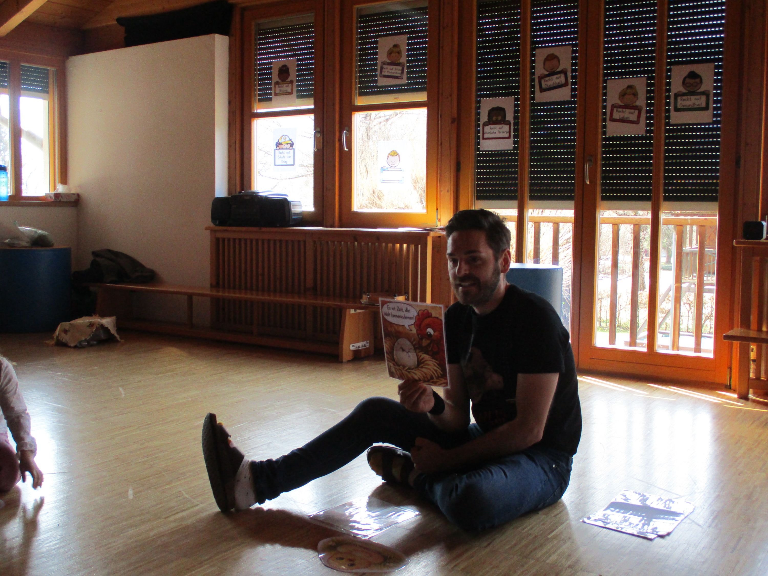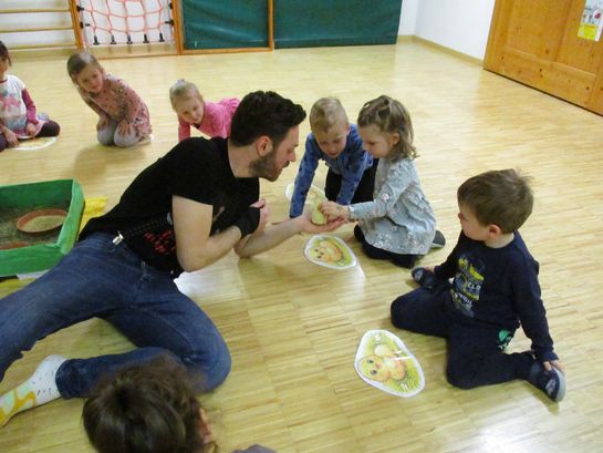 Für die Aufarbeitung des thematischen Schwerpunktes "Vom Ei zur Henne", besuchte Elementarpädagoge i.A. Bernd Stattmann die Bärengruppe. 15 Küken und eine Seidenhenne durften die Kinder streicheln, aufheben, betrachten, füttern und beobachten.