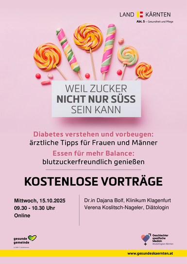 Die Unterabteilung Gesundheitsförderung (Abteilung 5) und die Geschäftsstelle Geschlechterspezifische Medizin des Landes Kärnten bietet Ihnen einen kostenlosen Vortrag zum Thema Diabetesvorbeugung an.