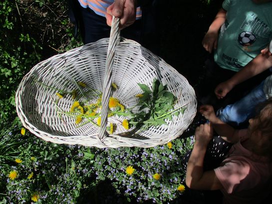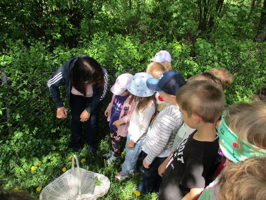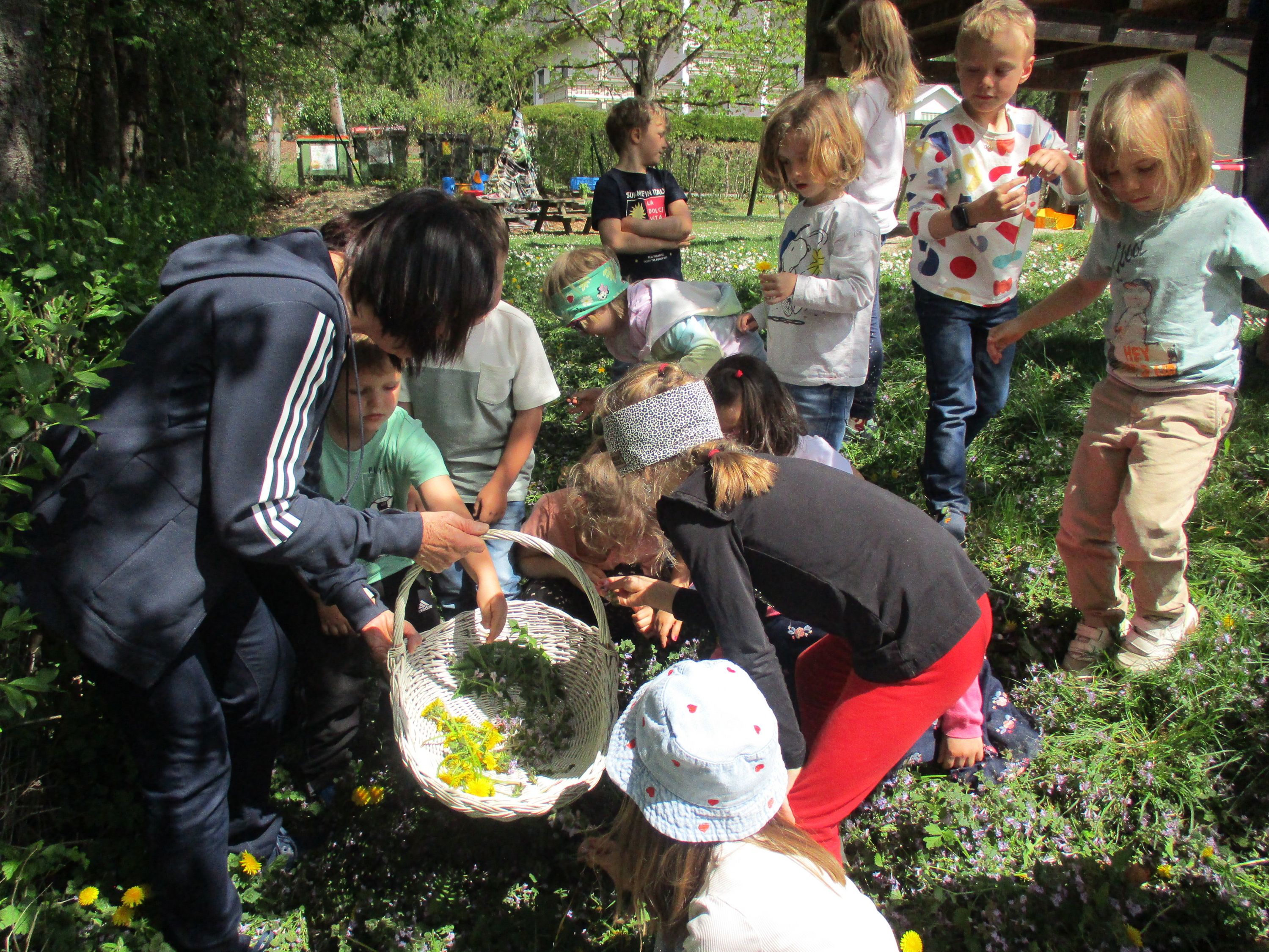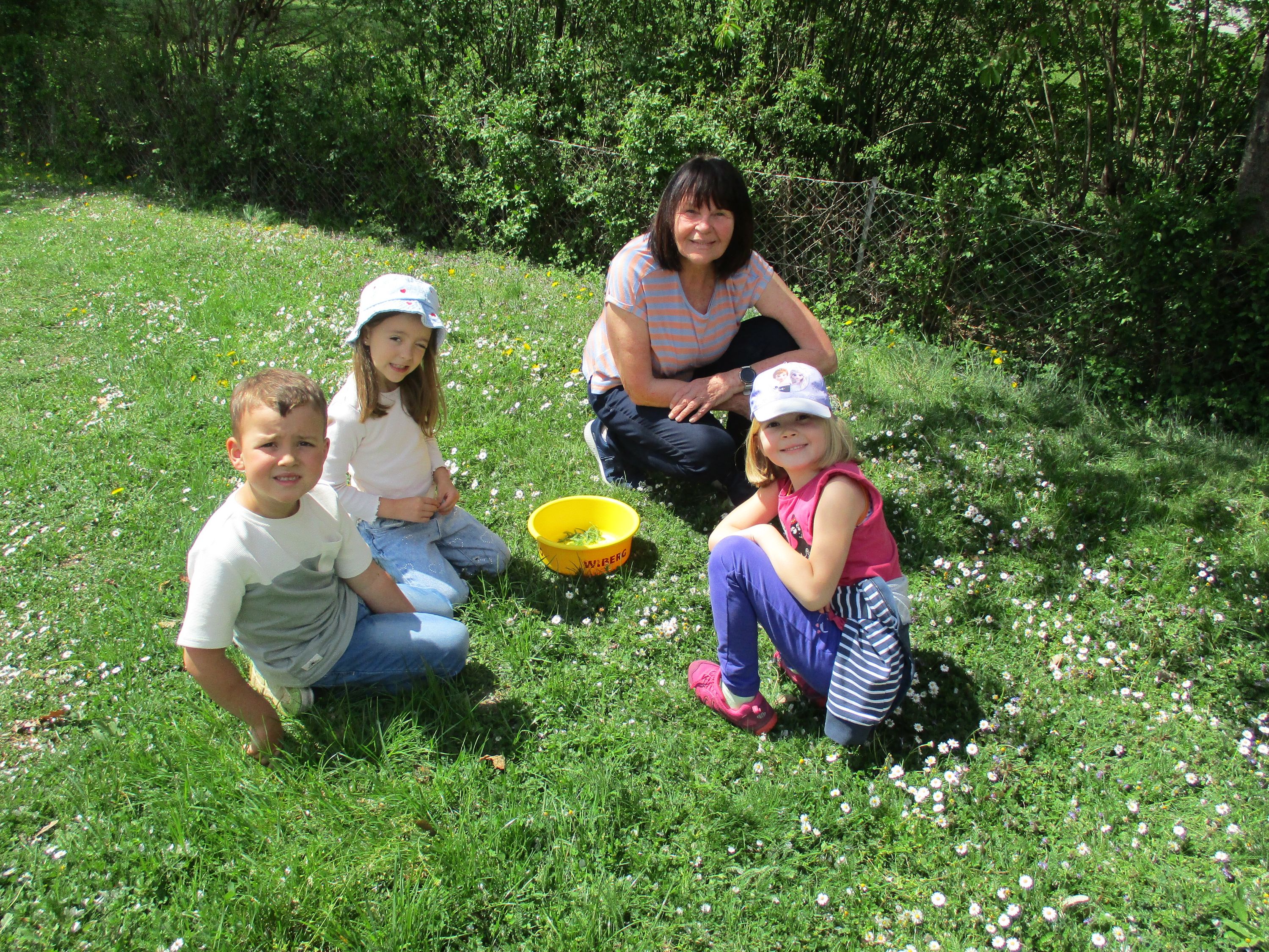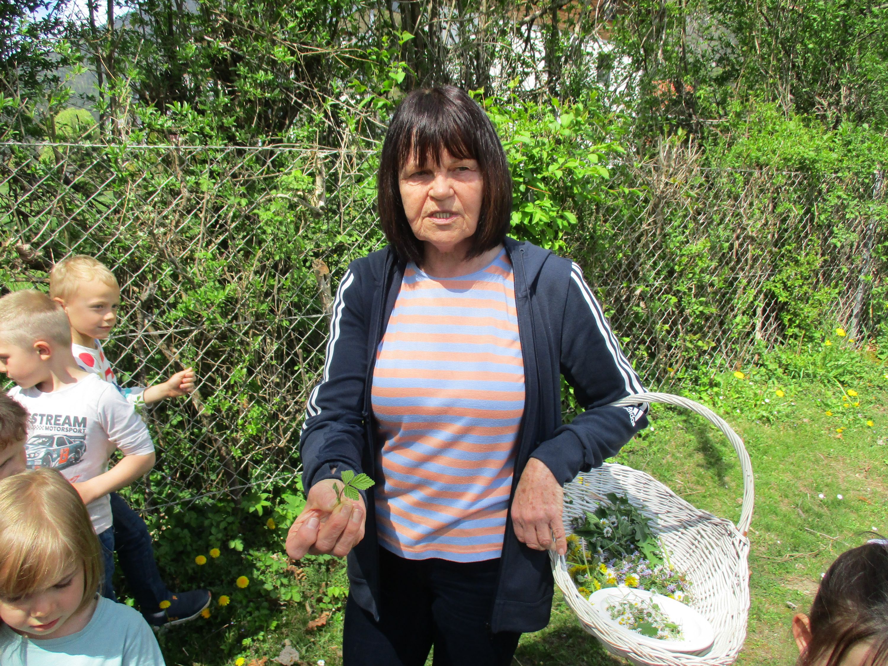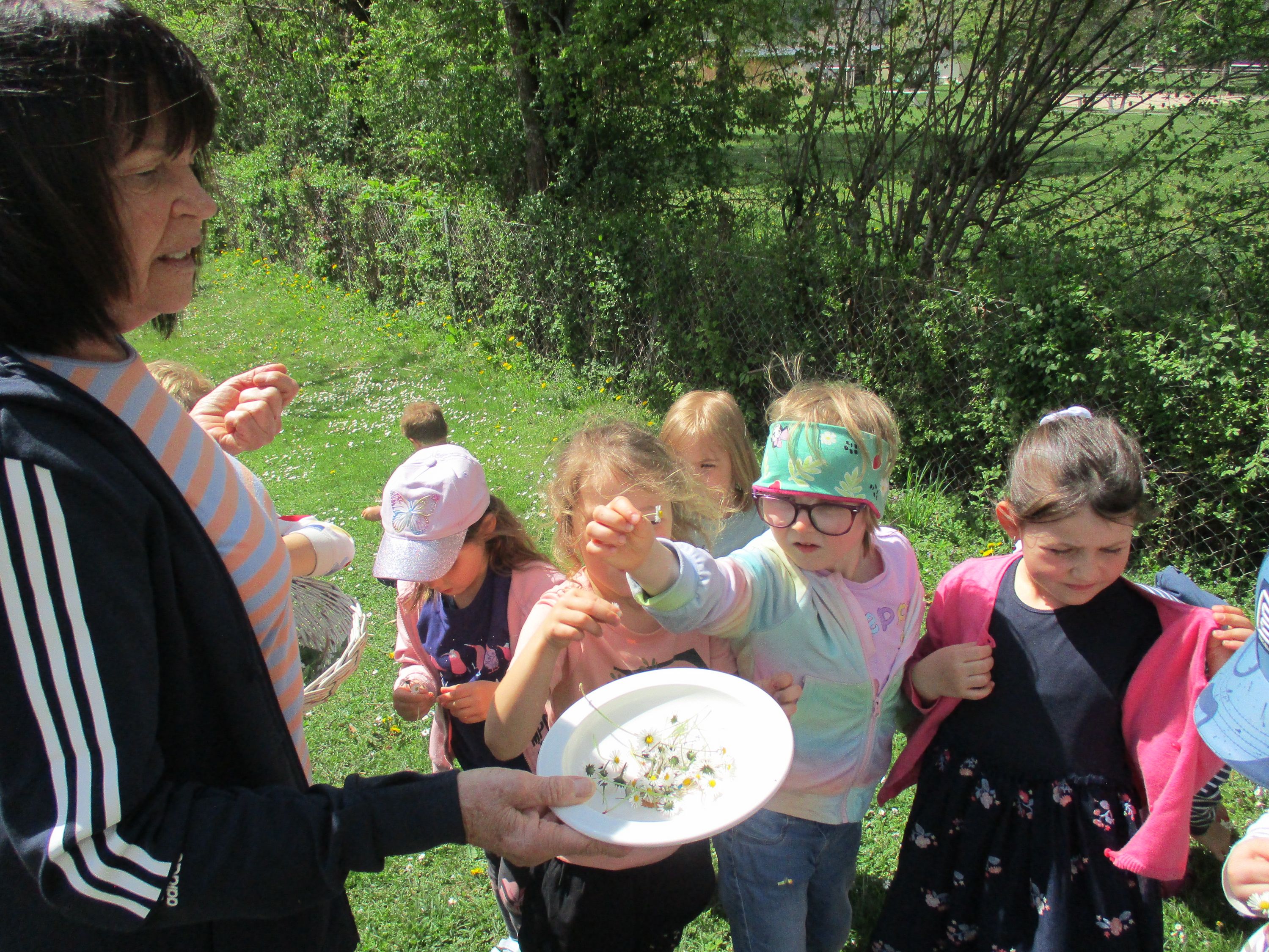Mit Köchin und Kräuterexpertin Irene Primschitz wurden Wildkräuter, wie Löwenzahn, Gänseblümchen, Vogelmiere und Brennnessel gesucht und bestimmt. Die Sinne wurden beim Riechen der Kräuter geschult und schmeckten zur Nachmittagsjause auf das Butterbrot und als Frühlingskräutersuppe hervorragend.