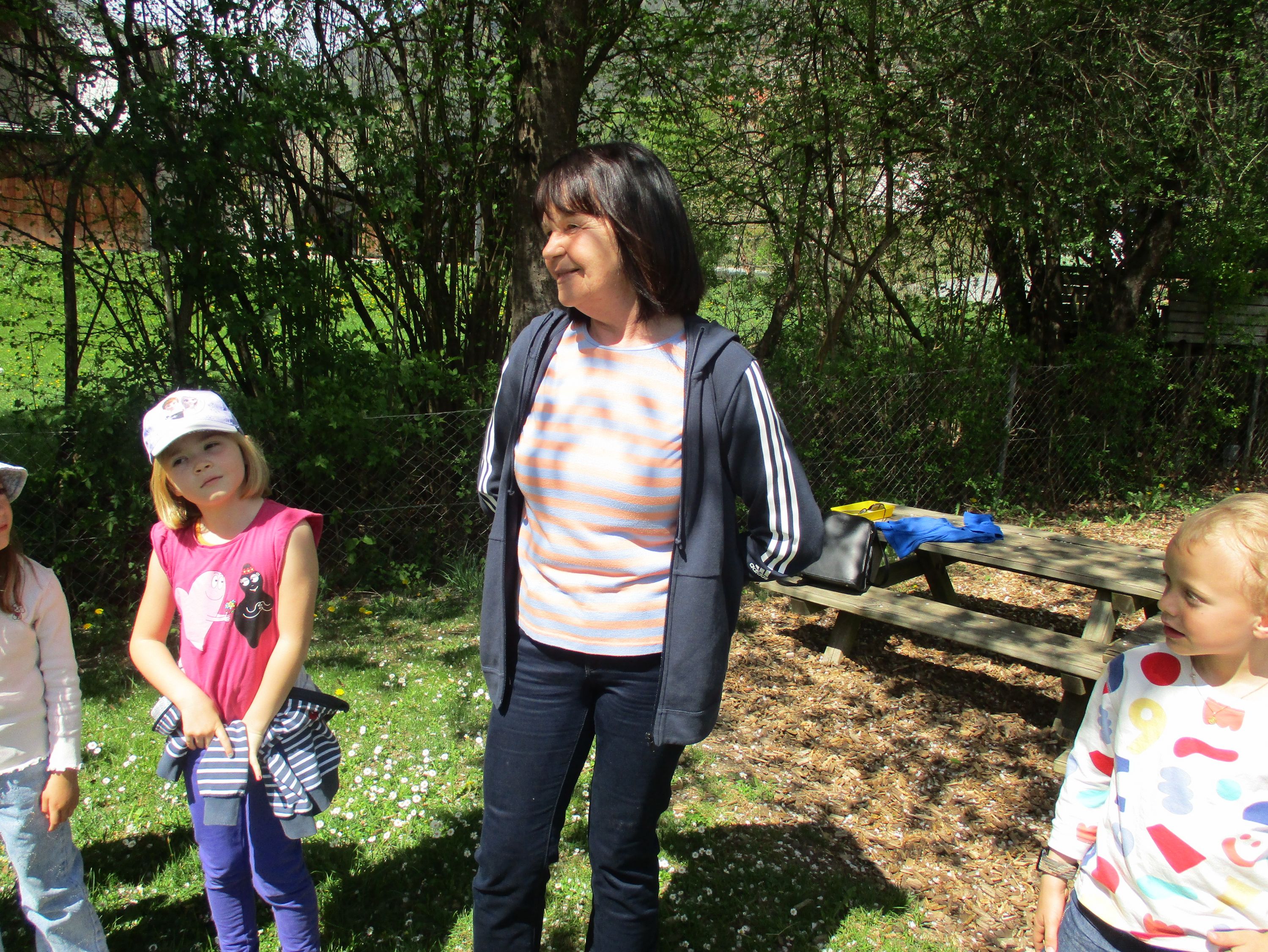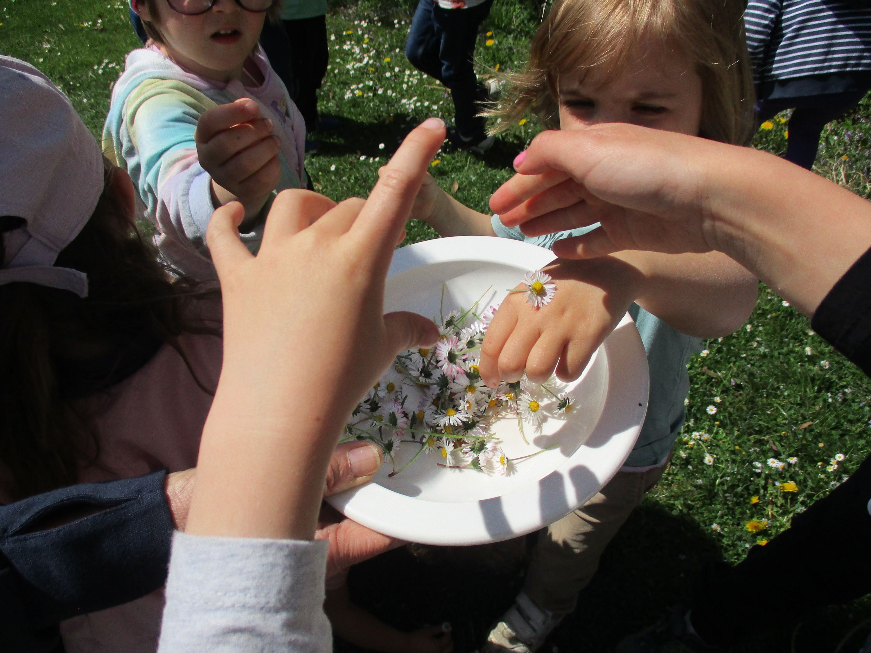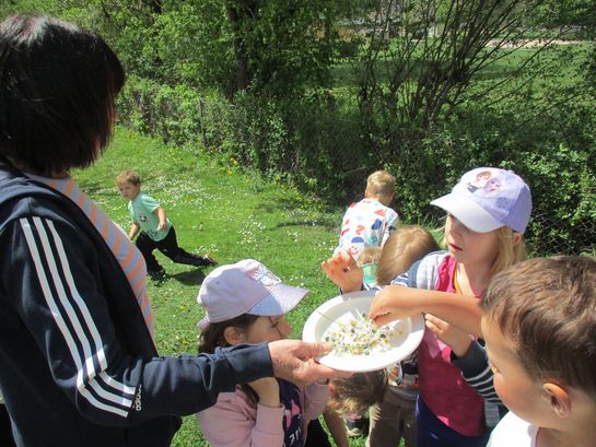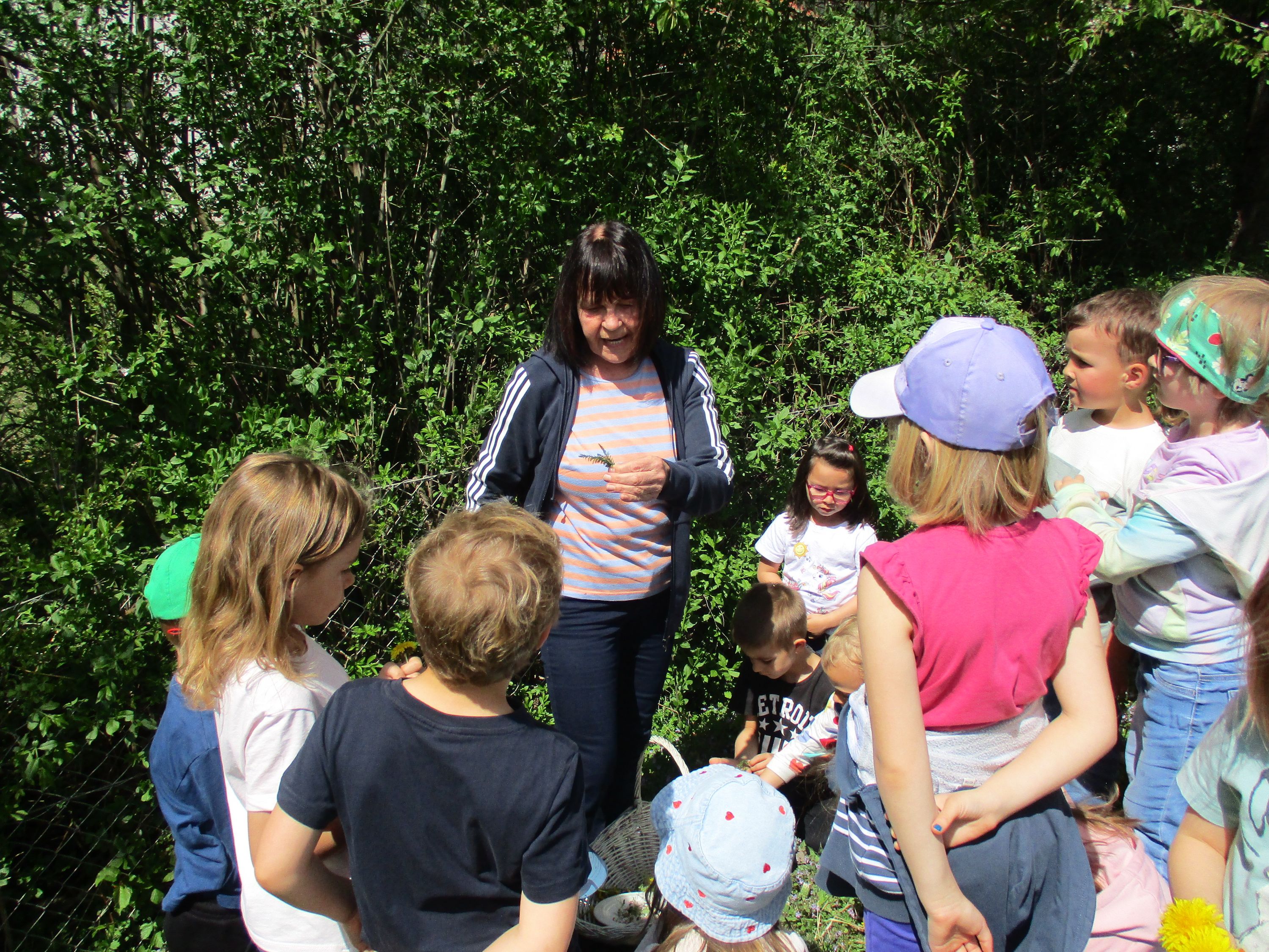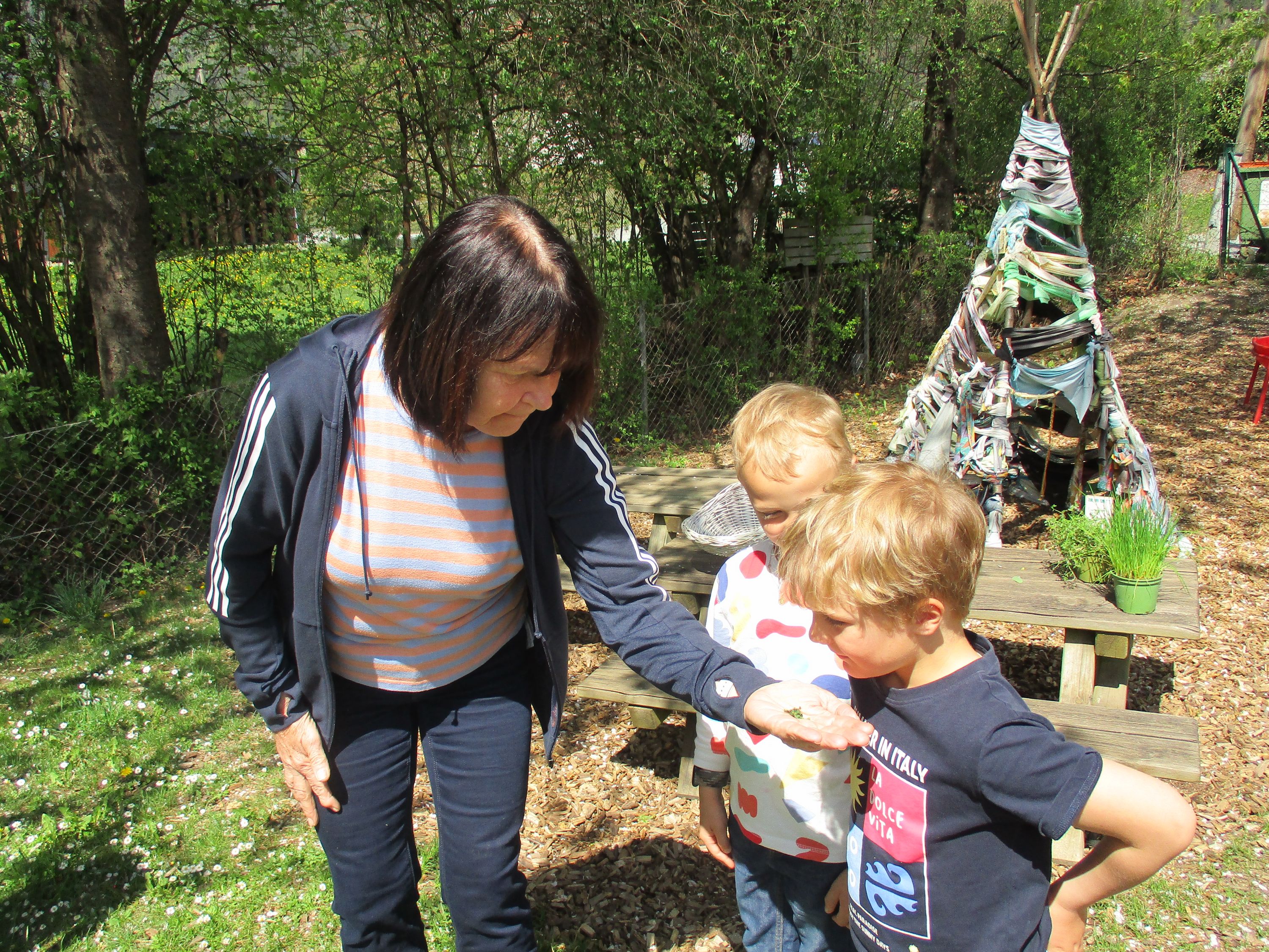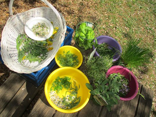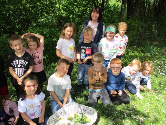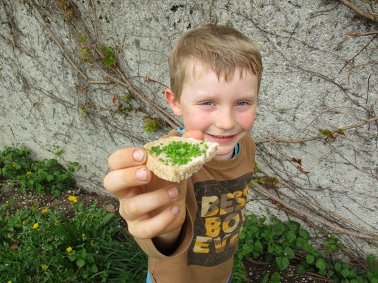 Mit Köchin und Kräuterexpertin Irene Primschitz wurden Wildkräuter, wie Löwenzahn, Gänseblümchen, Vogelmiere und Brennnessel gesucht und bestimmt. Die Sinne wurden beim Riechen der Kräuter geschult und schmeckten zur Nachmittagsjause auf das Butterbrot und als Frühlingskräutersuppe hervorragend.