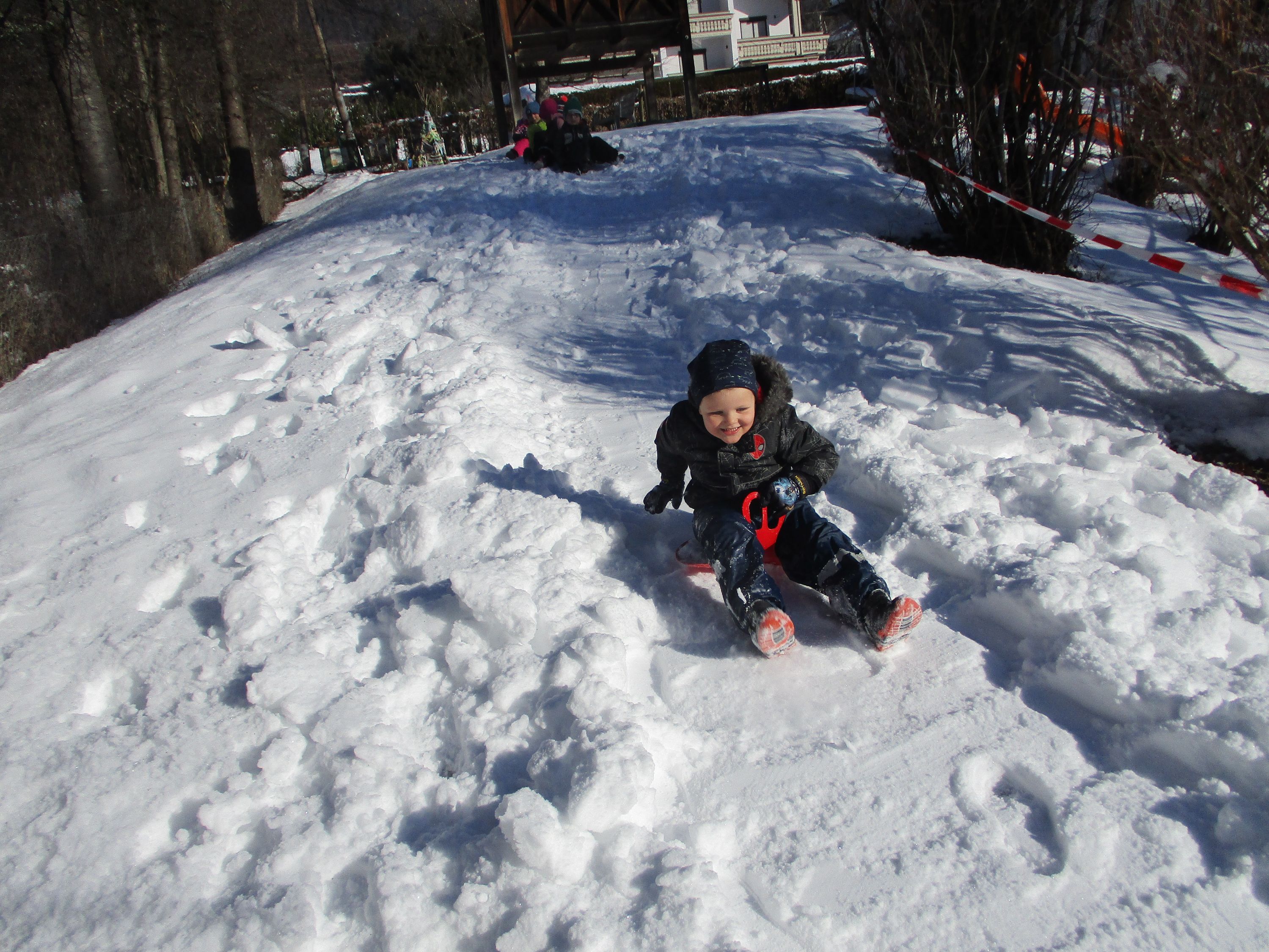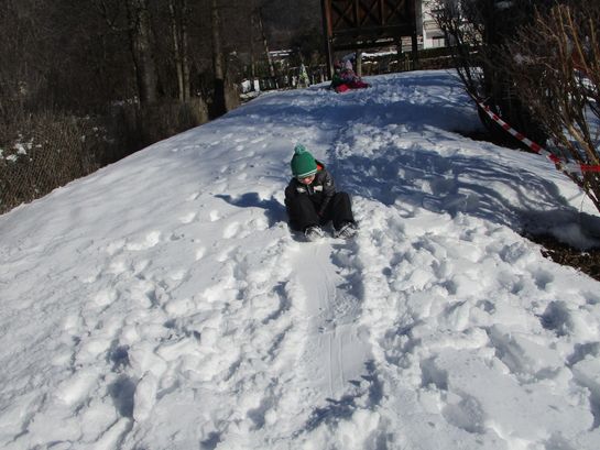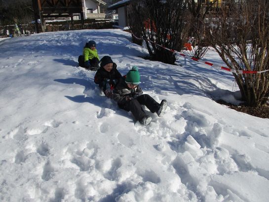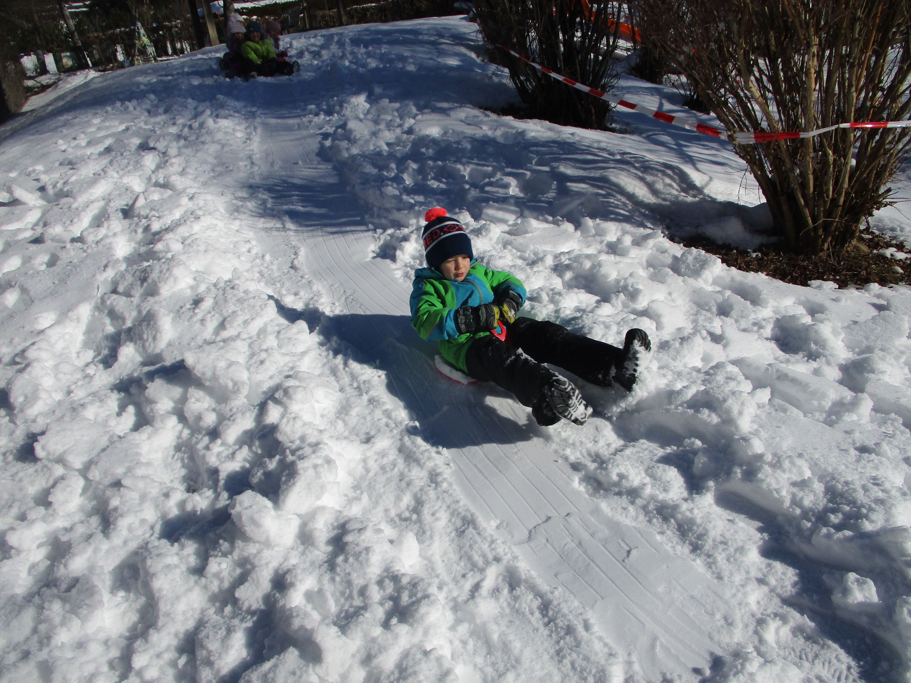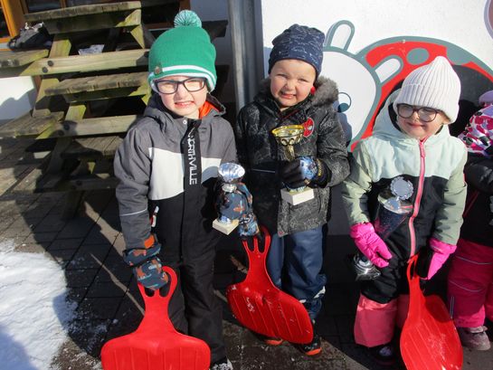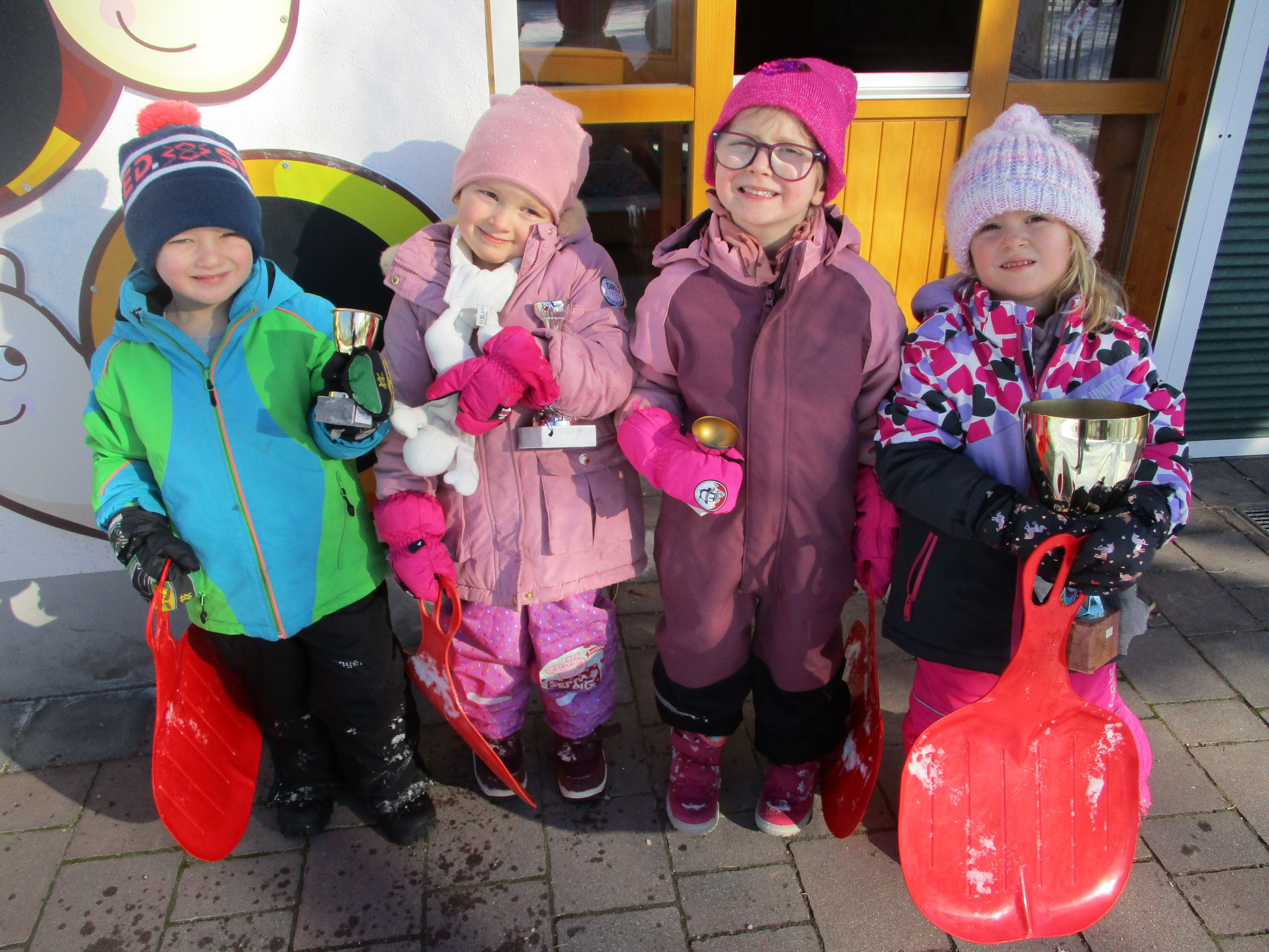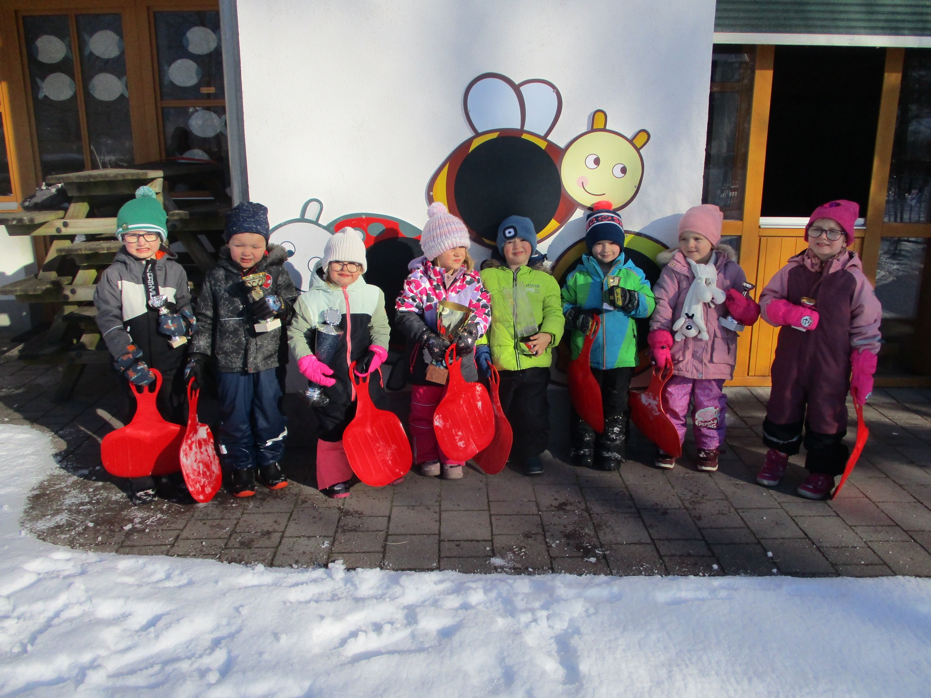 Die Kinder gestalteten mit ihren "Rutschis" eine Bahn am Hügel und rutschten dort vergnügt im Schnee. Allen Kindern wurde ein Pokal verliehen, da dies die Motivation stärken soll, die Anstrengung wertgeschätzt wird und der Fokus auf das Mitmachen und nicht auf den Sieg gelegt wurde.