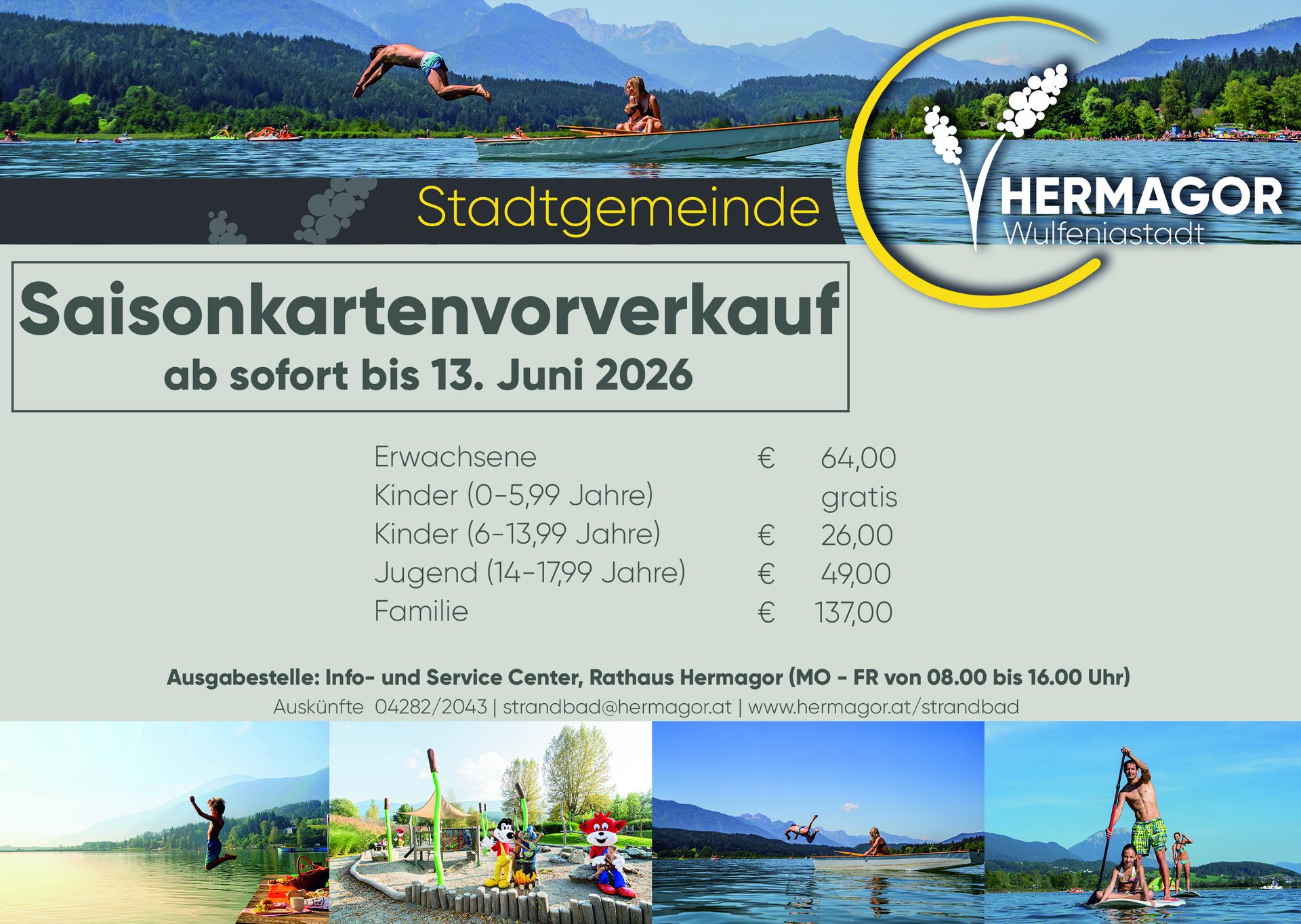 Die vergünstigten Saisonkarten sind ab sofort bis einschließlich 13. Juni 2026 im Info & Servicecenter im Rathaus Hermagor erhältlich. Genießen Sie schöne Sonnenstunden in unserem Strandbad Hermagor-Pressegger See.