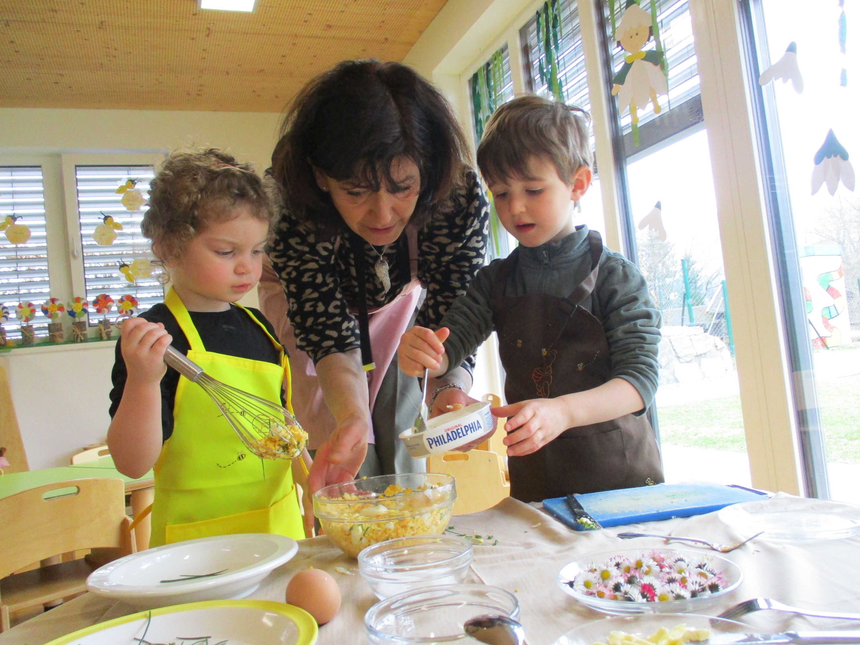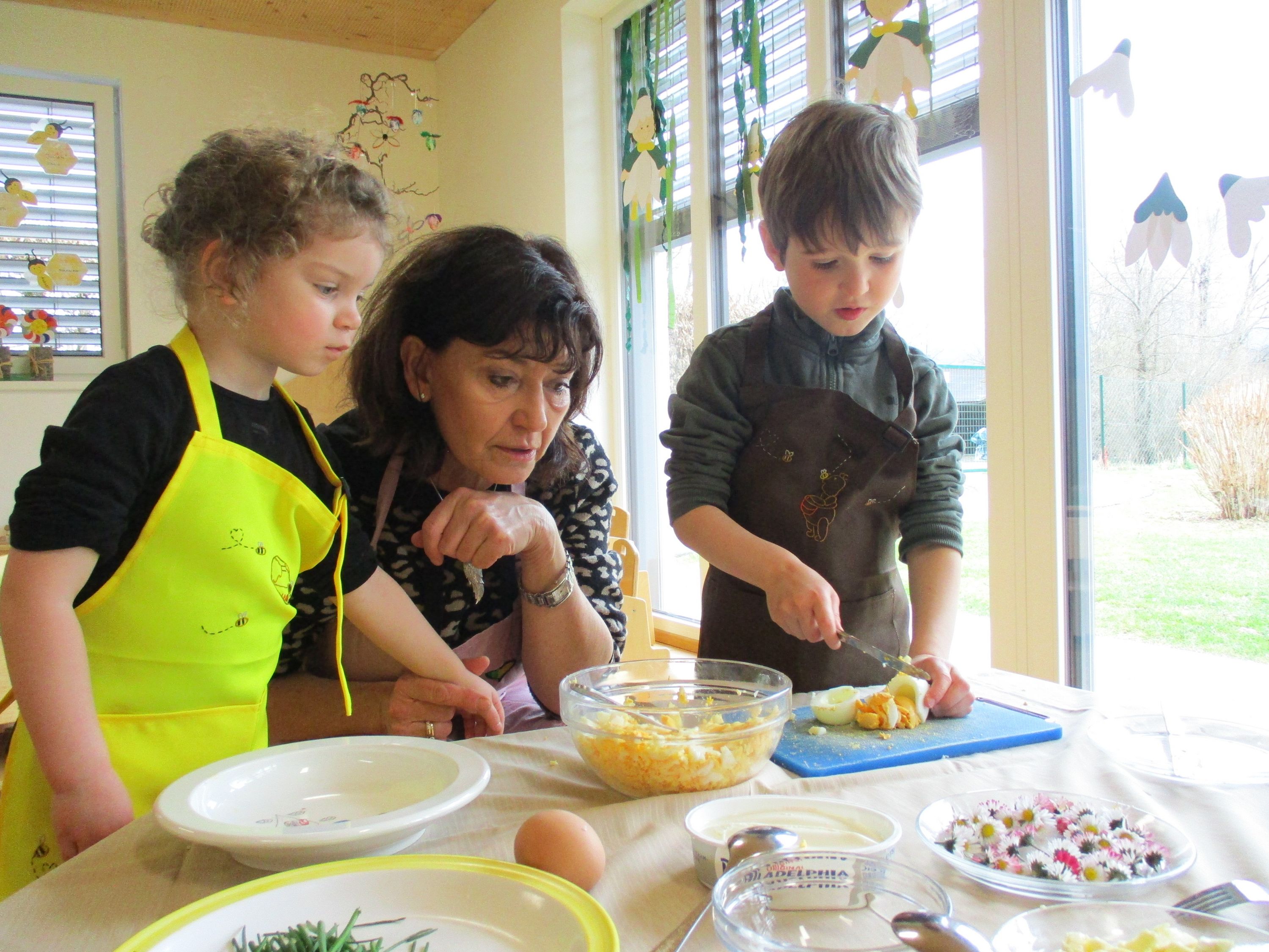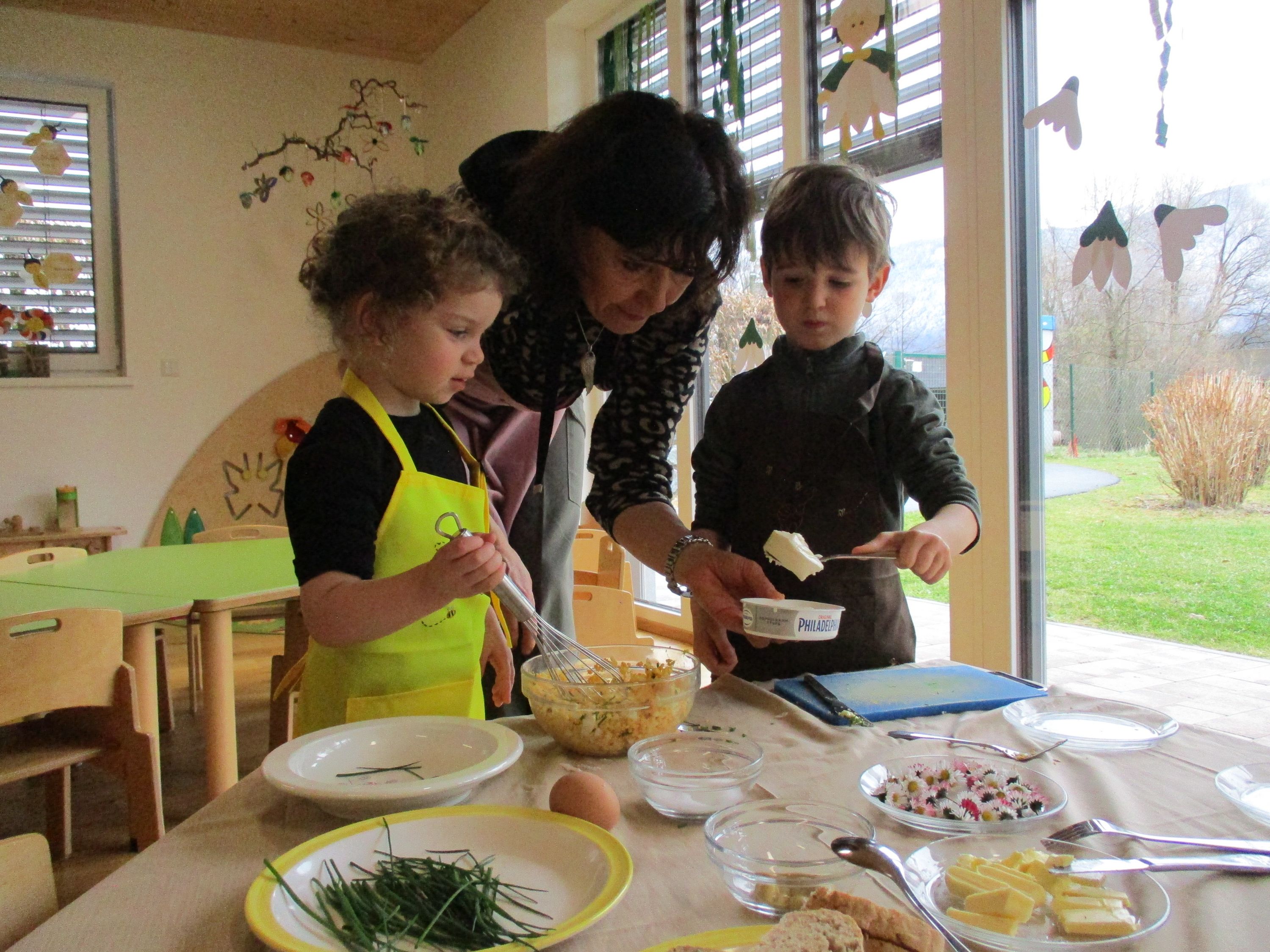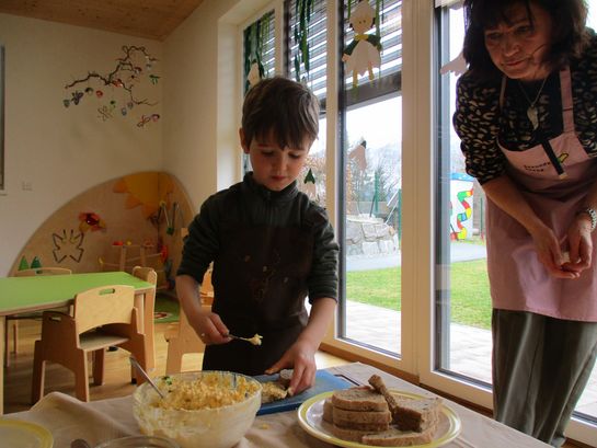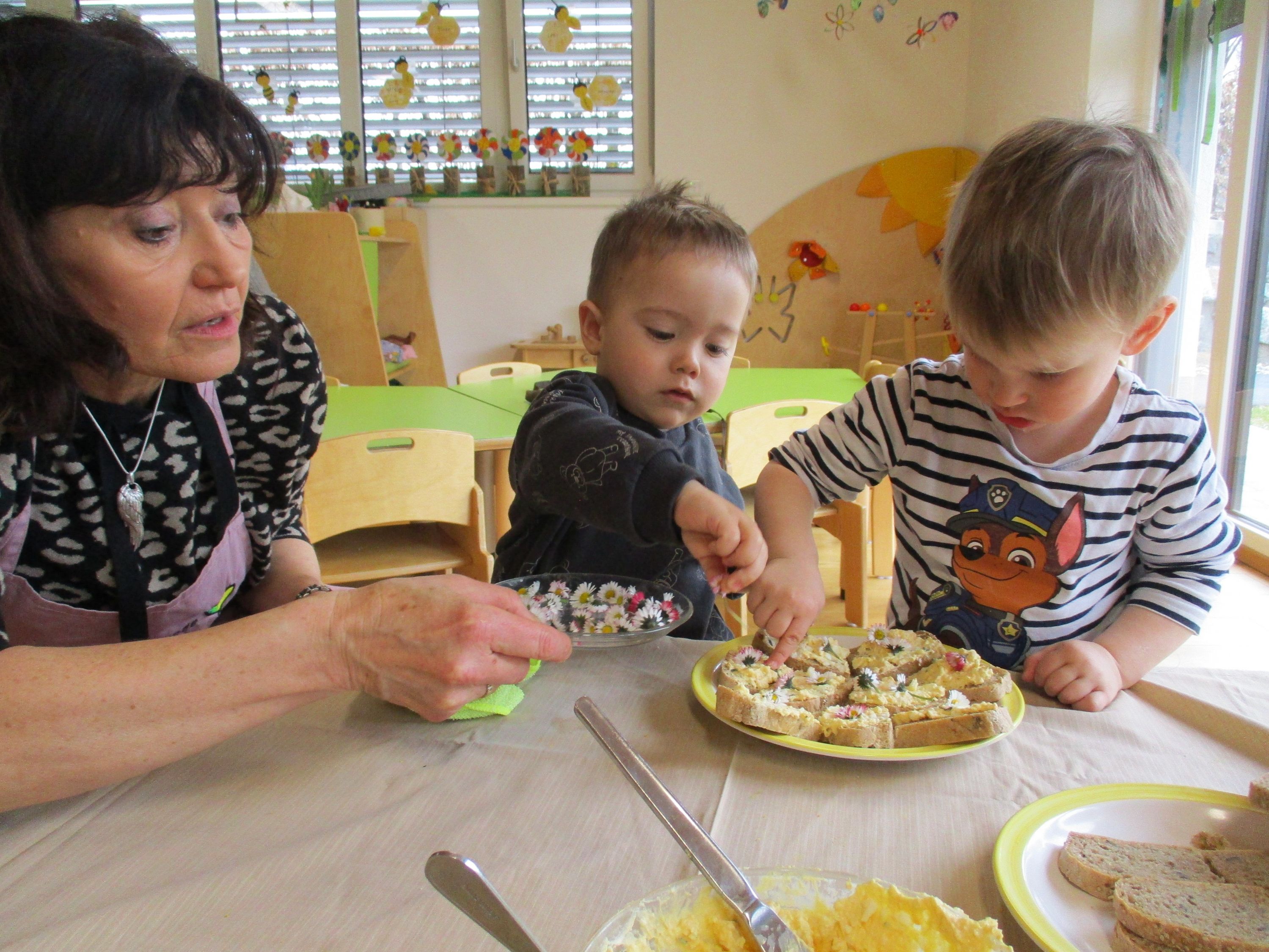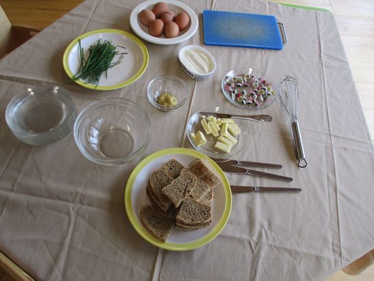 Eieraufstrich mit Gänseblümchen und Butterbrot mit hart gekochtem Ei wurden gemeinsam mit den Kindern zubereitet und verkostet.