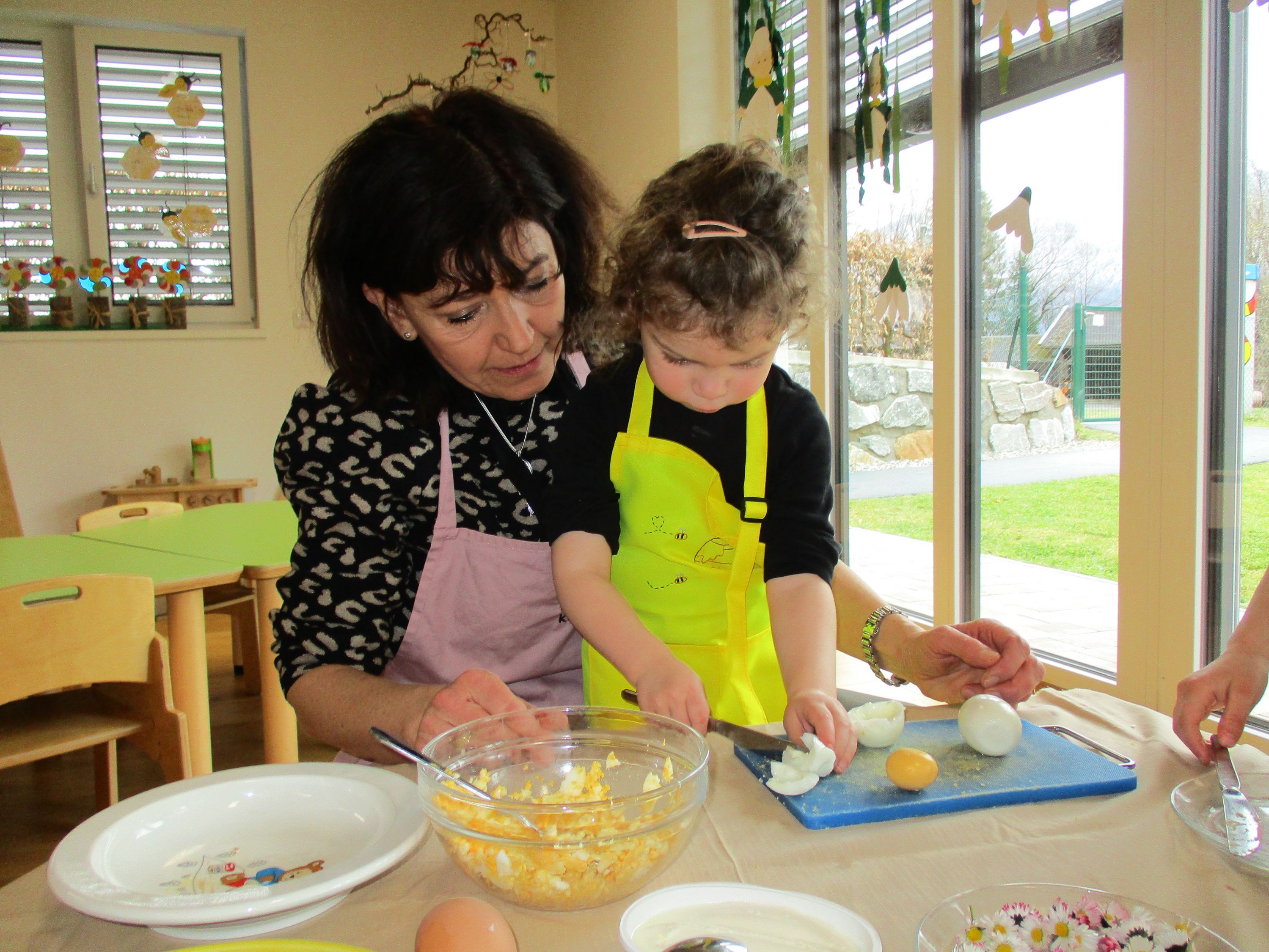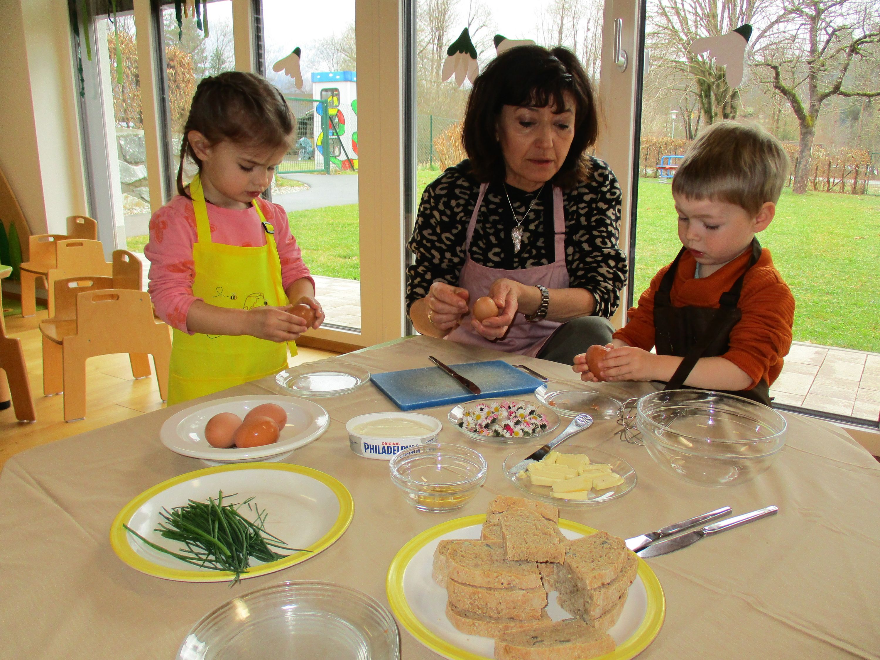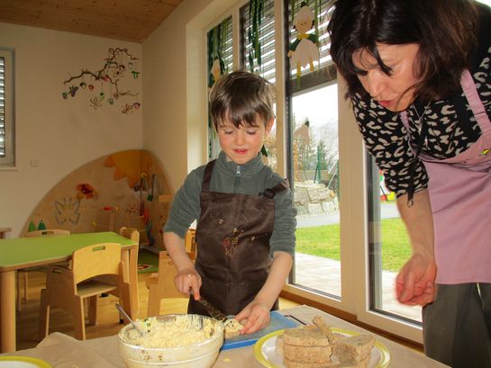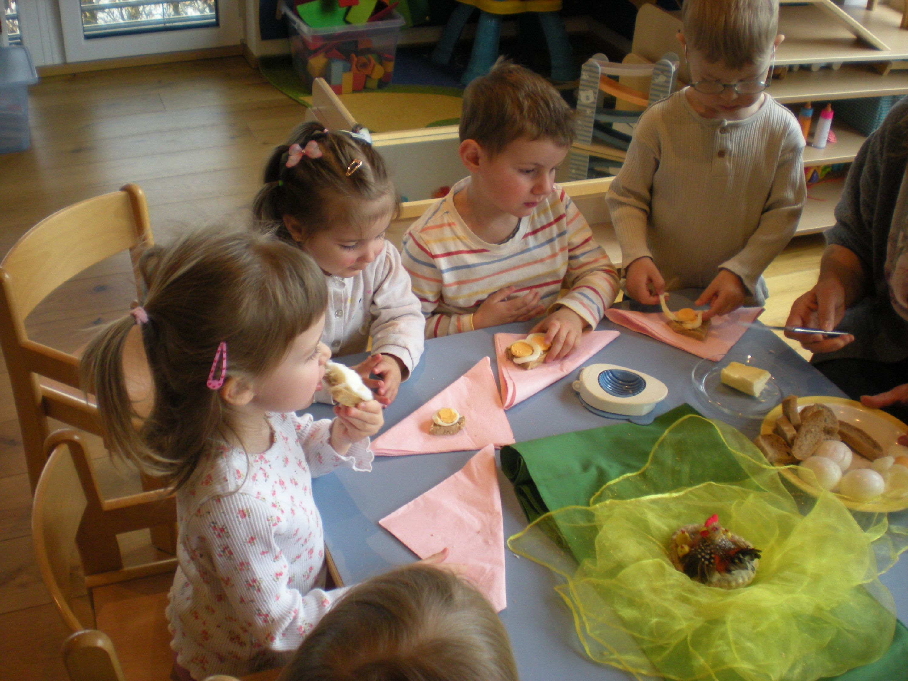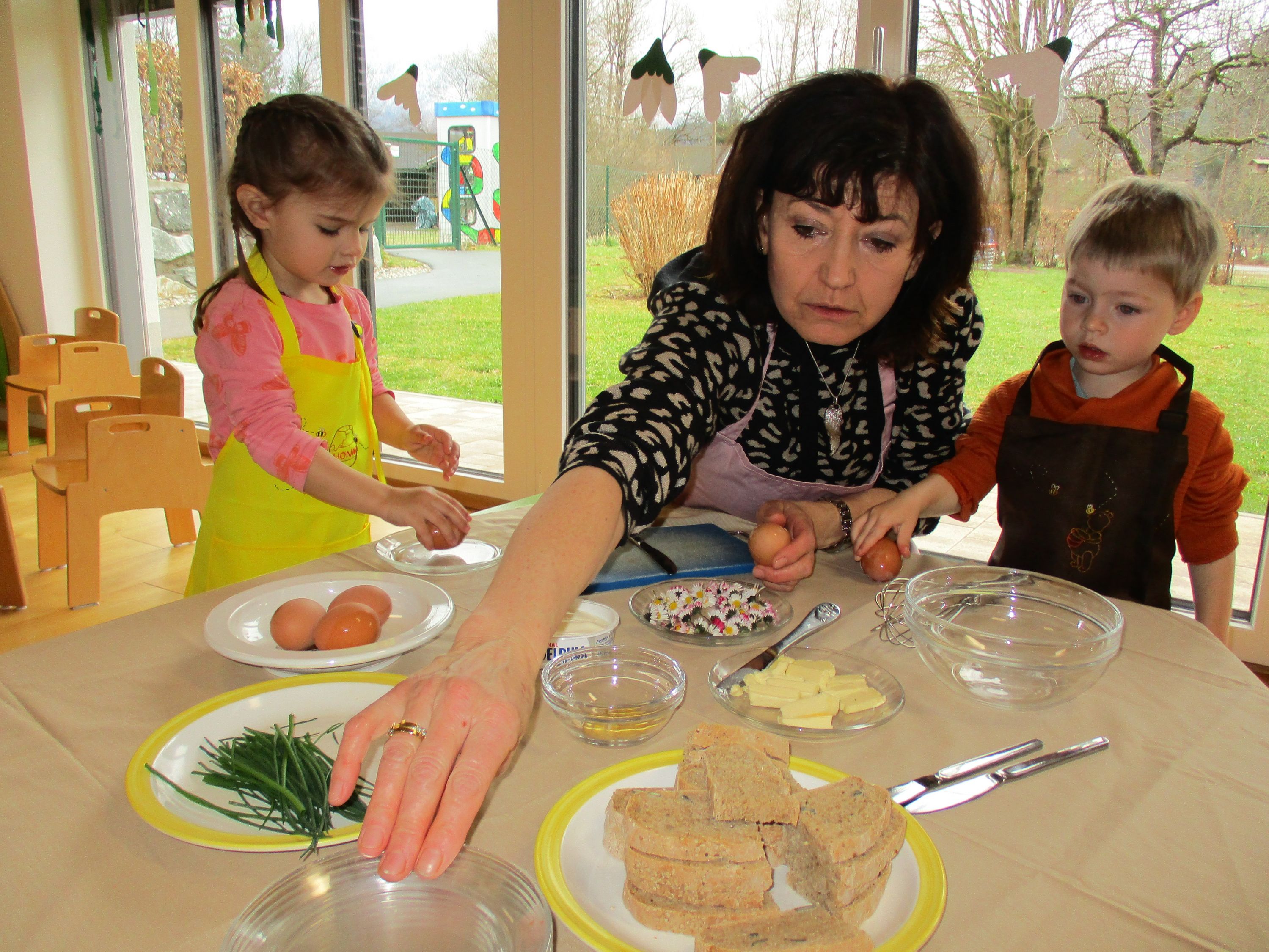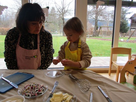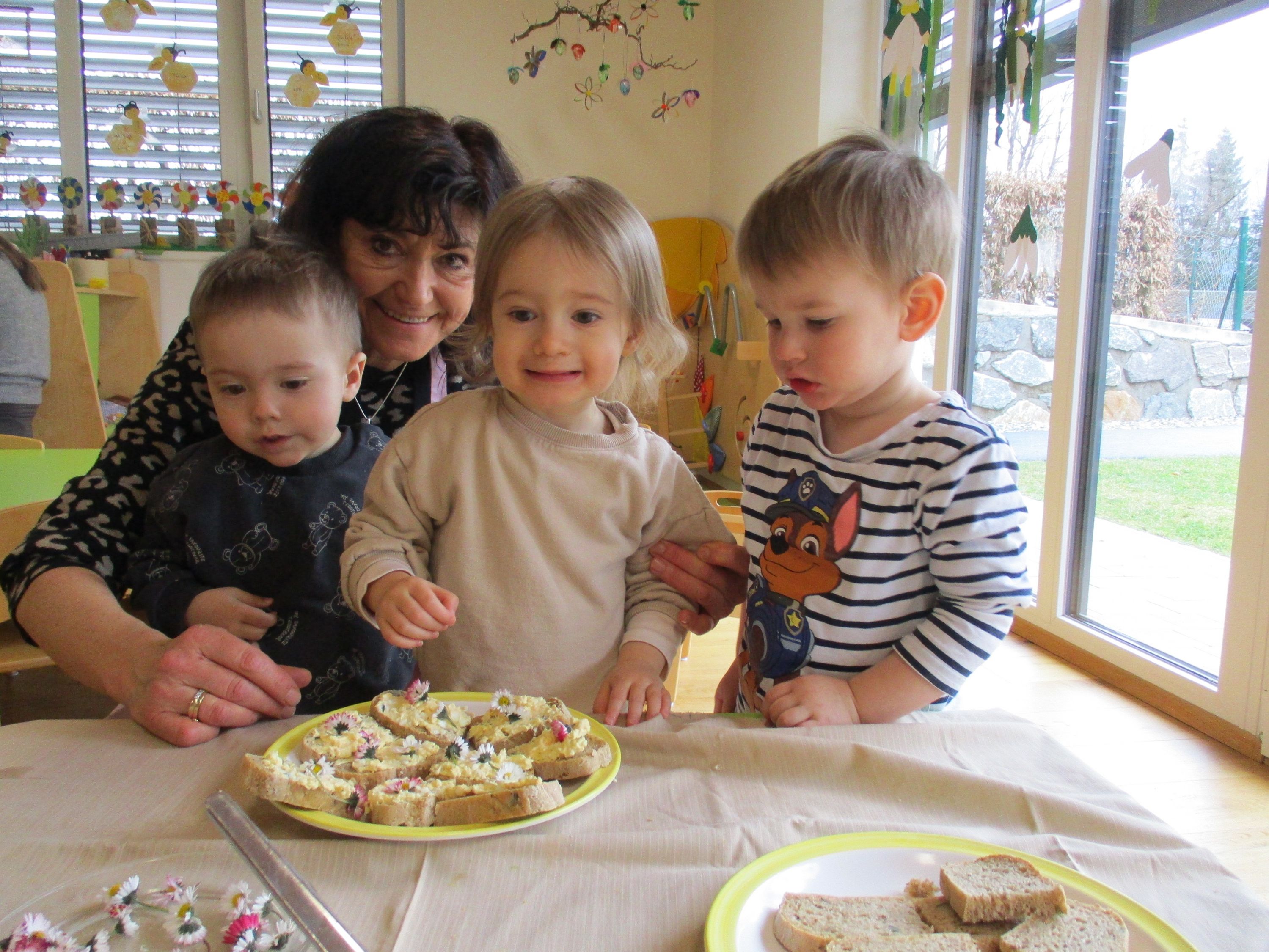 Eieraufstrich mit Gänseblümchen und Butterbrot mit hart gekochtem Ei wurden gemeinsam mit den Kindern zubereitet und verkostet.