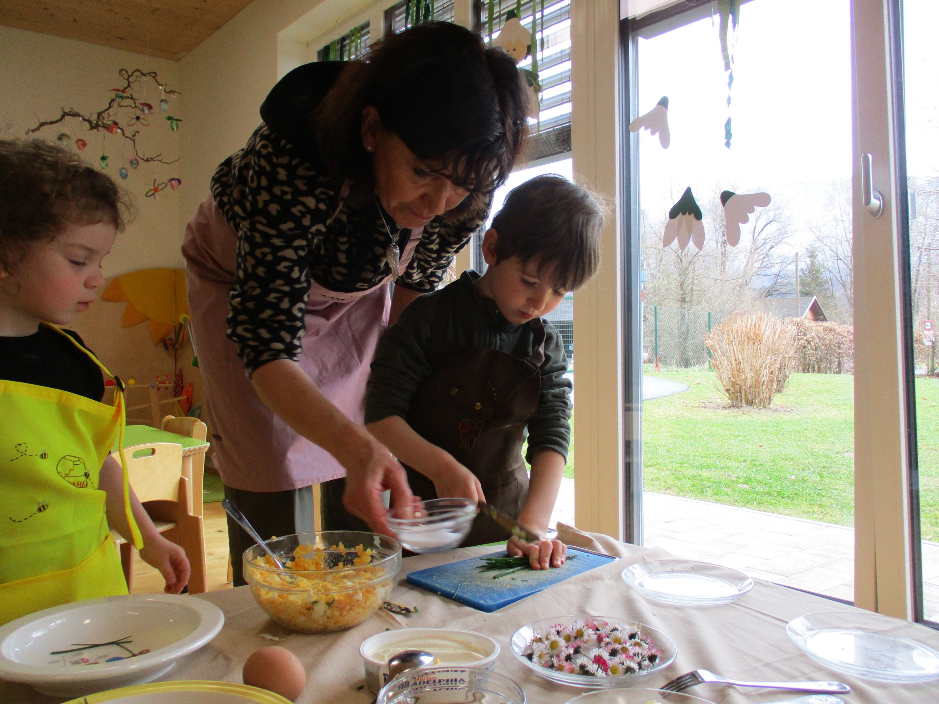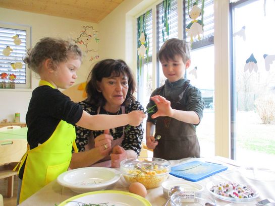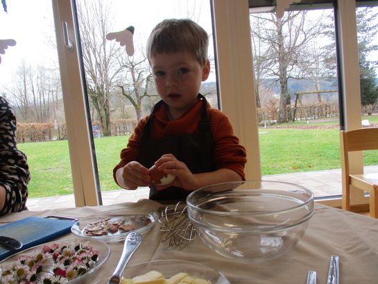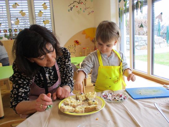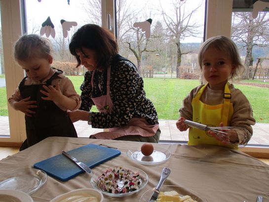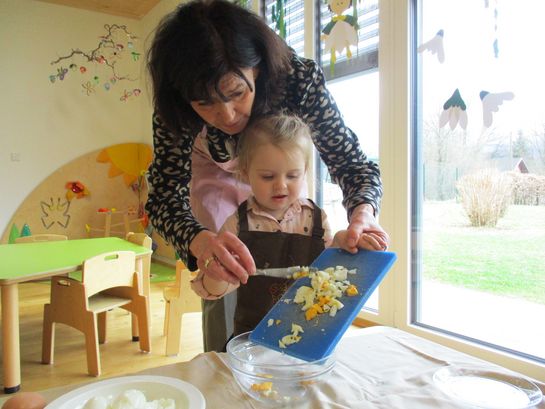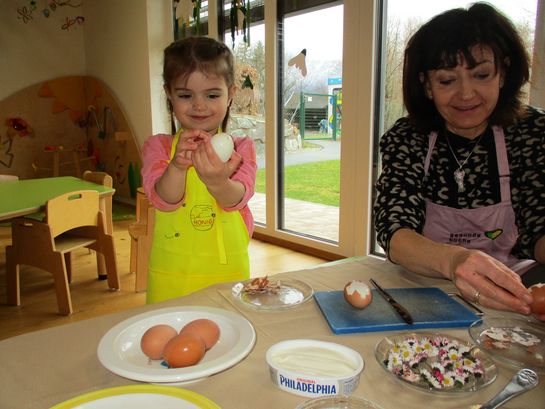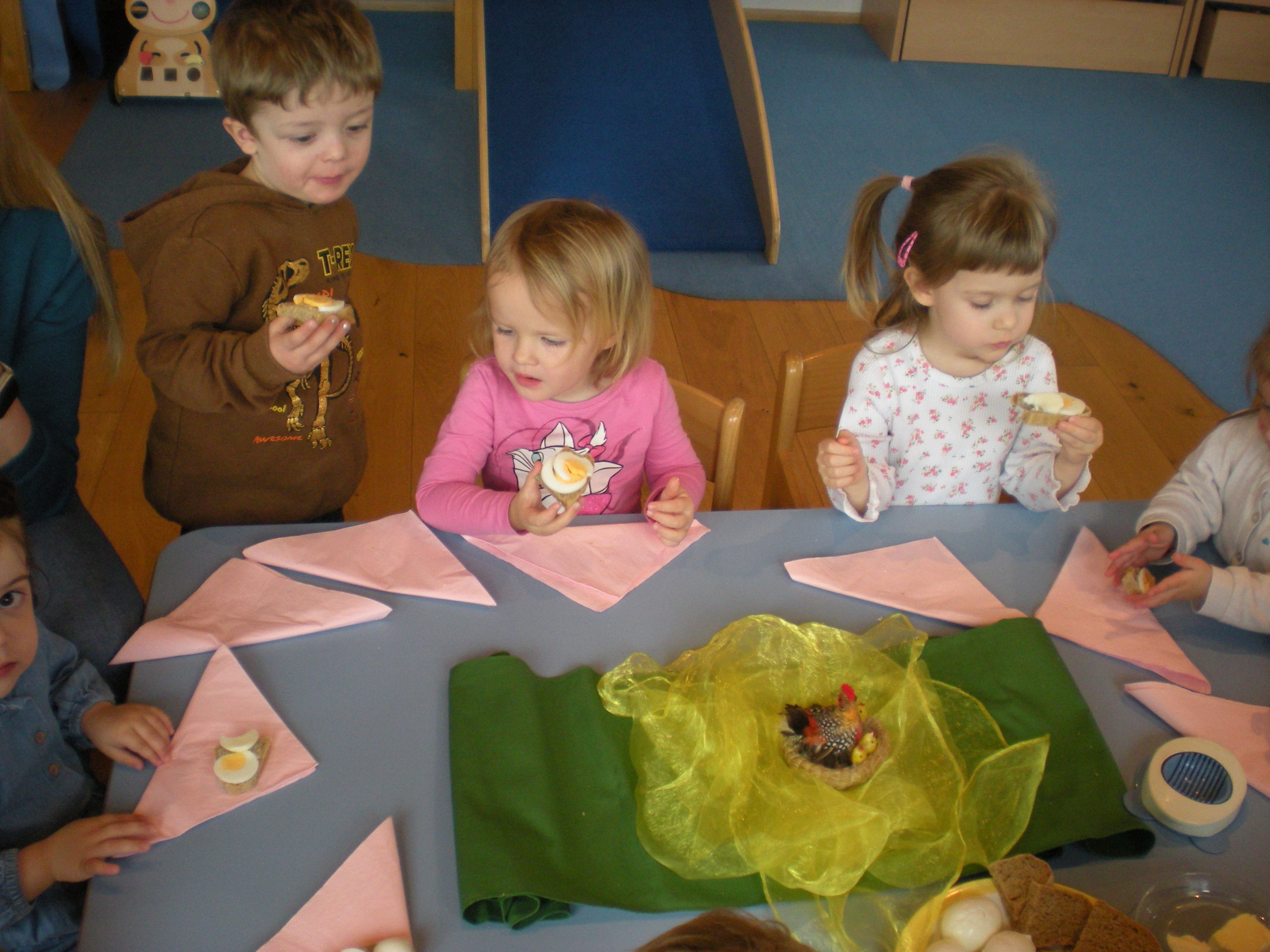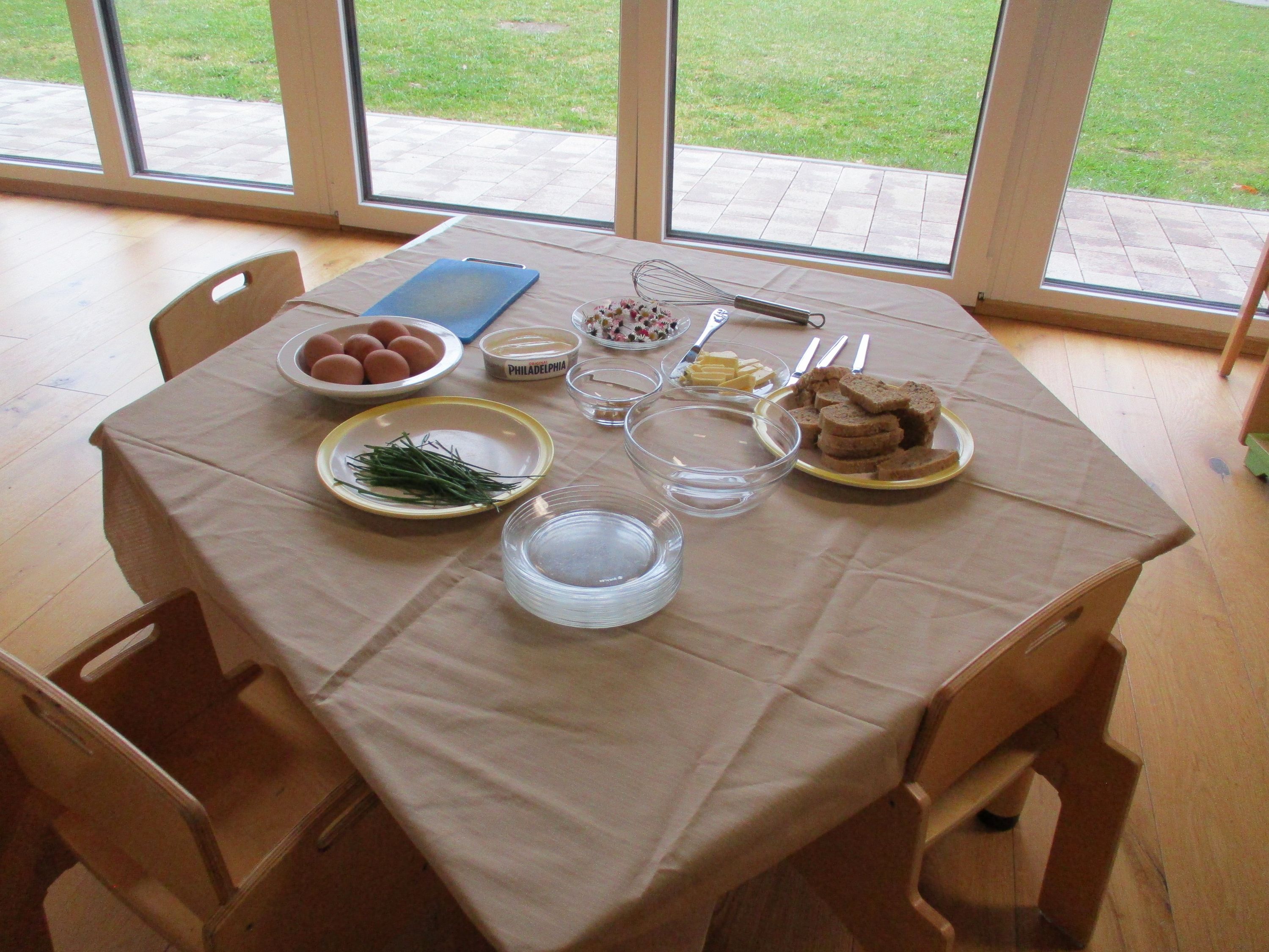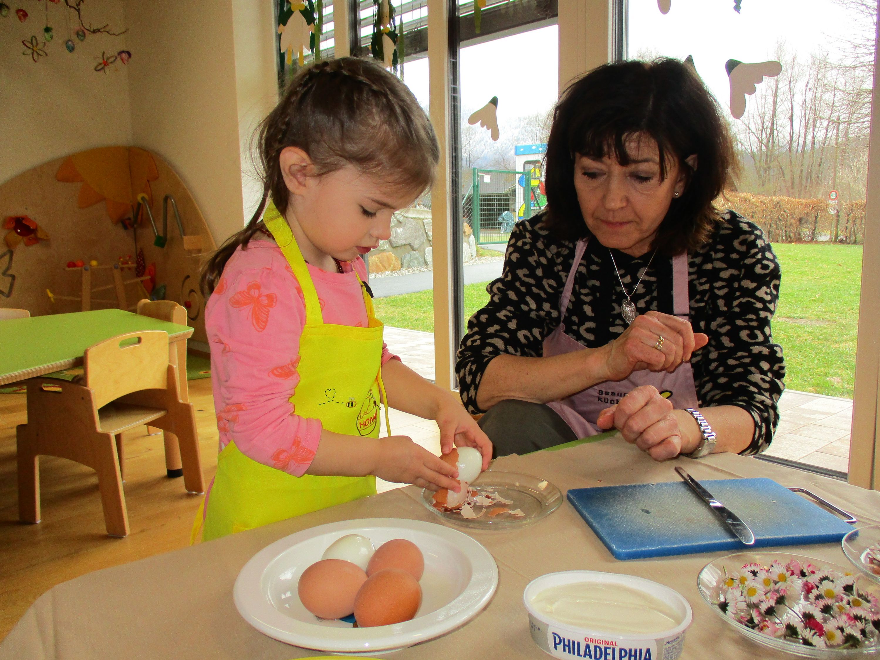 Eieraufstrich mit Gänseblümchen und Butterbrot mit hart gekochtem Ei wurden gemeinsam mit den Kindern zubereitet und verkostet.