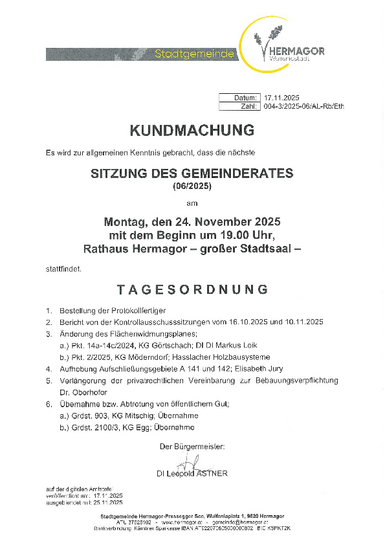 Die nächste Sitzung des Gemeinderates findet am Montag, den 24. November 2025 statt.