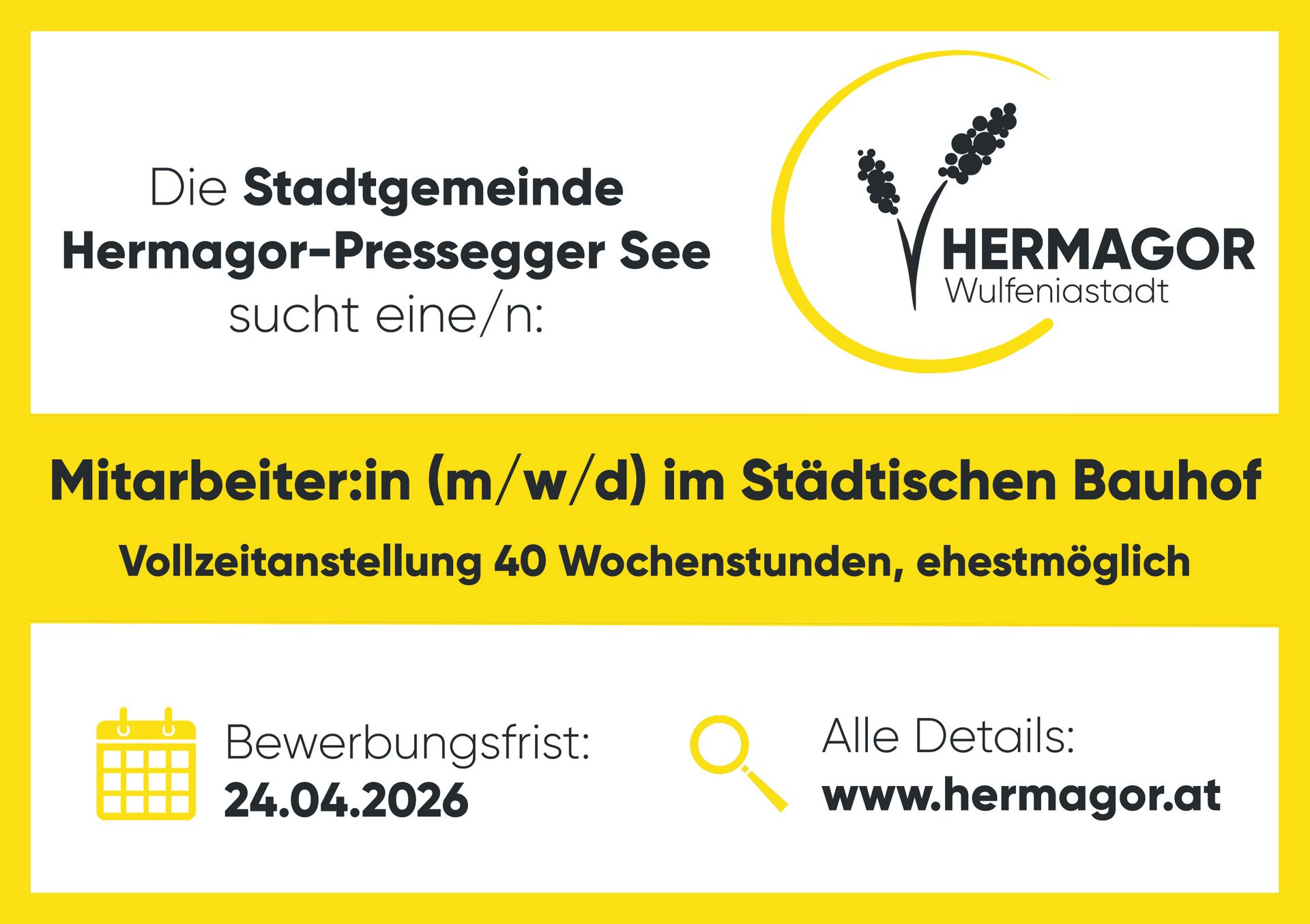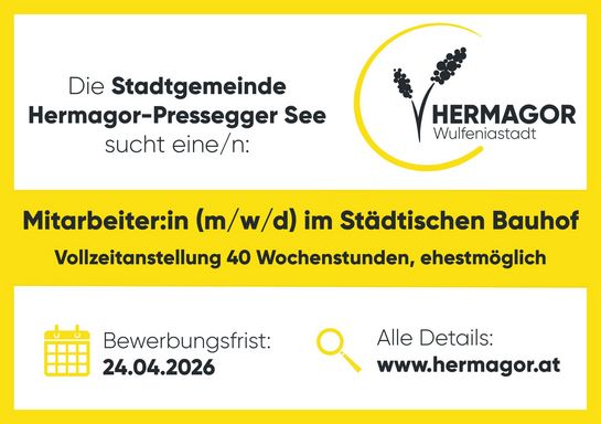 Wenn Sie an dieser Stelle interessiert sind, reichen Sie Ihre Bewerbungsunterlagen (Anschreiben, Lebenslauf, Zeugnisse, Kopie des Führerscheins) bis zum 24. April 2026 ein. Senden Sie diese an die Stadtgemeinde Hermagor-Pressegger See (9620 Hermagor, Wulfeniaplatz 1) oder per E-Mail an bernhard.resch@hermagor.at.