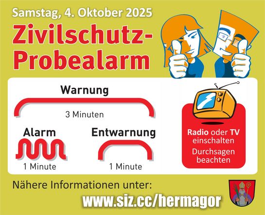 Am Samstag, den 4. Oktober findet der diesjährige Zivilschutz Probealarm zwischen 12:00 und 13:00 Uhr statt.