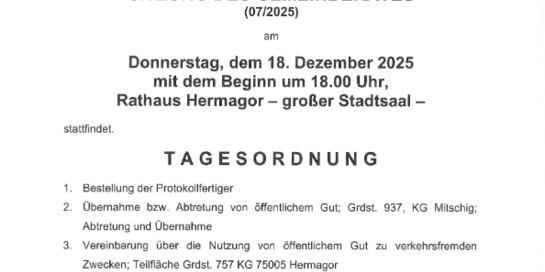 Die nächste Sitzung des Gemeinderates findet am Donnerstag, dem 18. Dezember 2025, mit dem Beginn um 18:00 Uhr im Stadtsaal Hermagor statt.