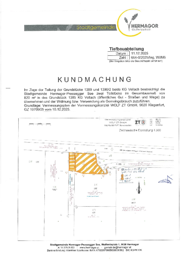 Im Zuge der Teilung der Grundstücke 1389 und 1390/2 beide KG Vellach beabsichtigt die Stadtgemeinde Hermagor-Pressegger See zwei Teilstücke im…