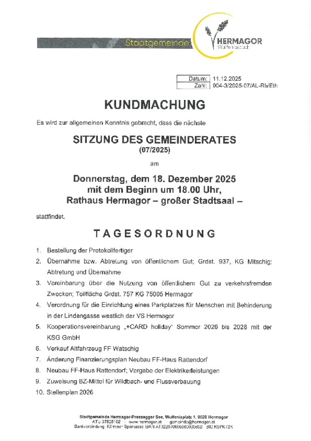 Es wird zur allgemeinen Kenntnis gebracht, dass die nächste Sitzung des Gemeinderates am Donnerstag, dem 18. Dezember 2025, stattfindet.