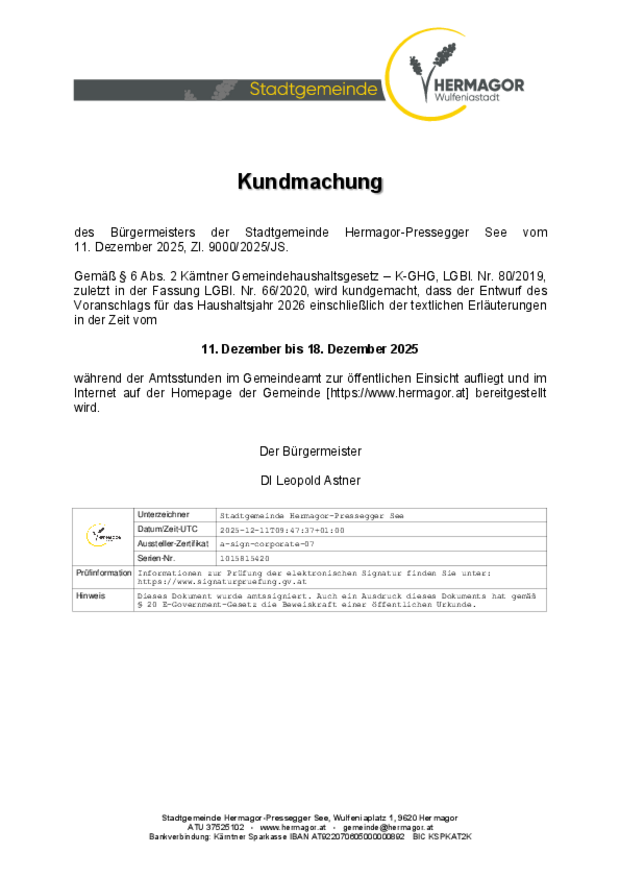 Entwurf des Voranschlages für das Haushaltsjahr 2026.