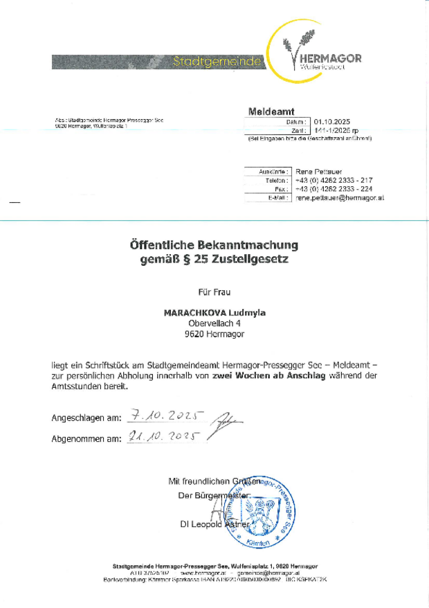 Öffentliche Bekanntmachung gemäß § 25 Zustellgesetz