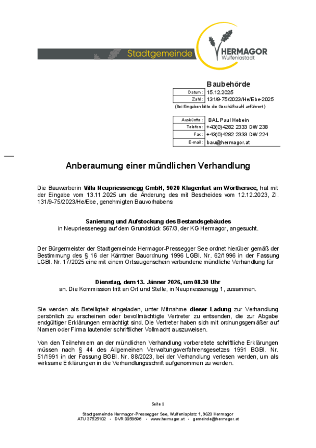Im Zuge der Teilung der Grundstücke 1389 und 1390/2 beide KG Vellach beabsichtigt die Stadtgemeinde Hermagor-Pressegger See zwei Teilstücke im…