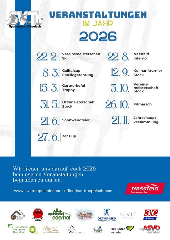 Wenn Ihre Veranstaltung auf unserer Homepage erscheinen soll, bitten wir Sie, uns ein E-Mail an gaby.zerza@hermagor.at zu senden. Senden Sie bitte folgende Informationen mit - ansonsten kann die Veranstaltung nicht erstellt werden: Titel der Veranstaltung, Datum mit Uhrzeit, Infotext und ein Foto.