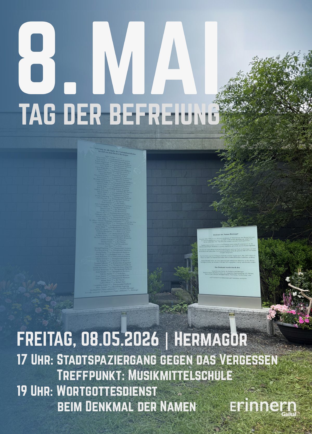 Der Verein Erinnern Gailtal lädt am Tag der Befreiung vom Nationalsozialismus, dem 8. Mai, zu einer gemeinsamen Gedenkveranstaltung. Los geht es mit einem "Stadtspaziergang gegen das Vergessen" um 17:00 Uhr, gefolgt von einem gemeinsamen, feierlichen Wortgottesdienst beim Denkmal der Namen in Hermagor zum Gedenken an die Gailtaler Opfer des NS-Terrors.