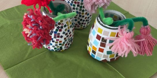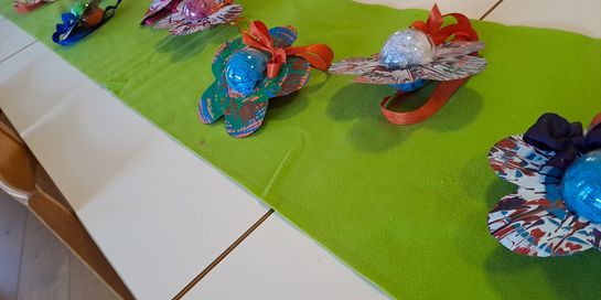Mit selbstgemachten Blumen suchten wir heute rund um den Kindergarten den Frühling.