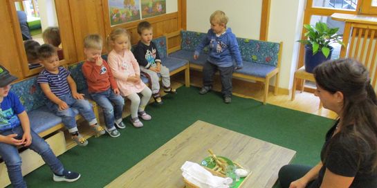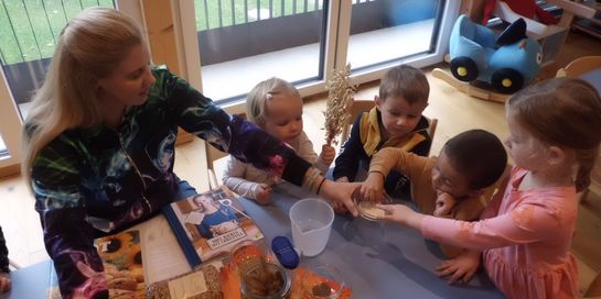 In der Mäusegruppe wurde über Getreidesorten und den Weg vom Korn zum Brot gesprochen. Mit viel Freude wurde Brot gebacken und mit Butter verkostet.