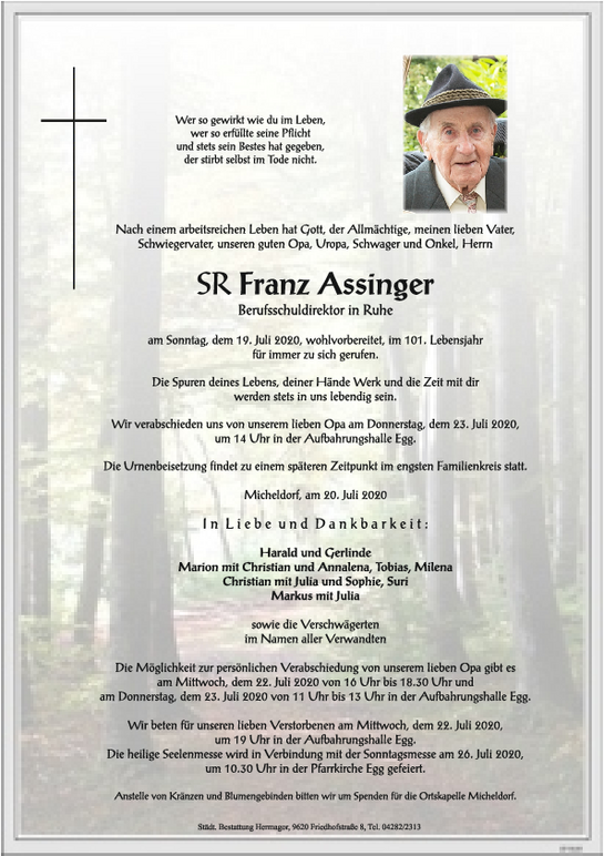 Gebet: Dienstag, 21. 7. 2020, um 19 Uhr, Halle Tröpolach, Verabschiedung: Mittwoch, 22. 7. 2020, um 10 Uhr Aufbahrungshalle Tröpolach